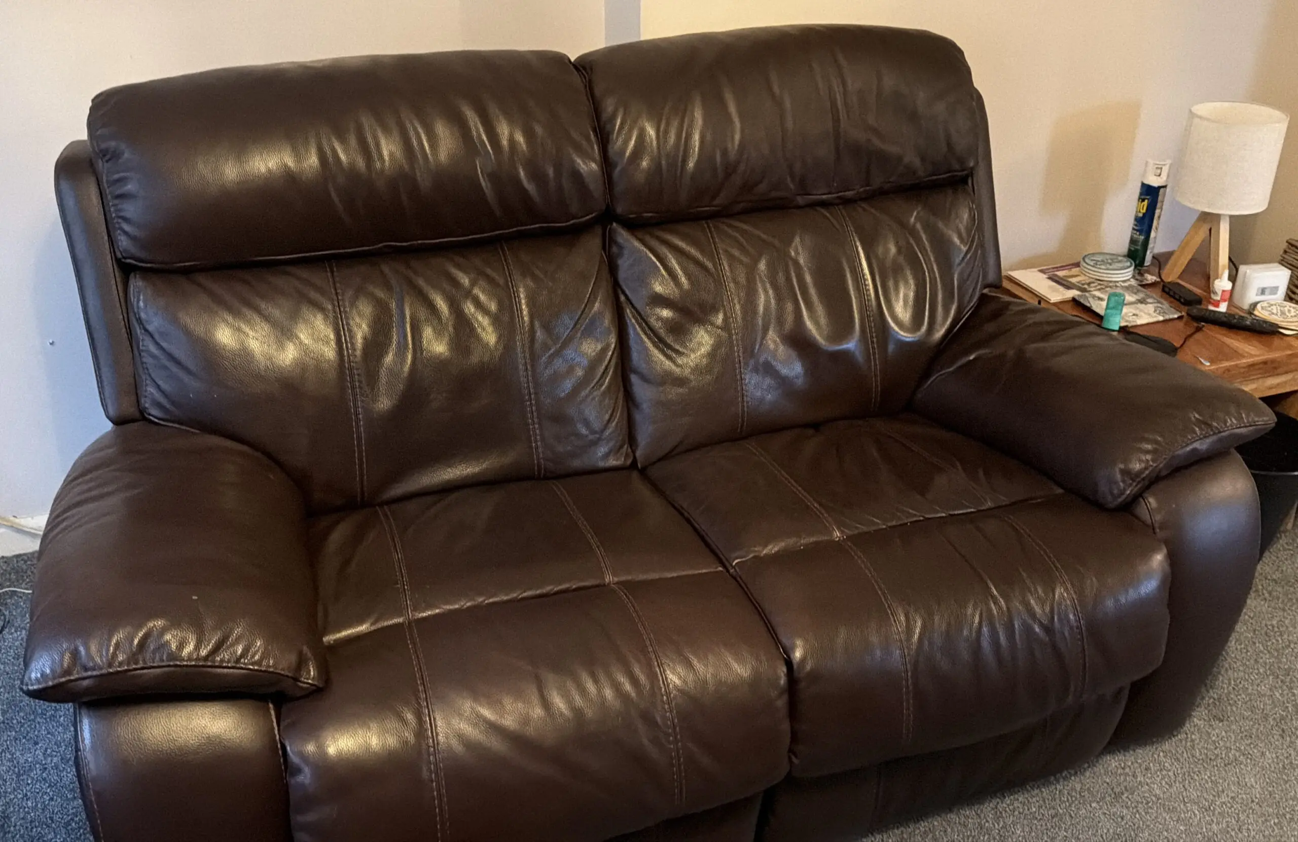 A well maintained electric 2 seater recliner sofa in brown leather. It has general wear and tear for a used sofa but is in excellent working condition