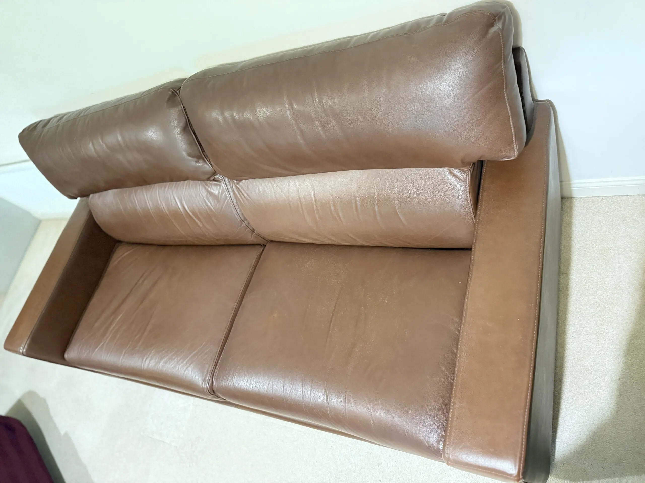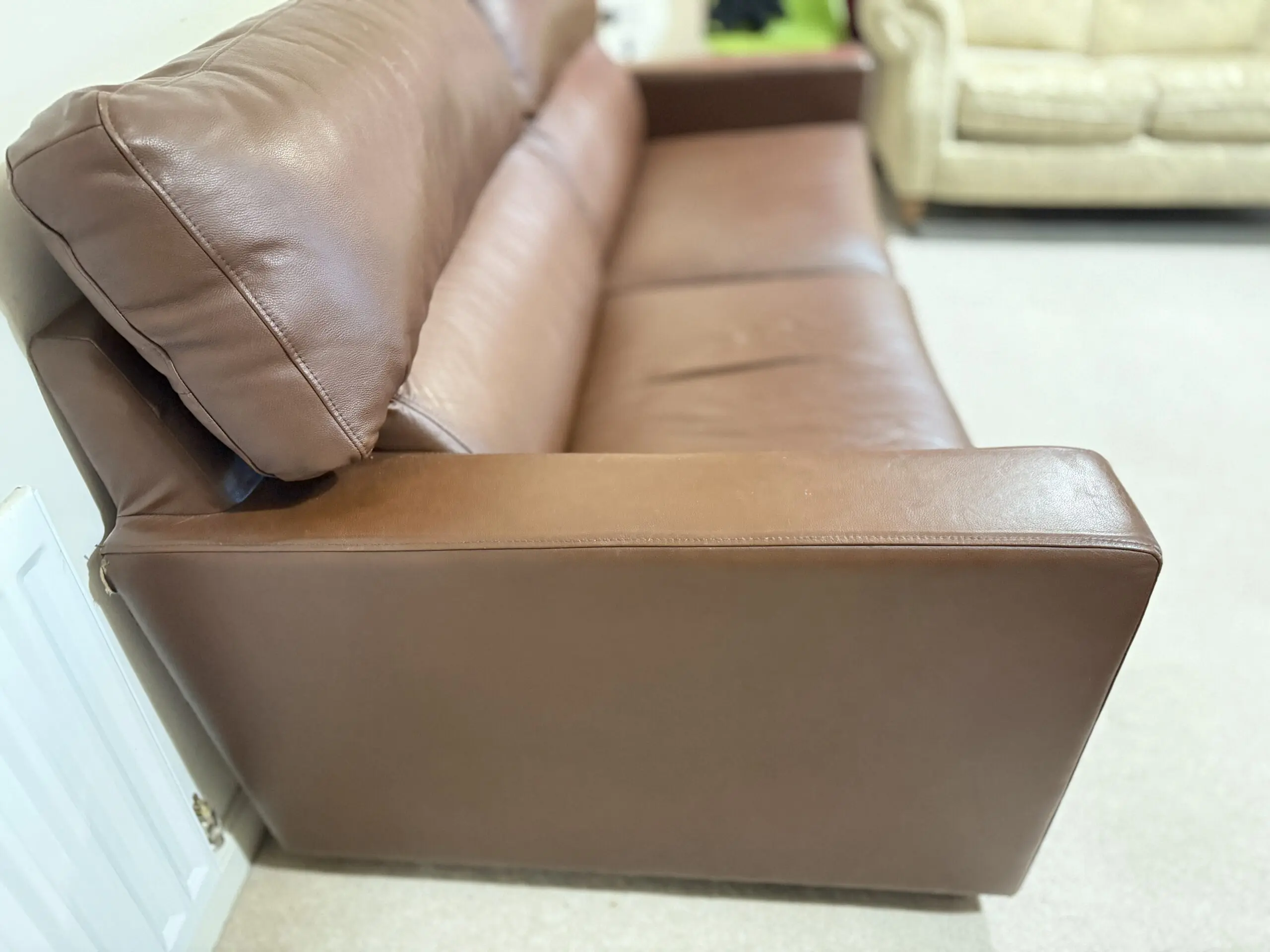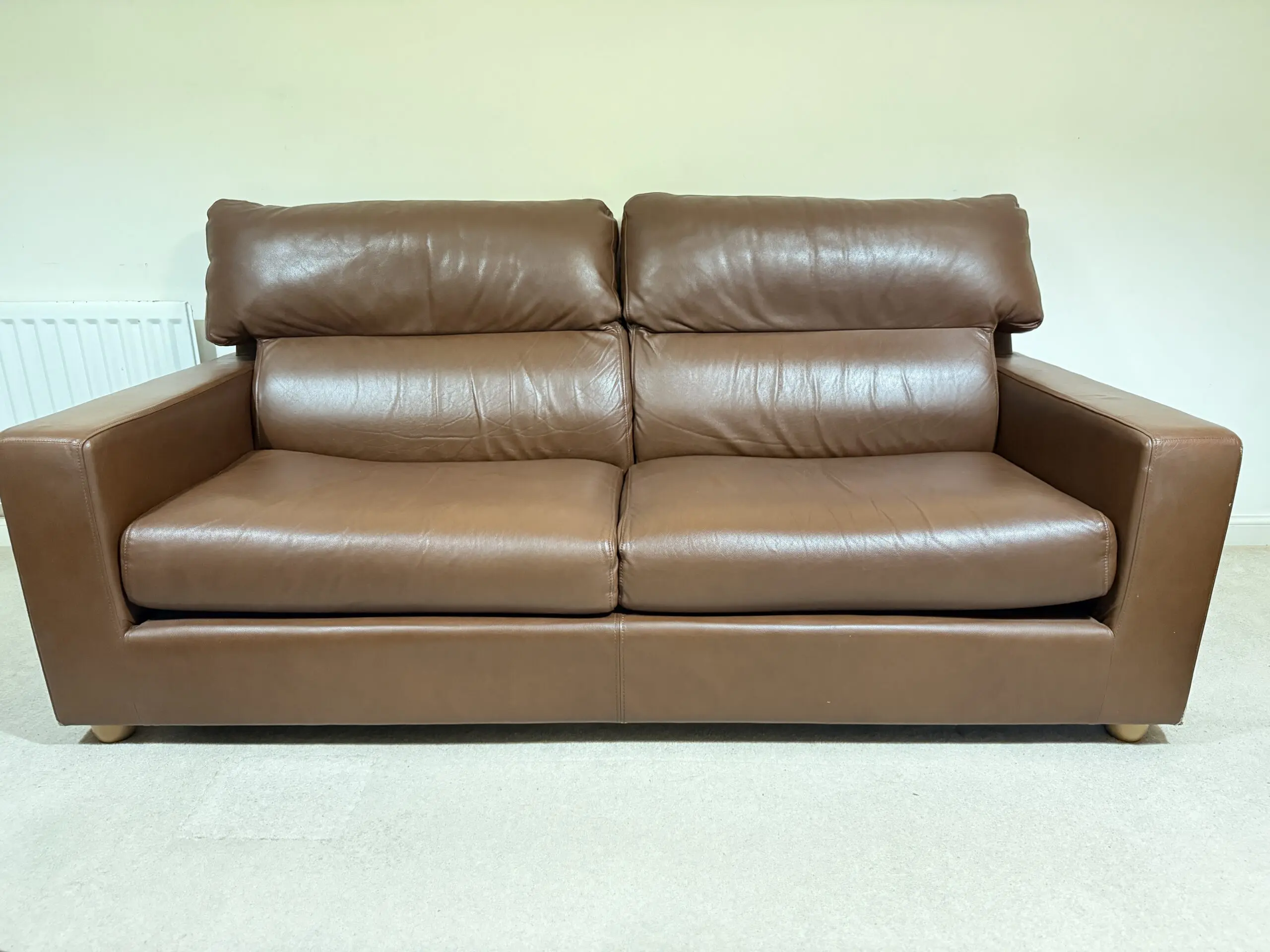 The second sofa is a modern brown leather compact 3-seater with wide arms, deep seats, and high back cushions for excellent comfort. The leather is soft and durable with natural creasing from normal use, giving it a warm, lived-in look.