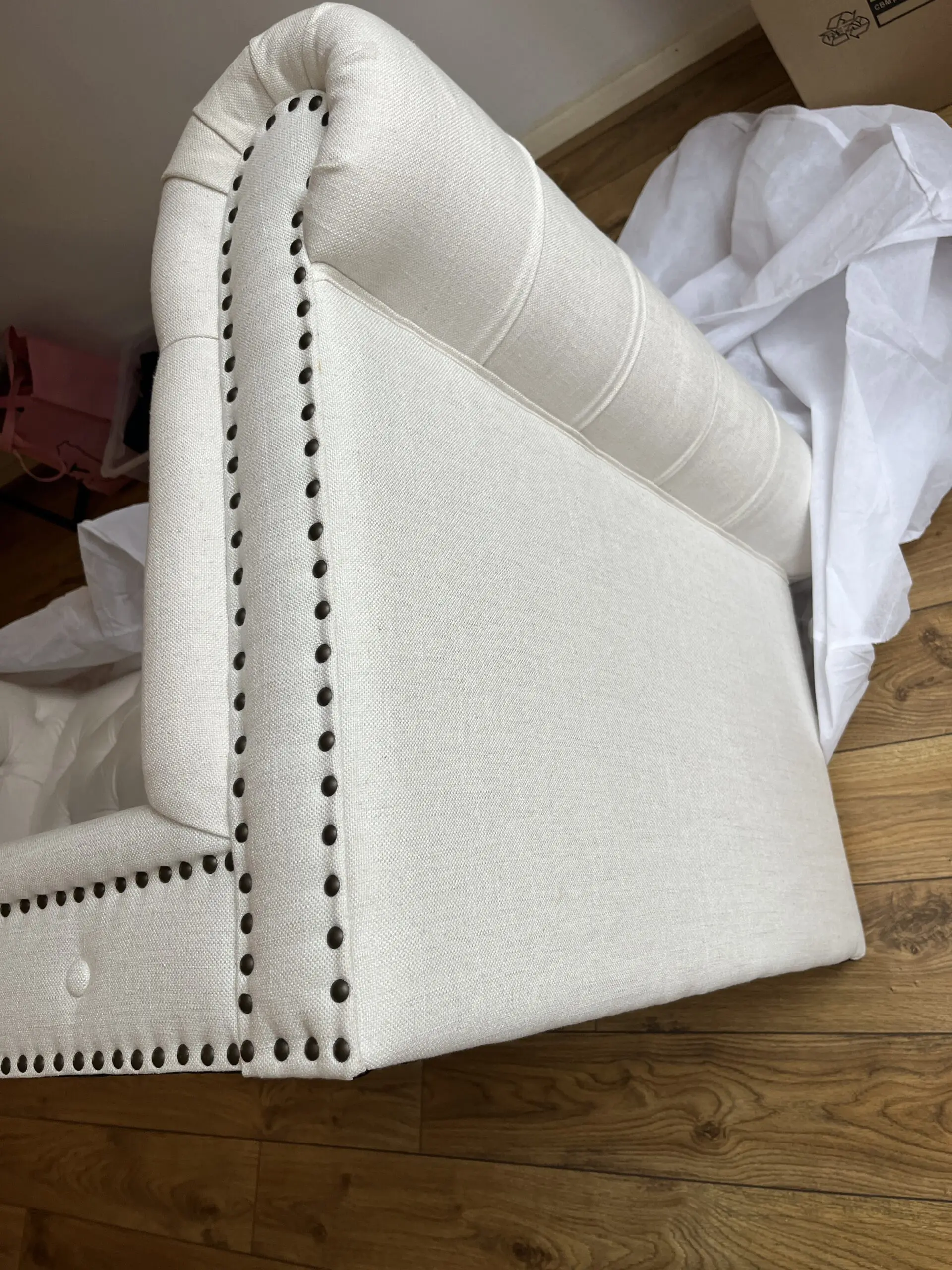 • Upholstered in soft, comfortable fabric with tufted detailing and nailhead trim.