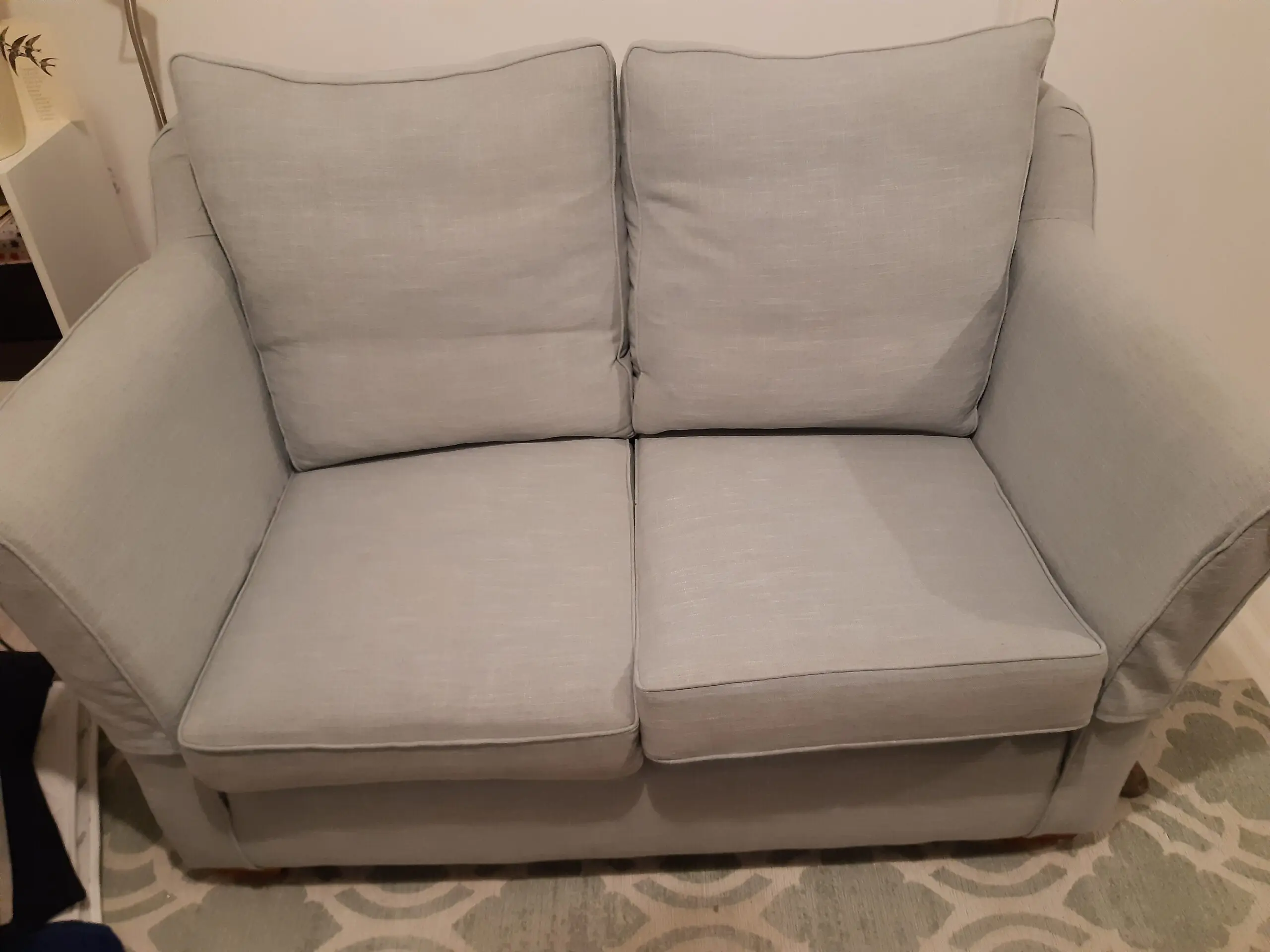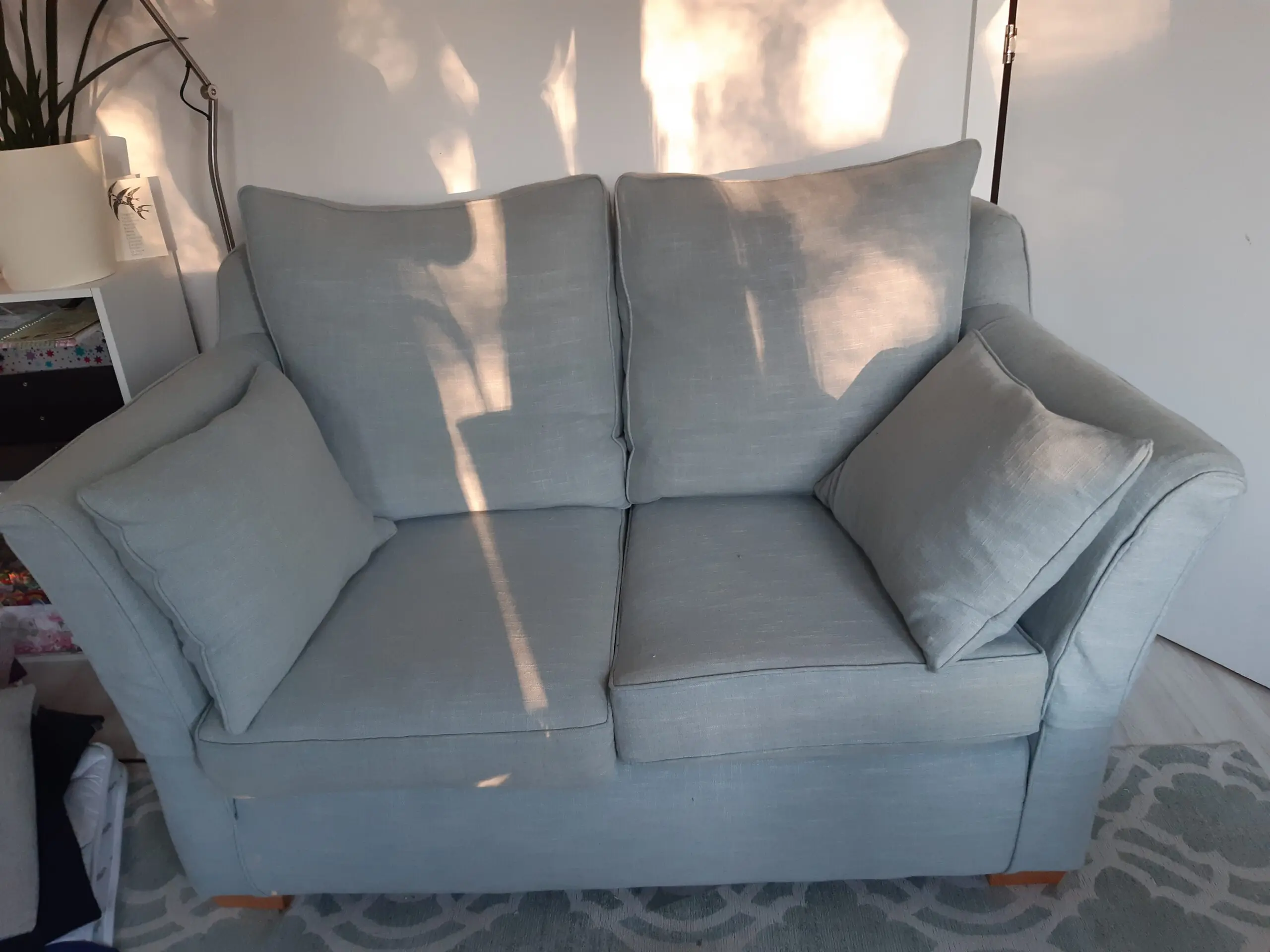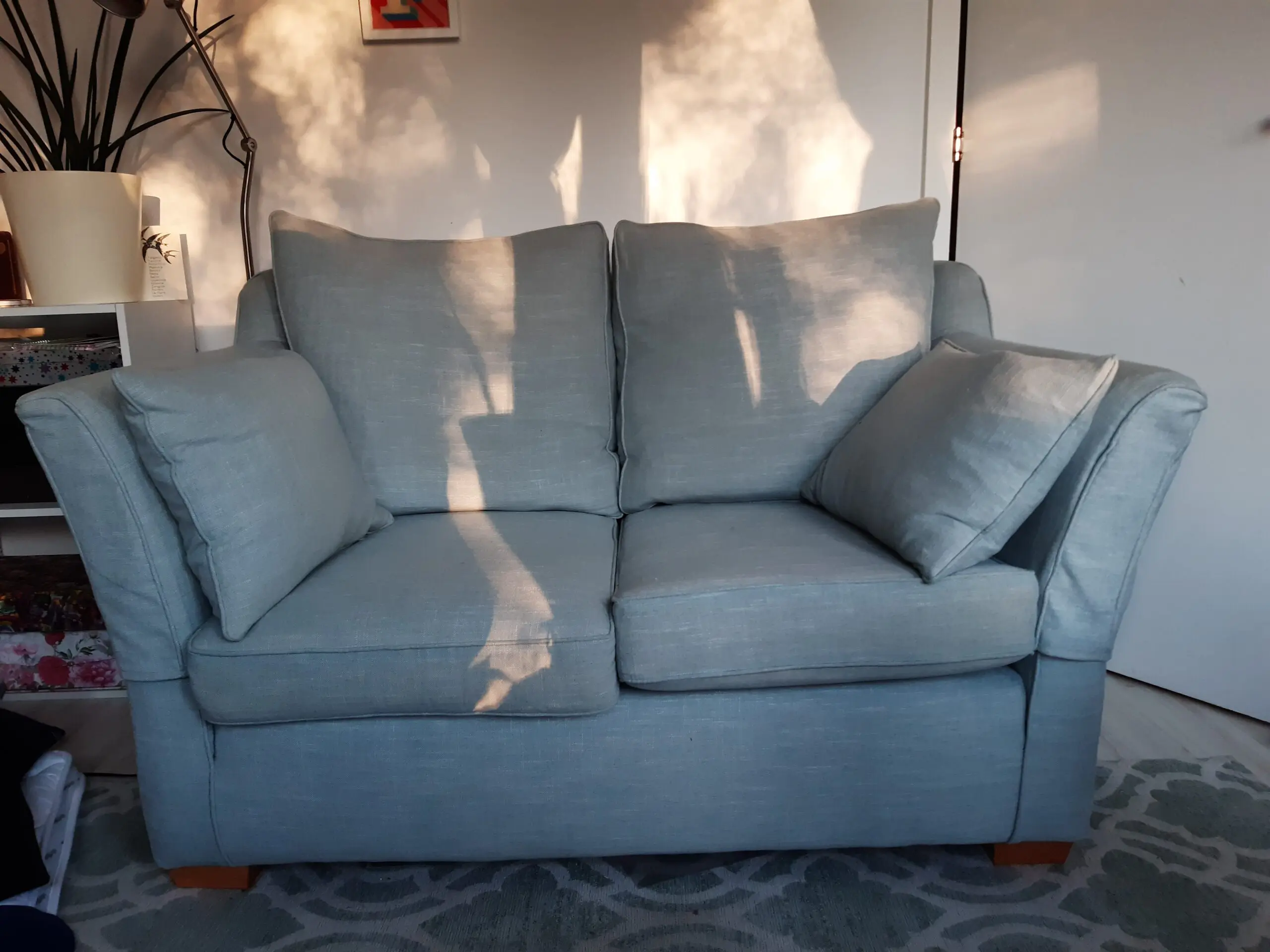 Two seater small sofa by Multiyork. Ludlow and Lydney model. Very comfortable and in good condition. Comes with two matching cushions and arm covers. Photos do not capture colour well unfortunately but it’s a lovely duck egg blue green. 10 years old but very well looked after. All covers are removable and have zips. Smoke and pet free home. No longer needed.