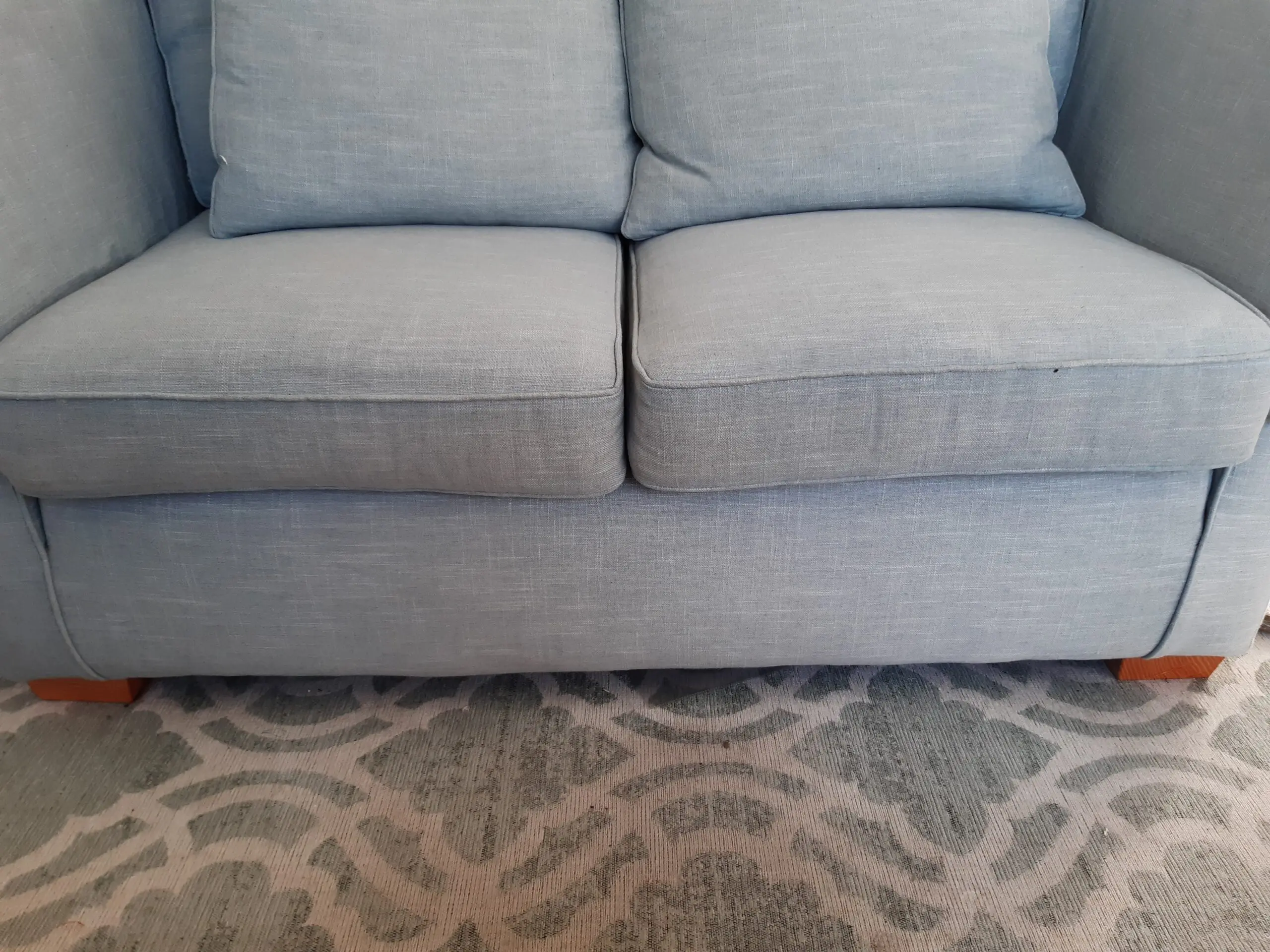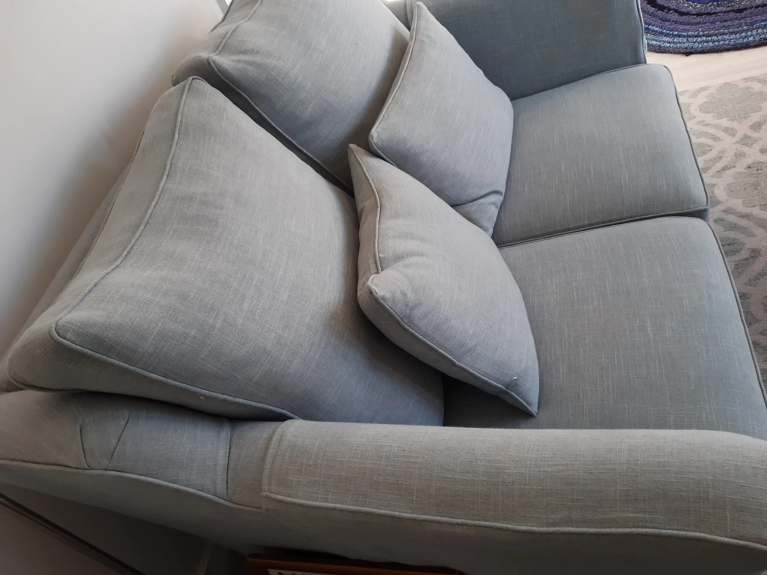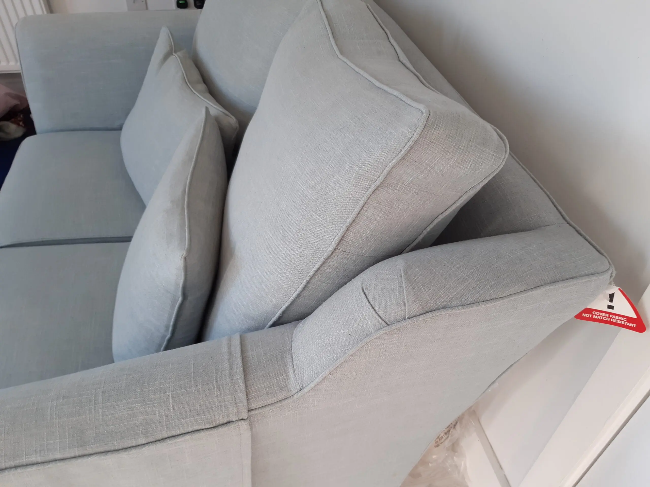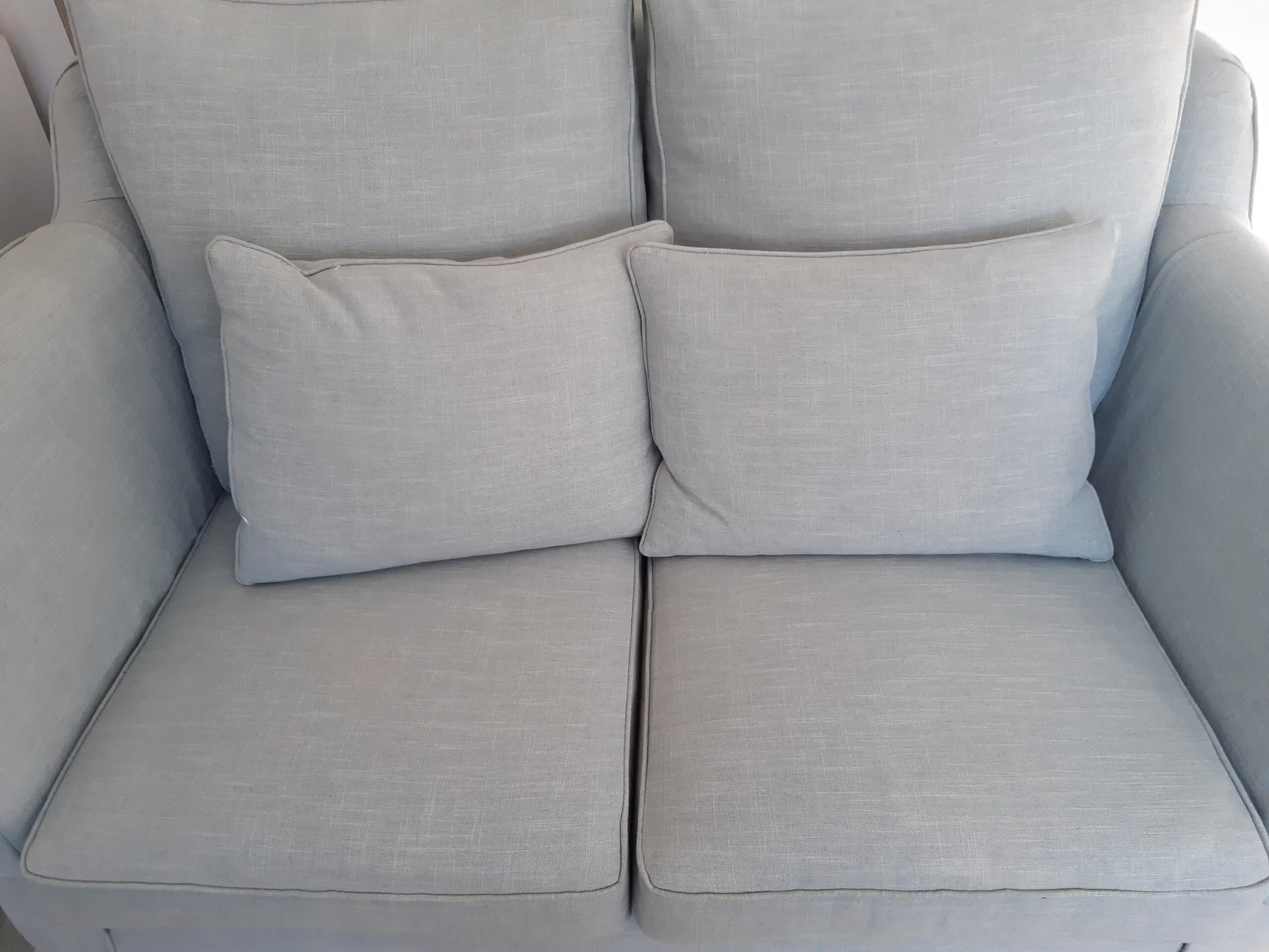 Two seater small sofa by Multiyork. Ludlow and Lydney model. Very comfortable and in good condition. Comes with two matching cushions and arm covers. Photos do not capture colour well unfortunately but it’s a lovely duck egg blue green. 10 years old but very well looked after. All covers are removable and have zips. Smoke and pet free home. No longer needed.
