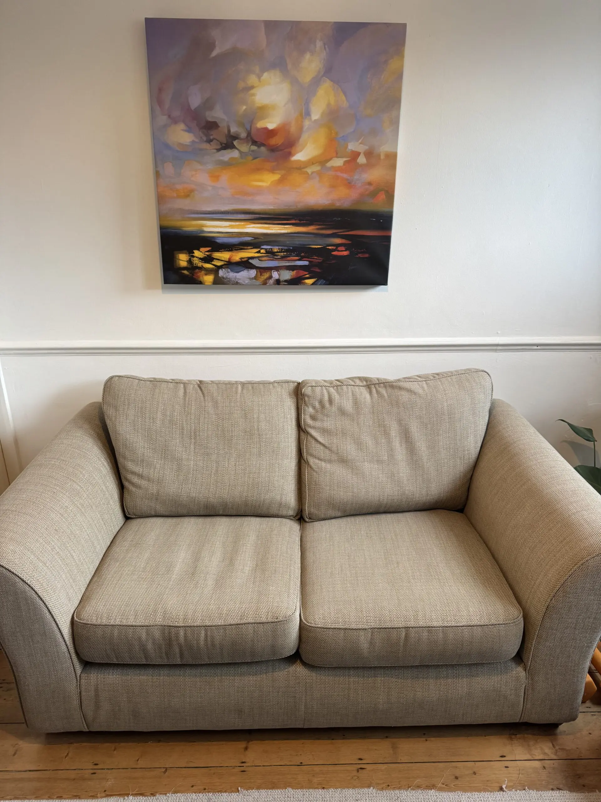 Comfortable 2-seater fabric sofa in a neutral beige colour, perfect for living rooms, flats, or spare rooms.
