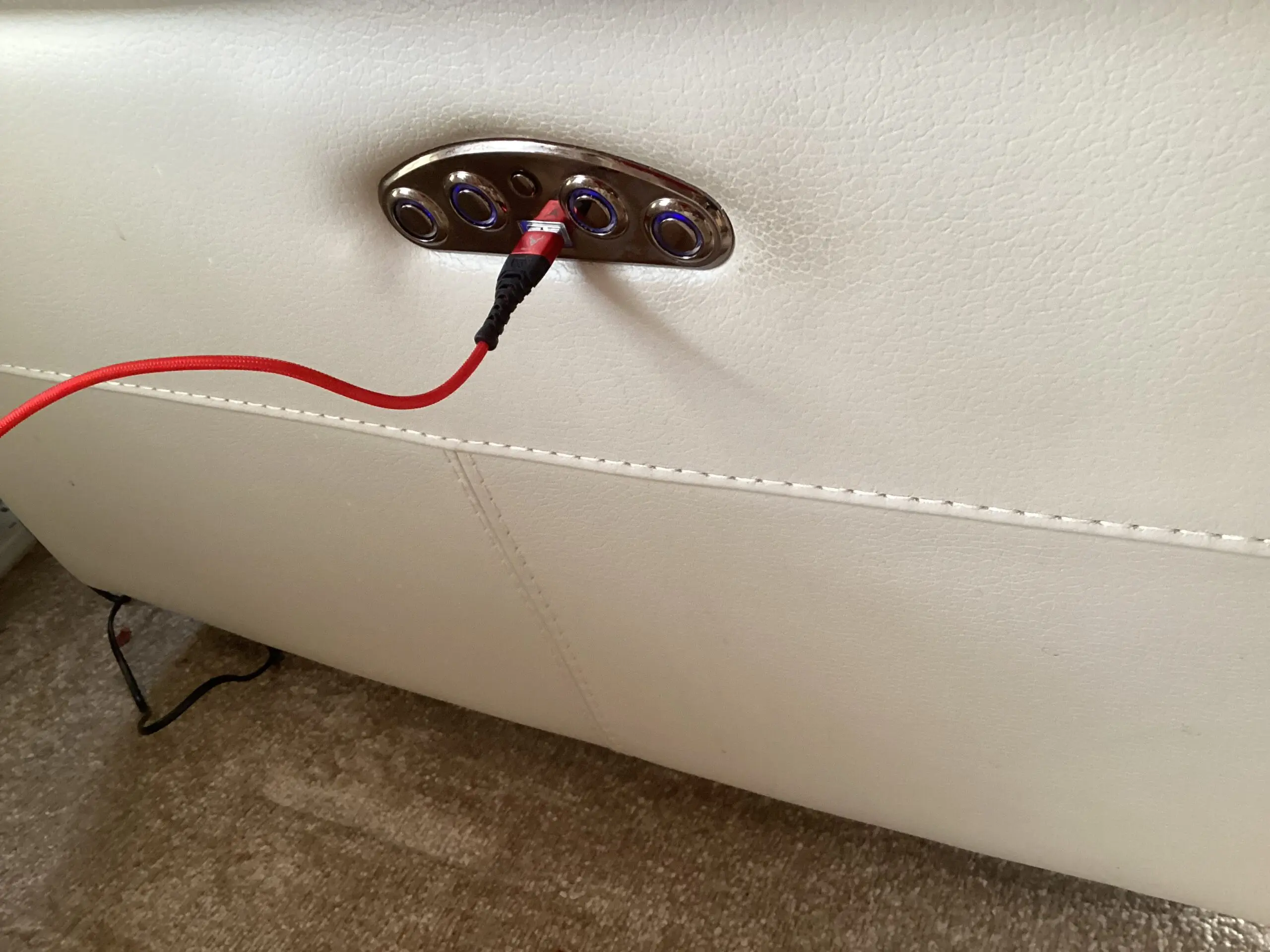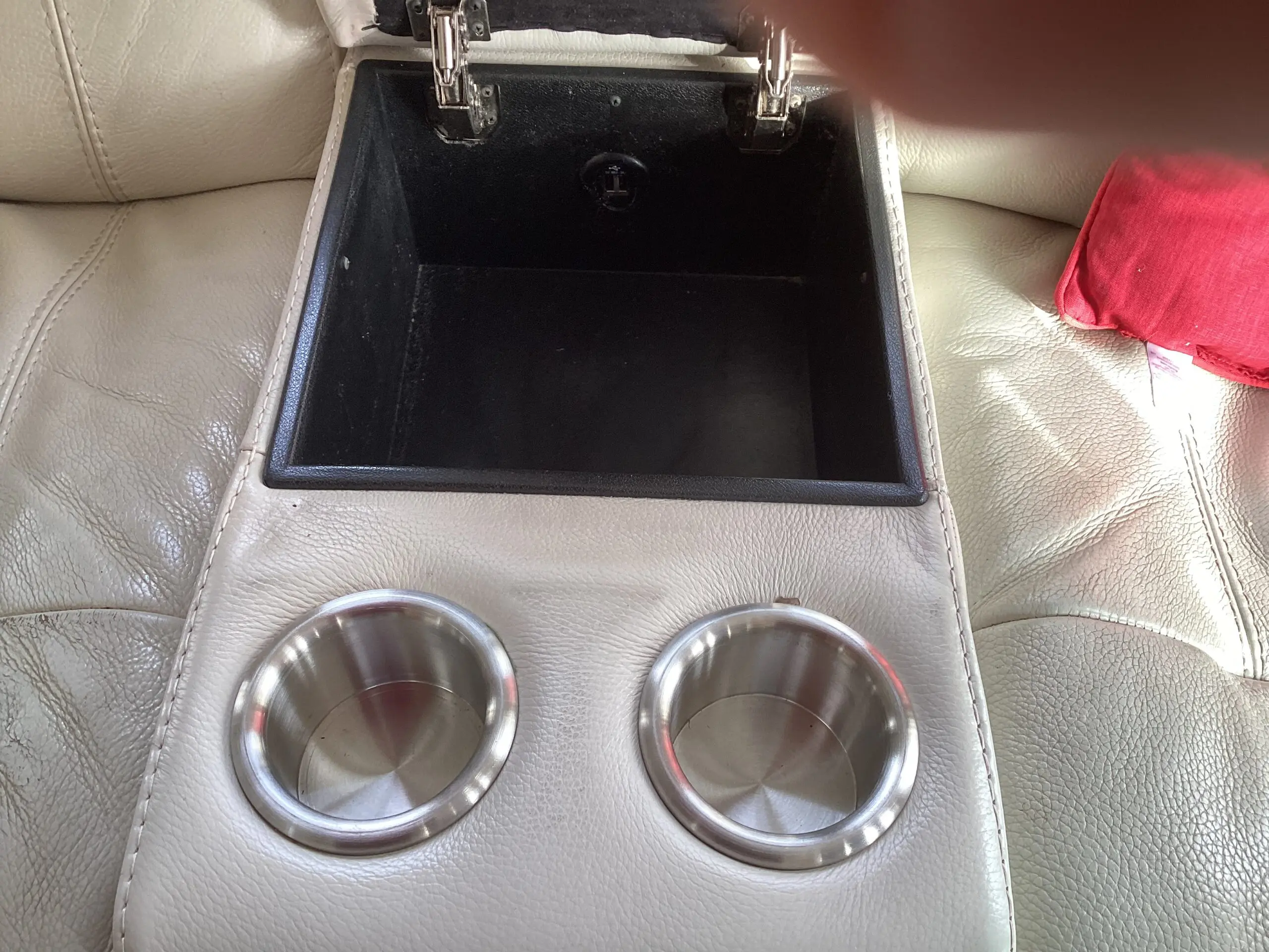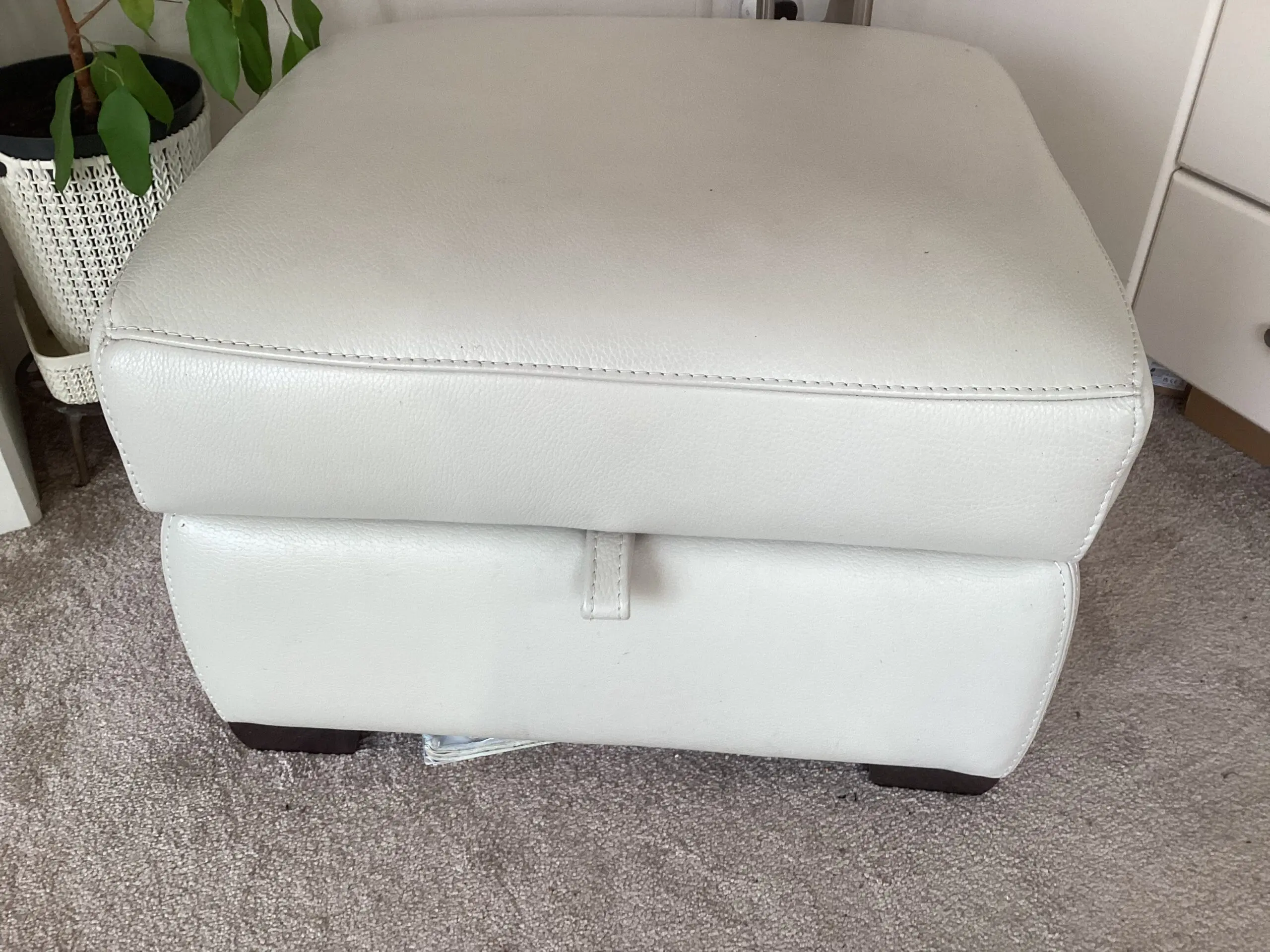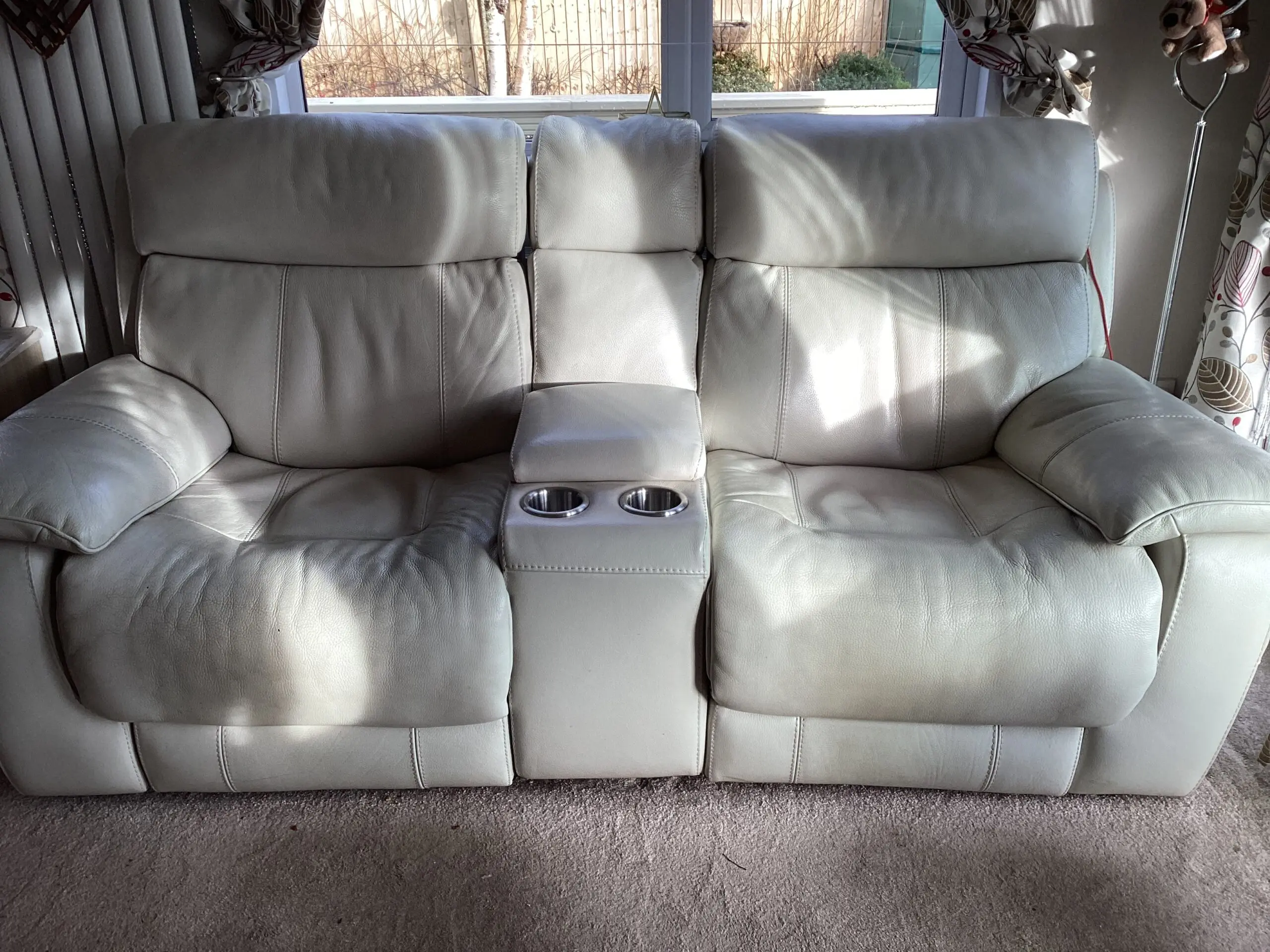 DFS Lucius 2 seater with centre console and storage stool. The suite is a power recliner with USB socket on each side and inside the middle storage unit. This suite is my caravan and is just 5 years old and cost back then £2550.00 new.