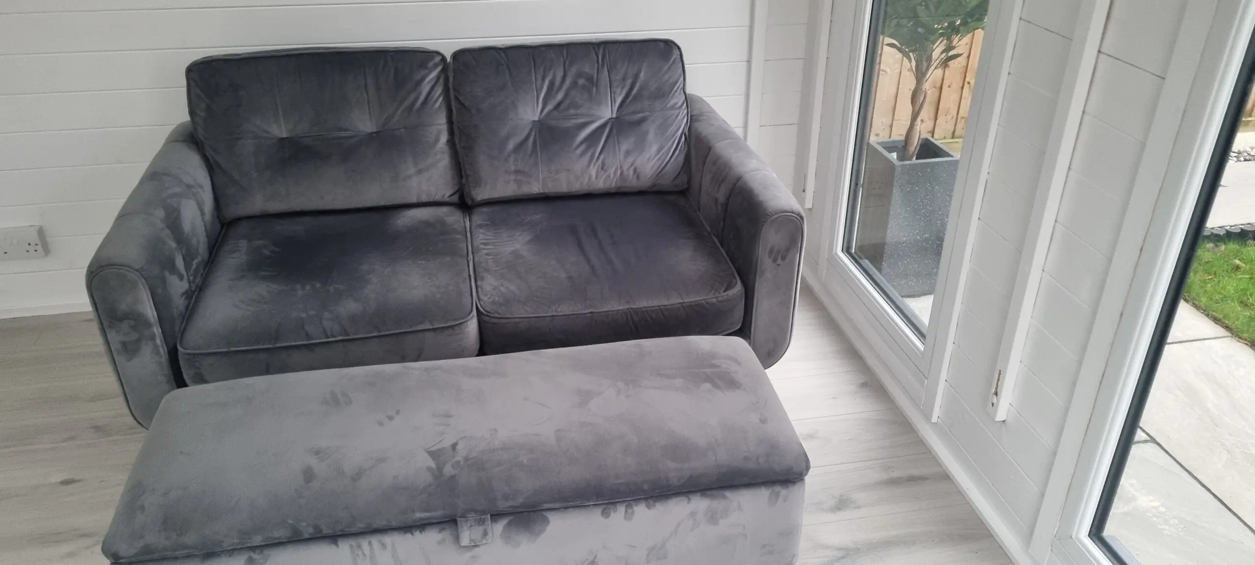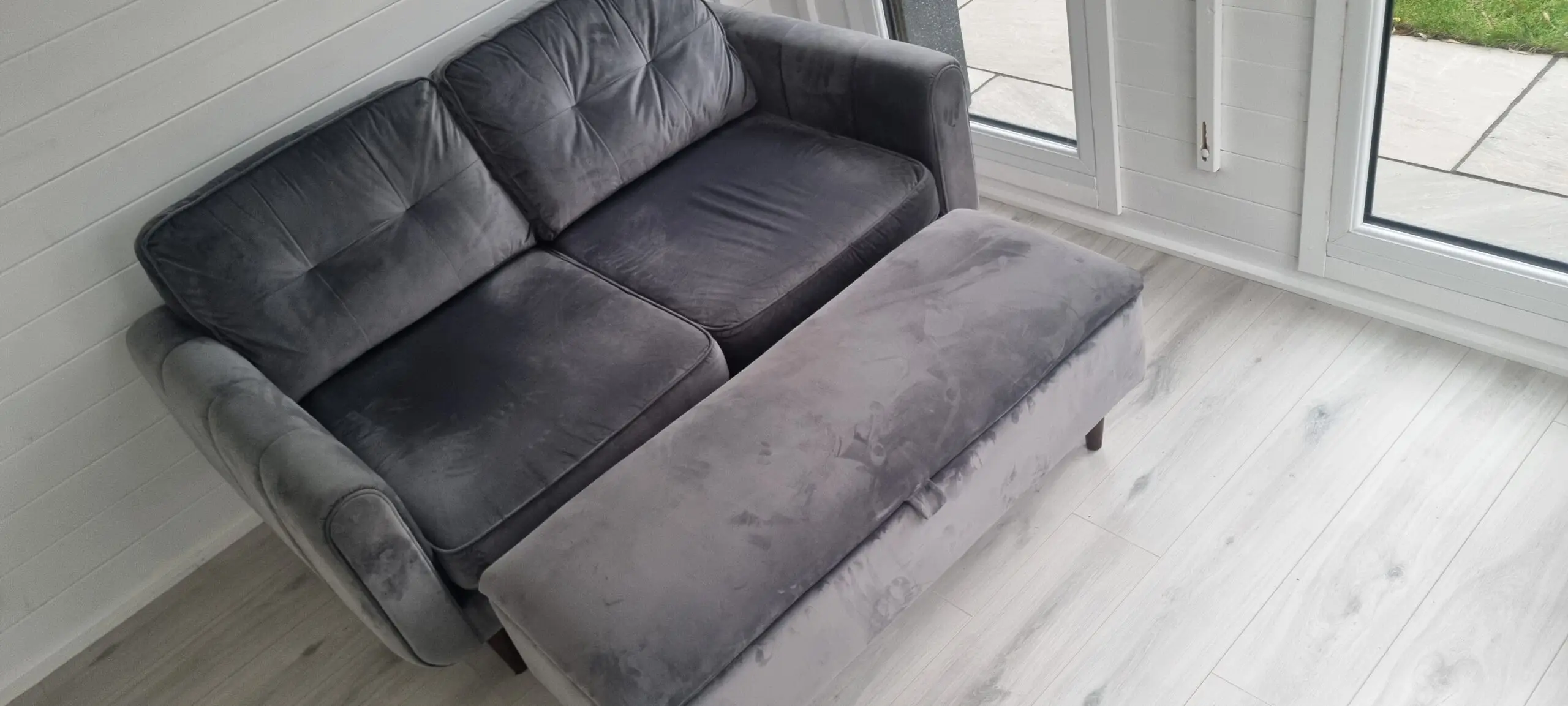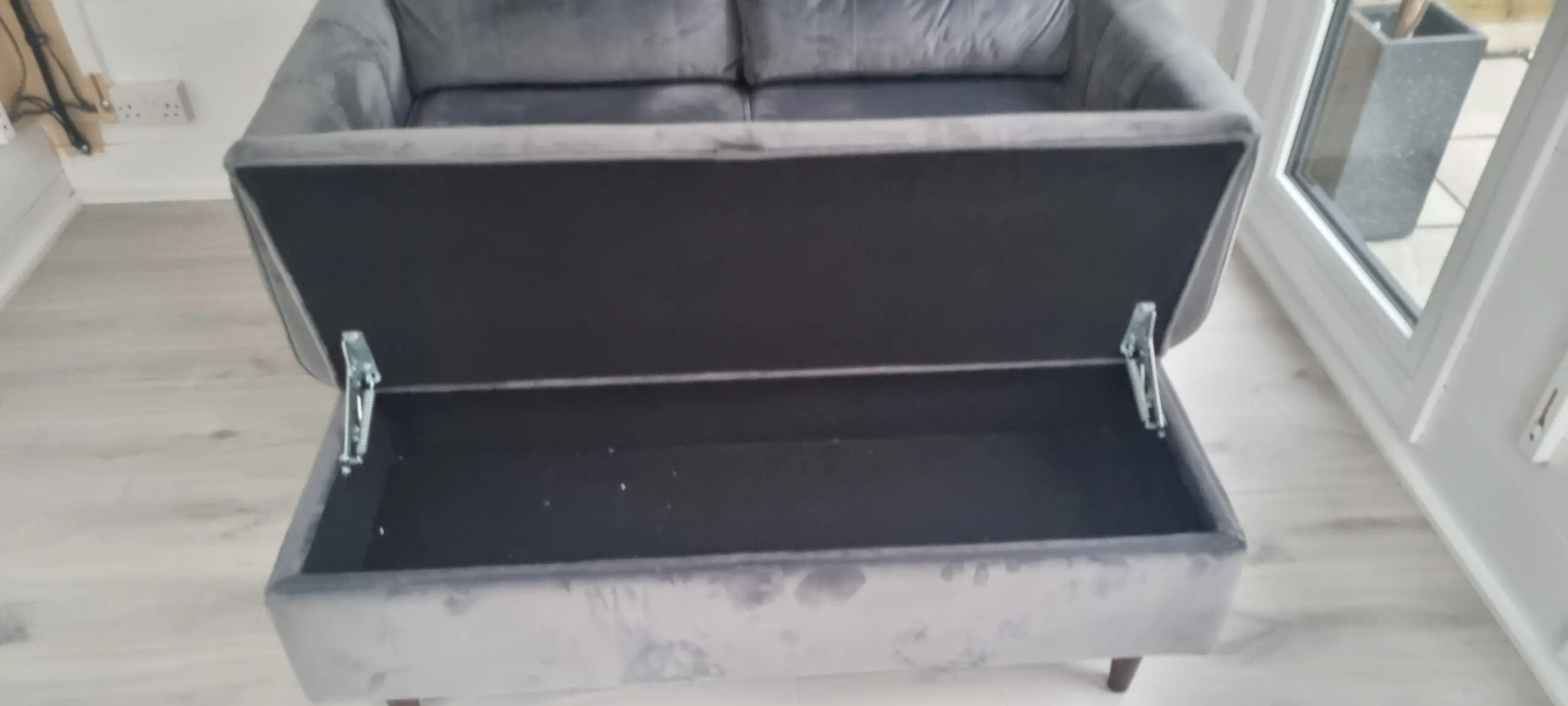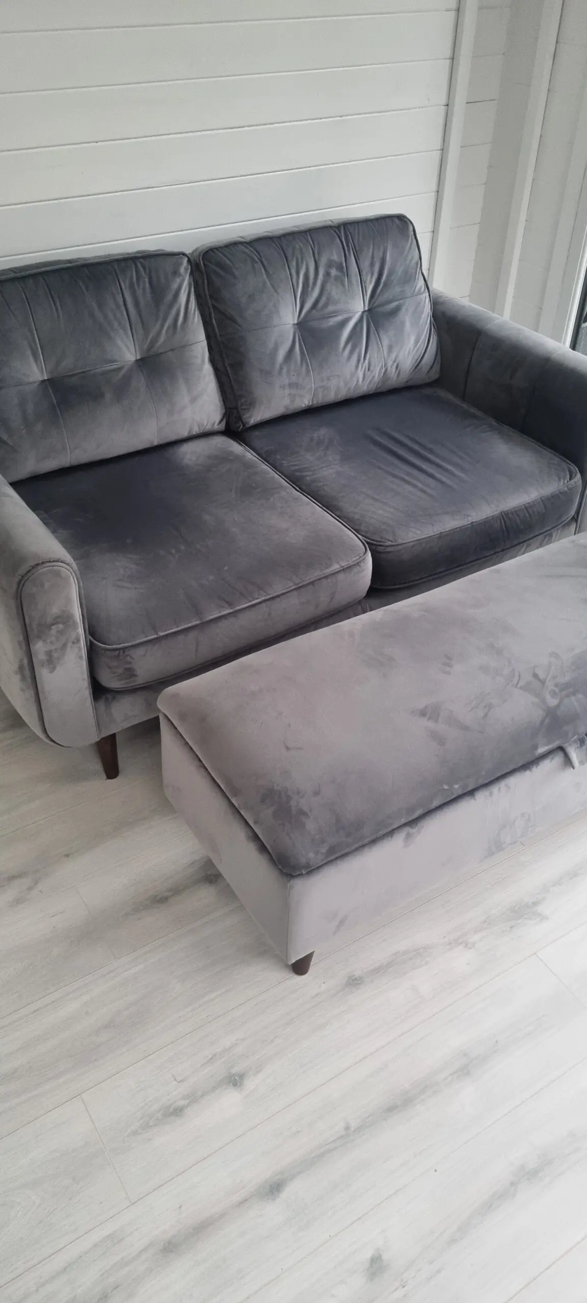 Grey 2 Seater Sofa and matching Footstall (inc storage compartment) from Sofology…Stylish and comfortable in very good condition.