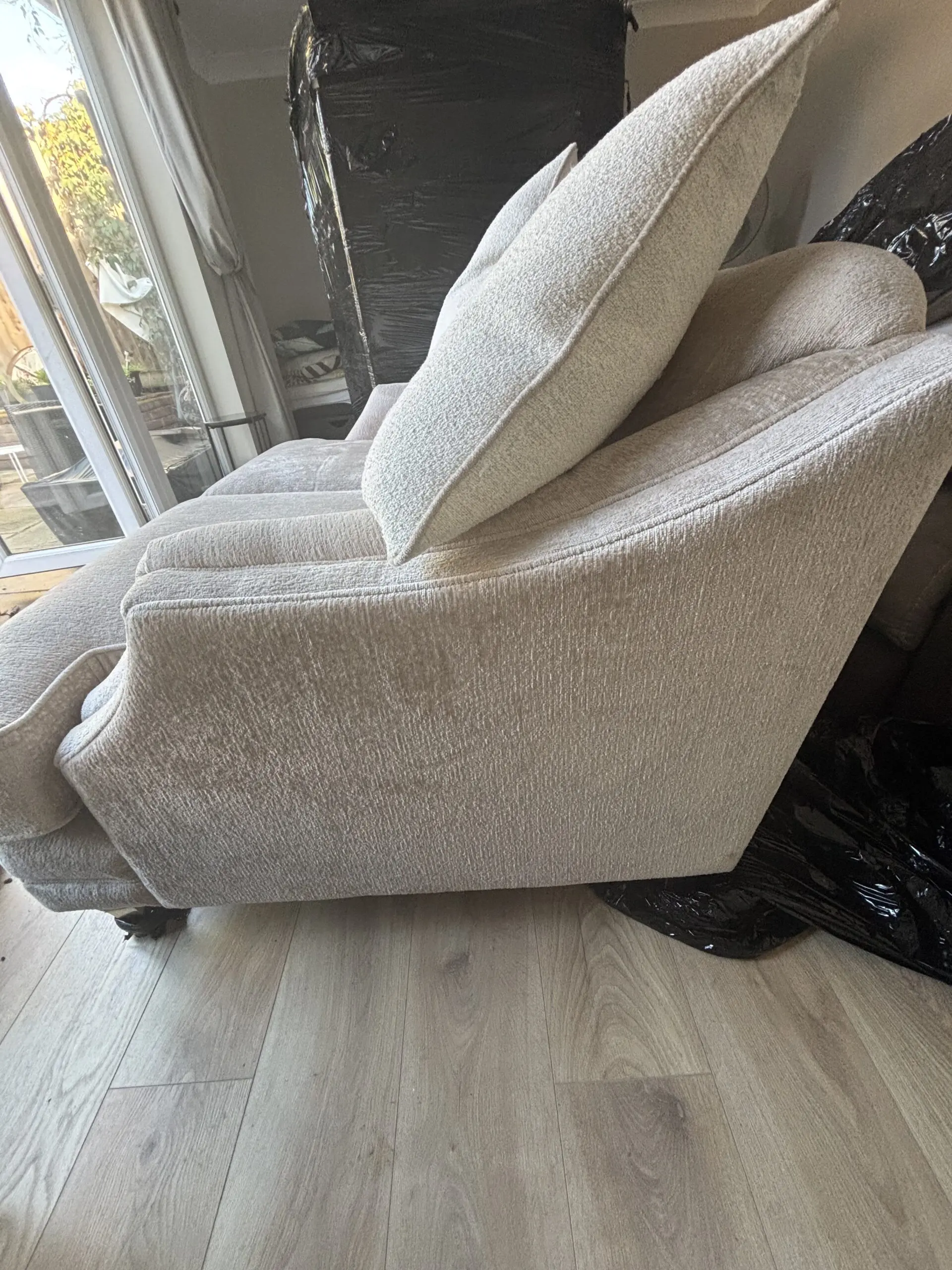 Mink Chenille Velvet Sofas x2 in excellent condition. Crafted with a textured chenille velvet base and adorned with castor legs, these sofas exude elegance and sophistication. They both come with 3 large matching cushions with removable covers, 30″ diameter.
