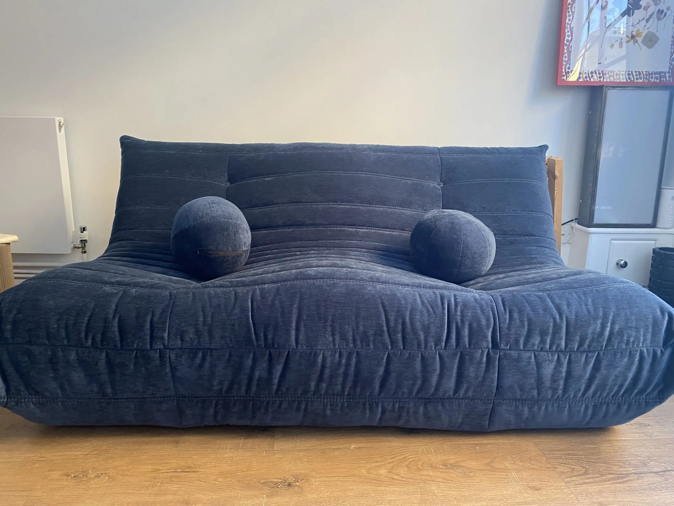 The Togo Inspired Two Seater Couch Sofa is a stylish and contemporary piece perfect for any living room. Made with a wooden frame and upholstered in velour fabric, this sofa offers a comfortable seating capacity for 2 adults with a seat depth of 60cm and a height of 74cm. The sleek blue colour adds a modern touch.