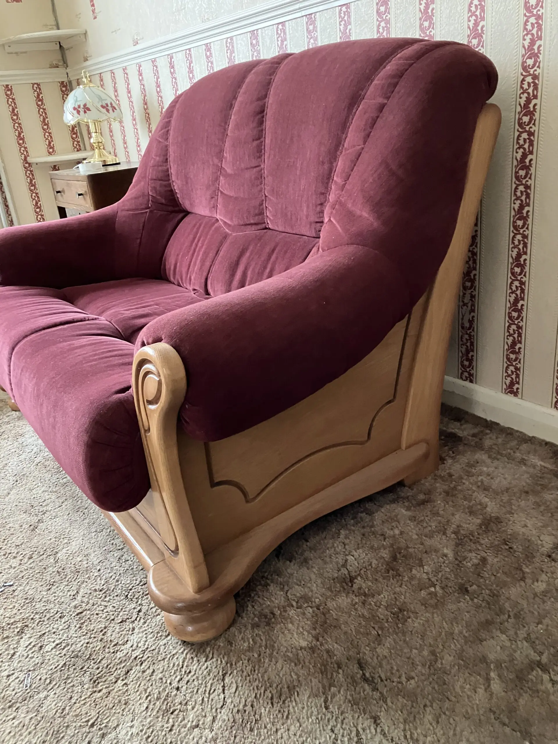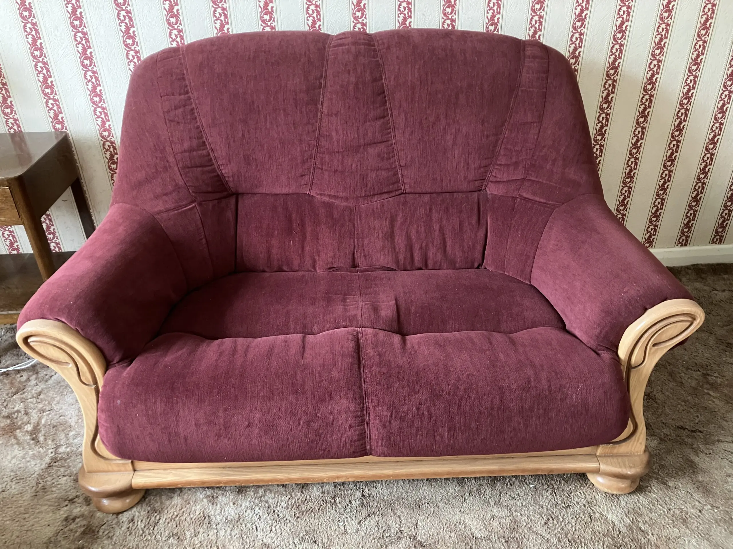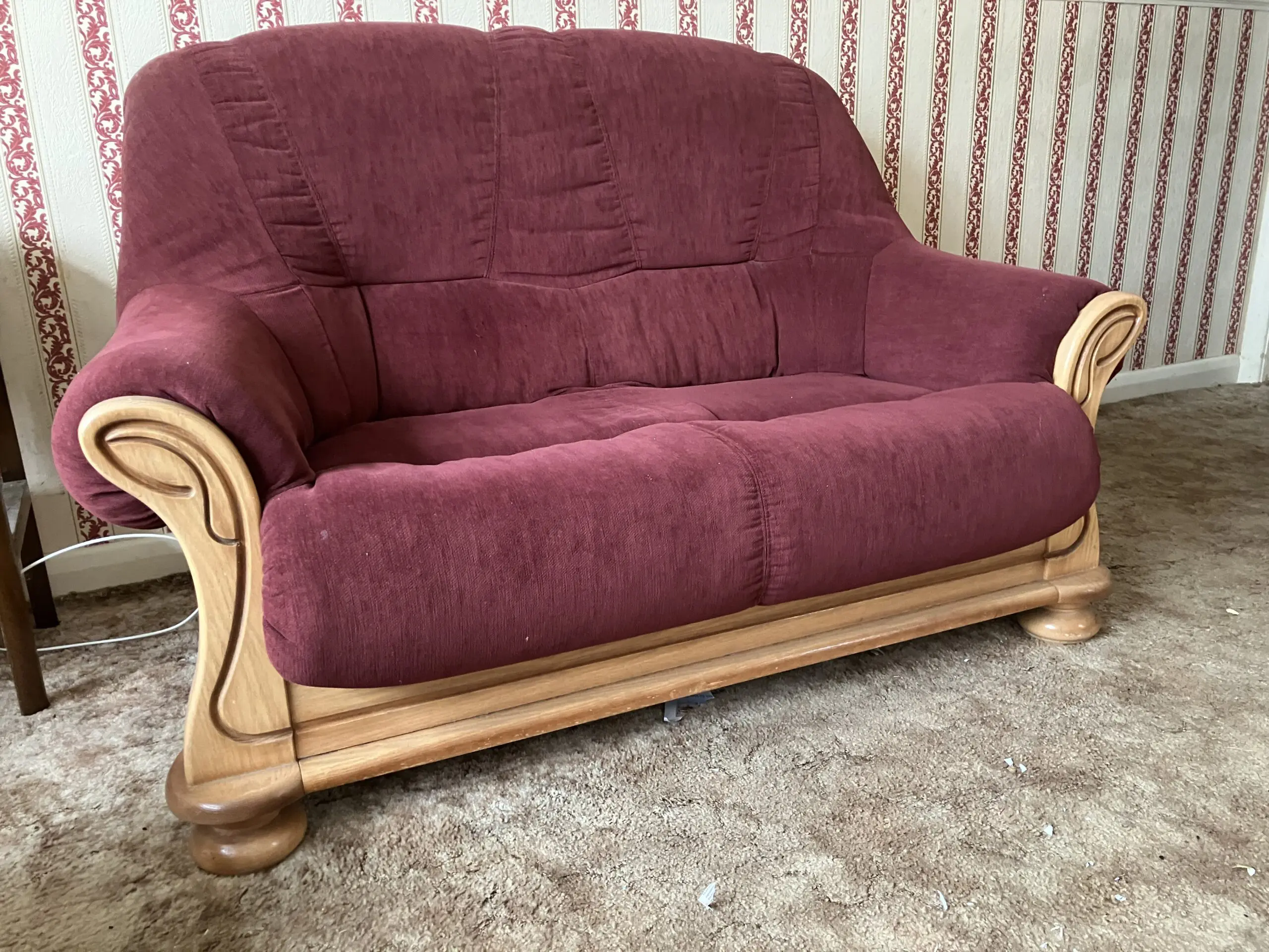 2 seater wooden framed sofa, maroon fabric