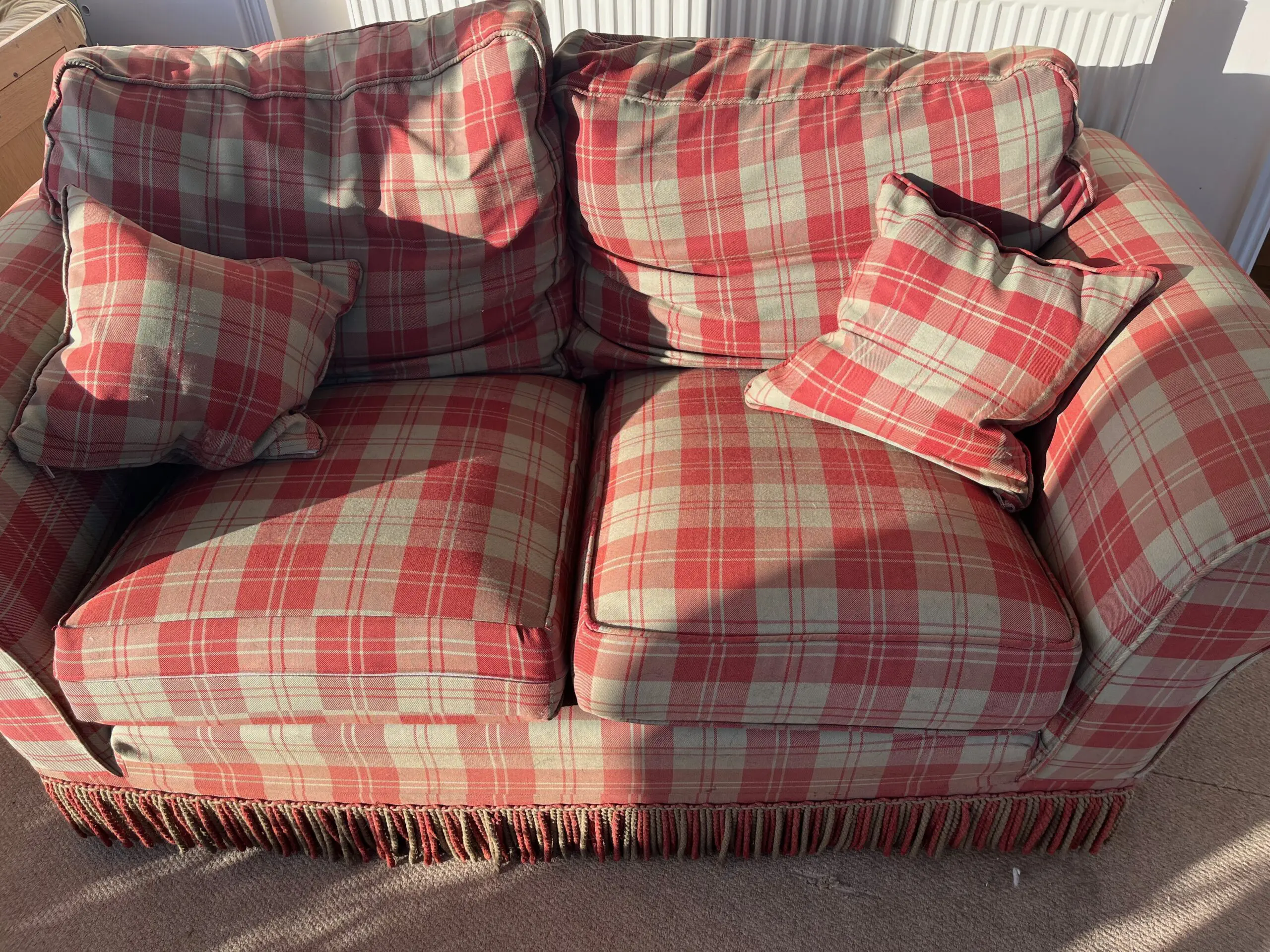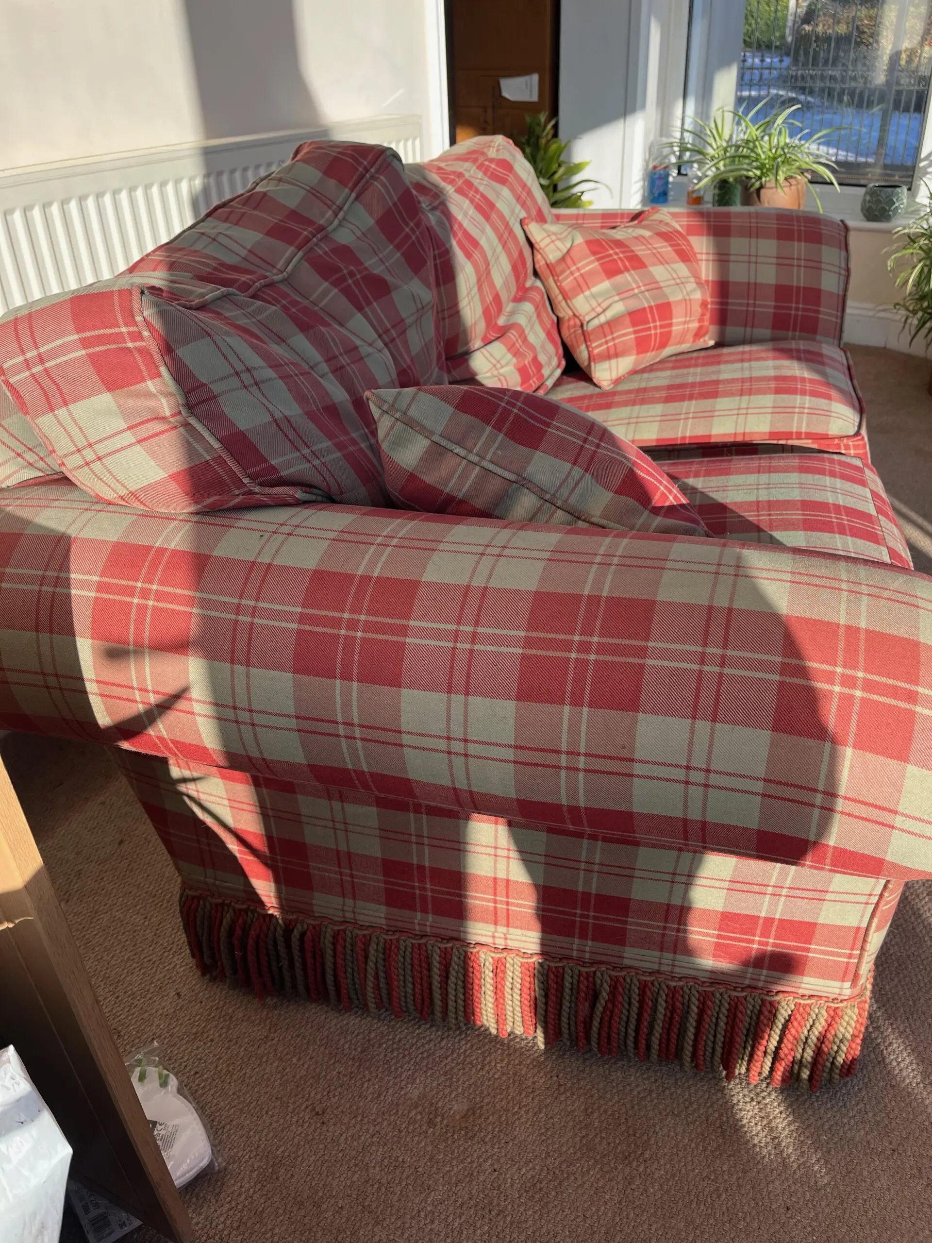 There is a matching 3 seater available also. Feather back cushions, foam seats. Very very comfortable. Bought from an independent shop in Baldock.
