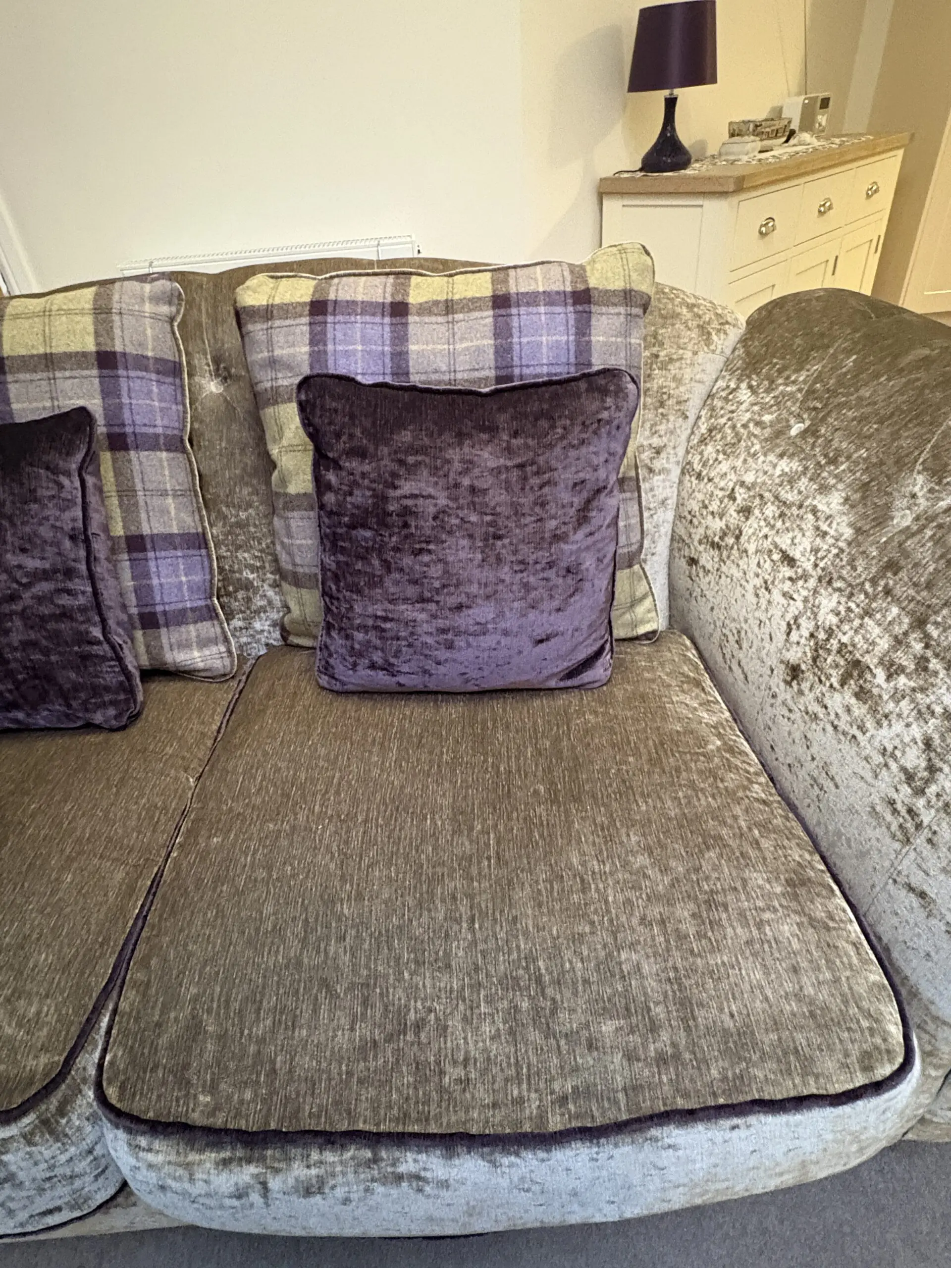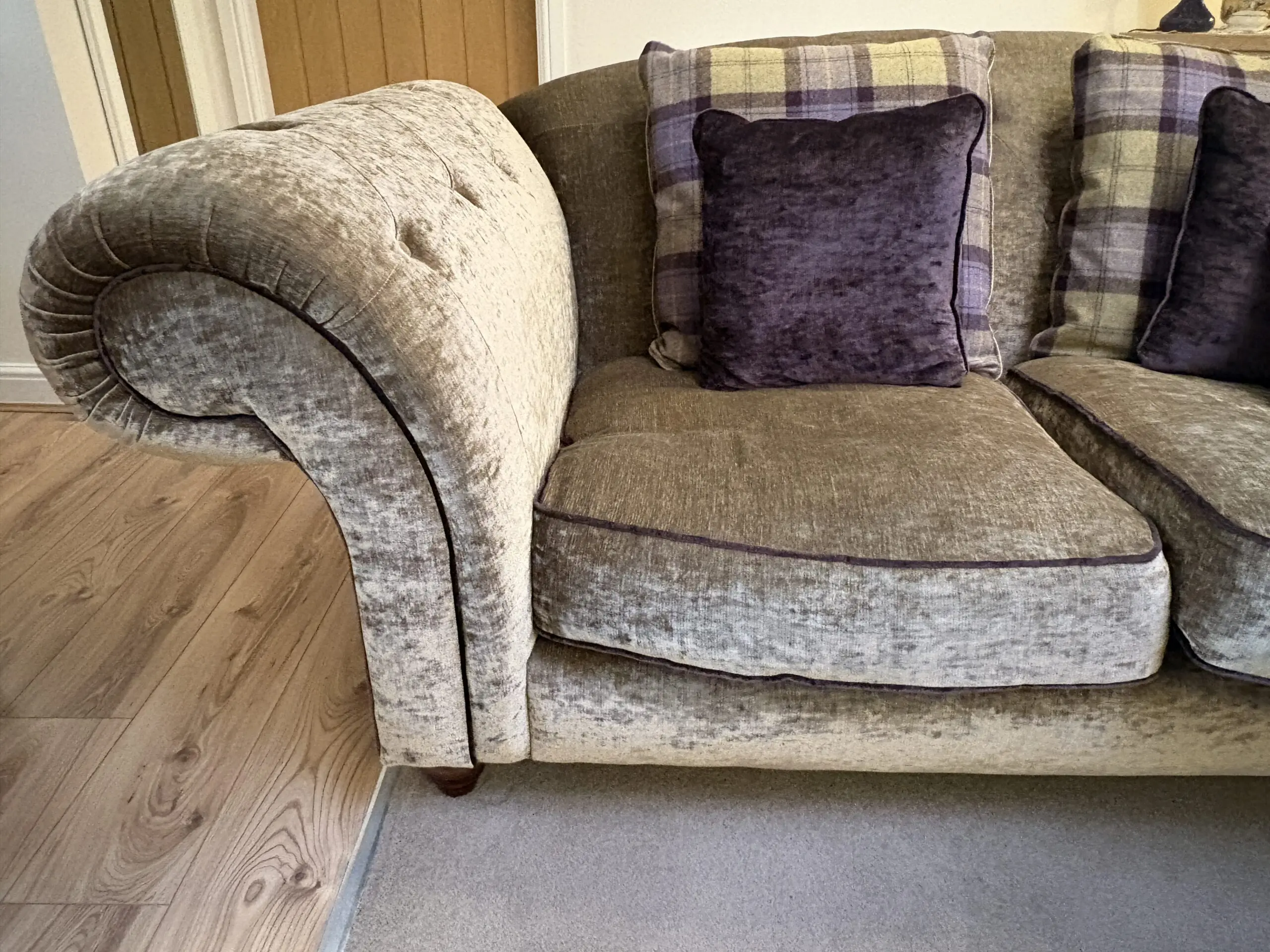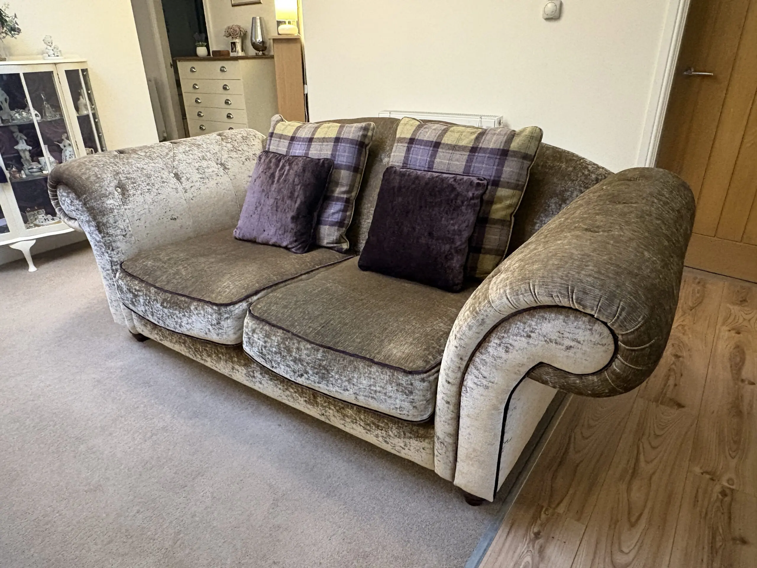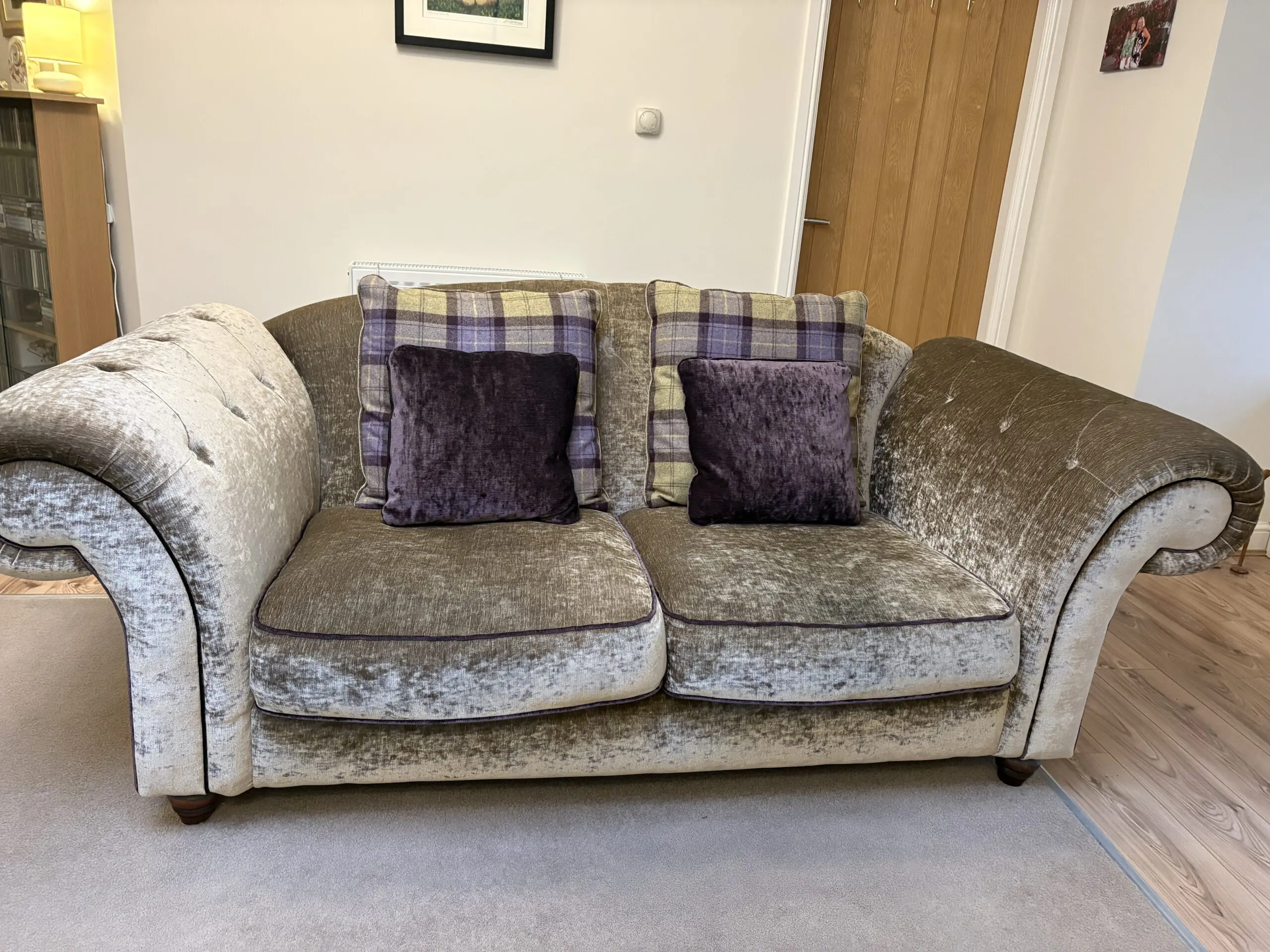 2 x large chesterfield type sofas from Sofology. Classed as two seaters but easily large enough for 3 seats. Official colour is “aubergine” Great condition from a smoke & animal free home. Only lightly used. Full back but with loose cushions in a purple pattern to co-ordinate with the purple piping on sofas. Wooden feet.
