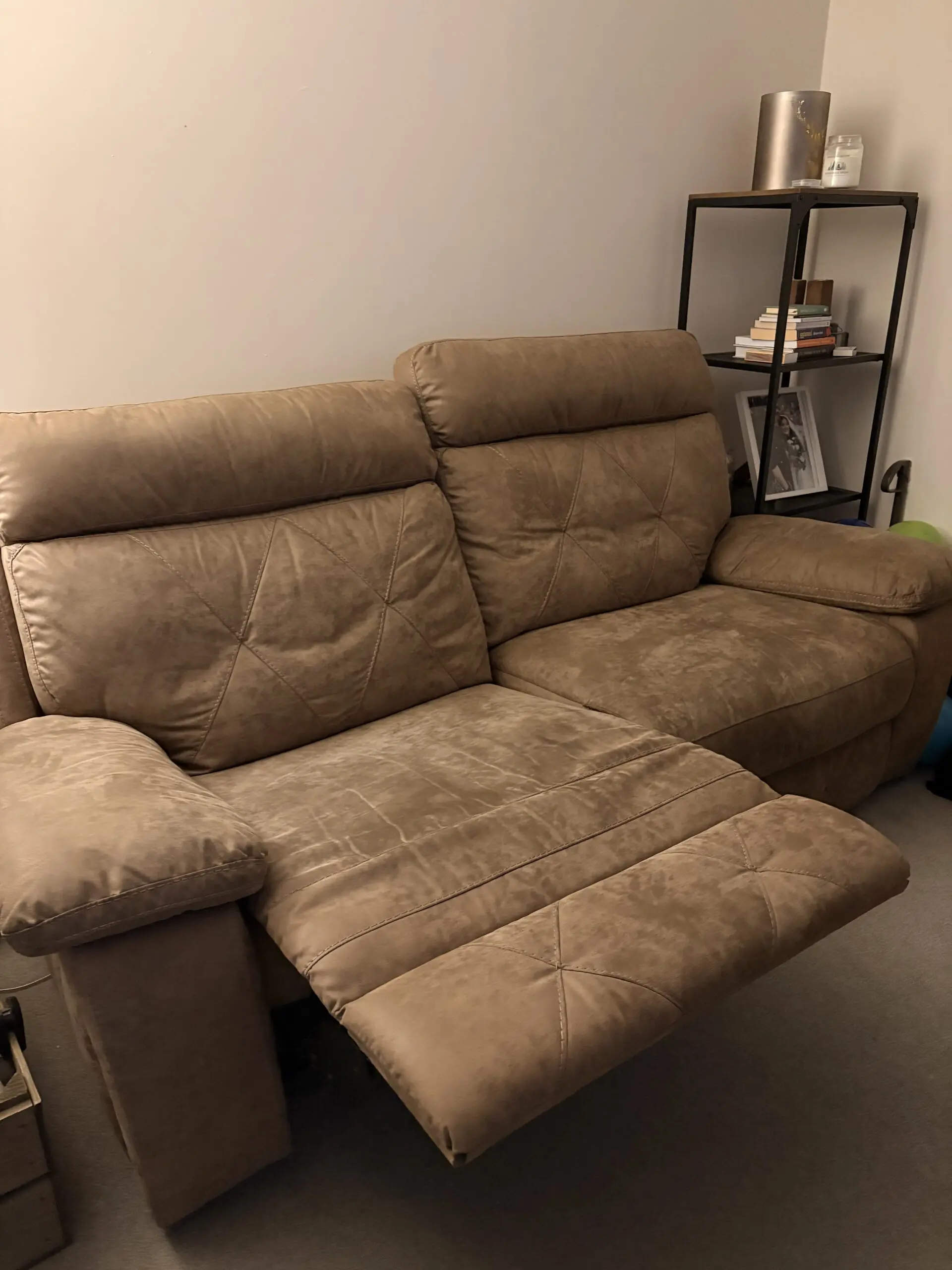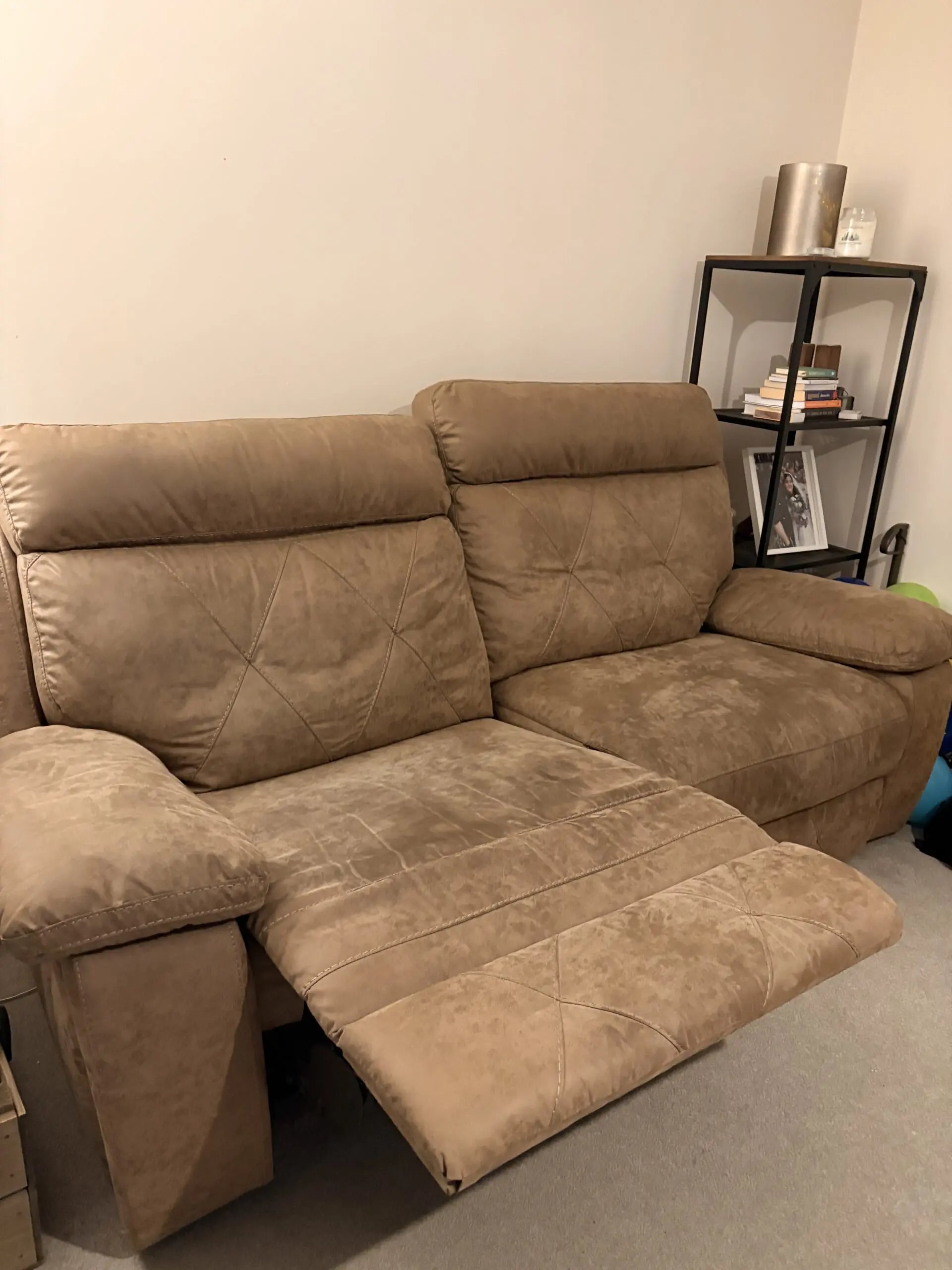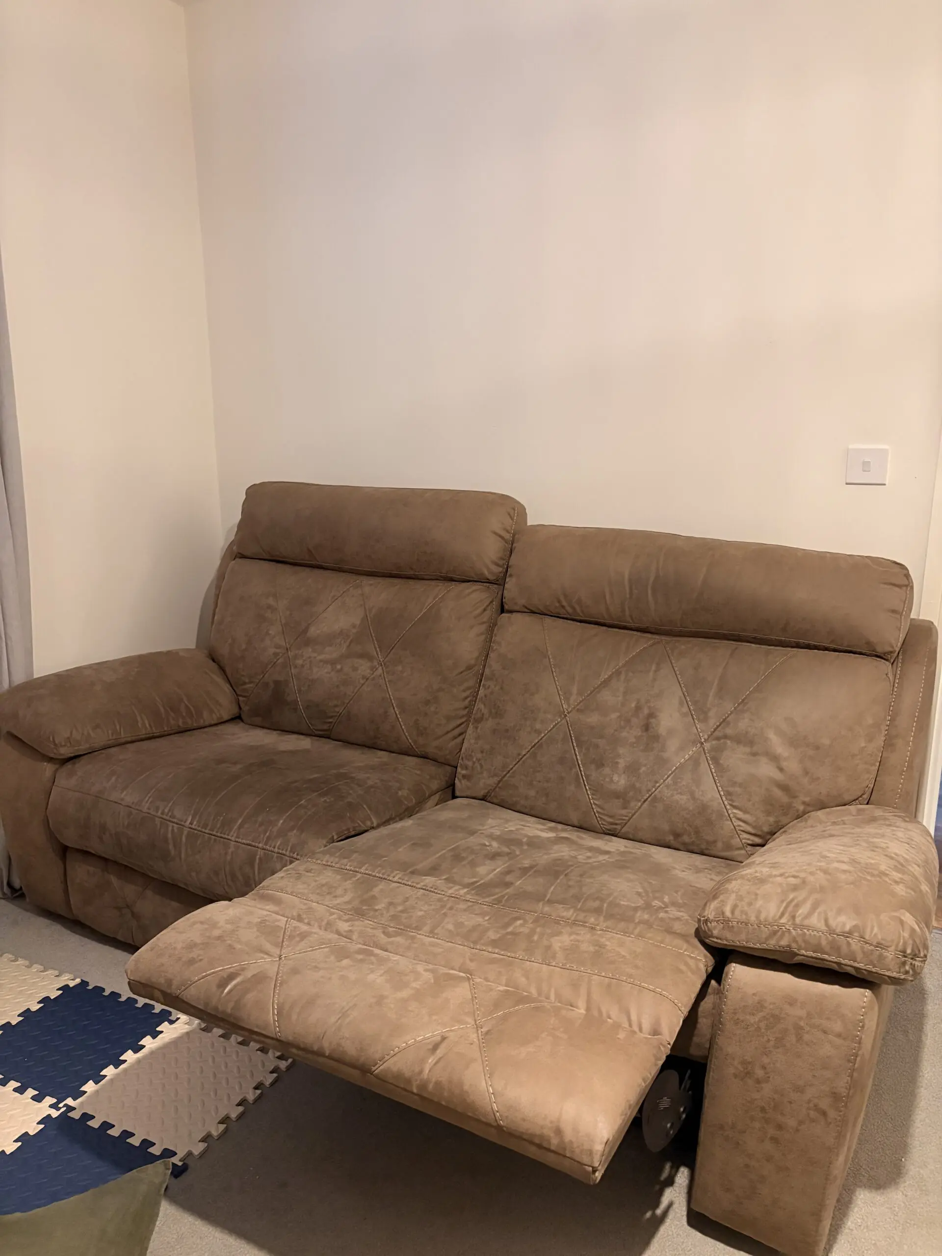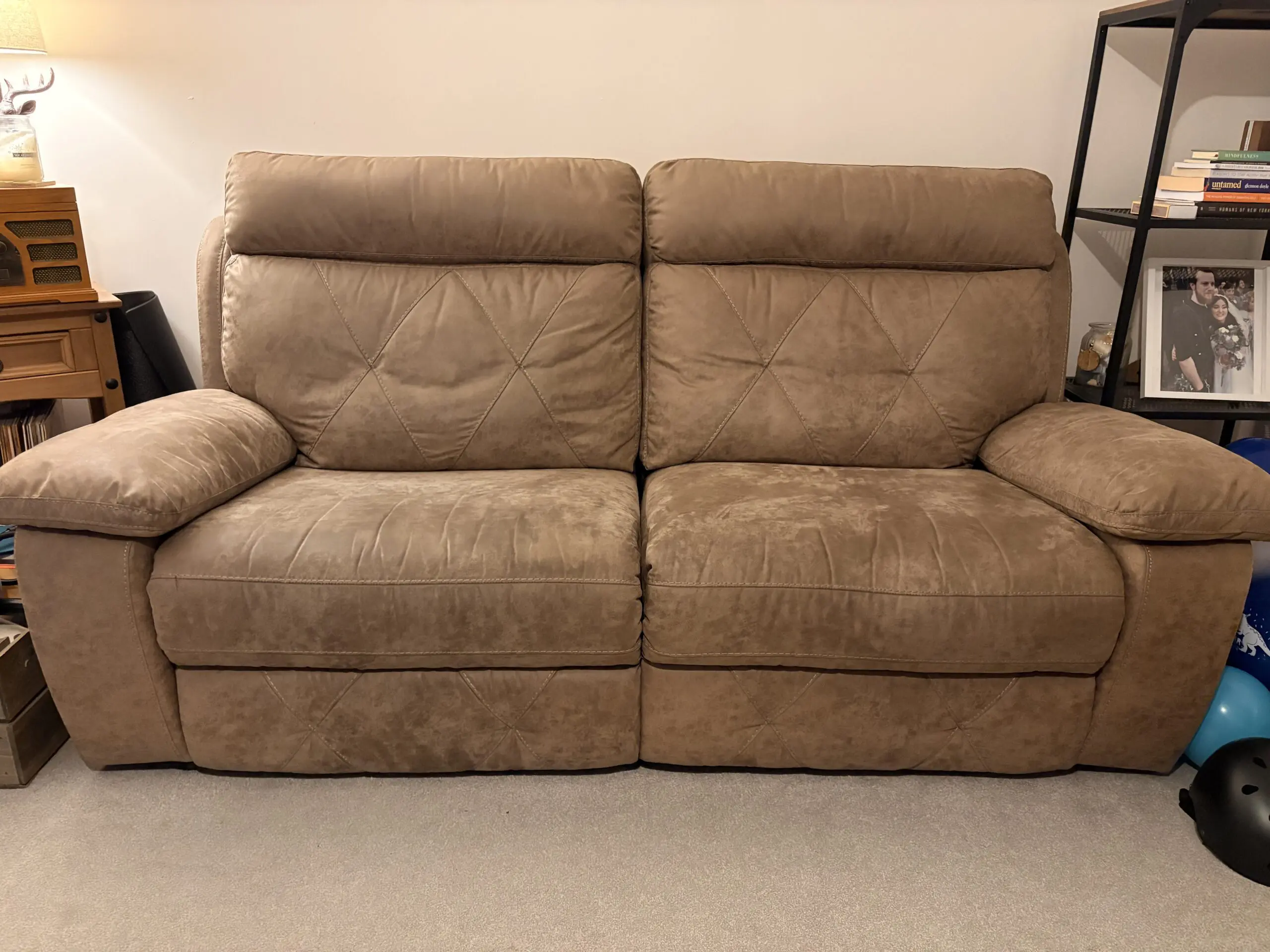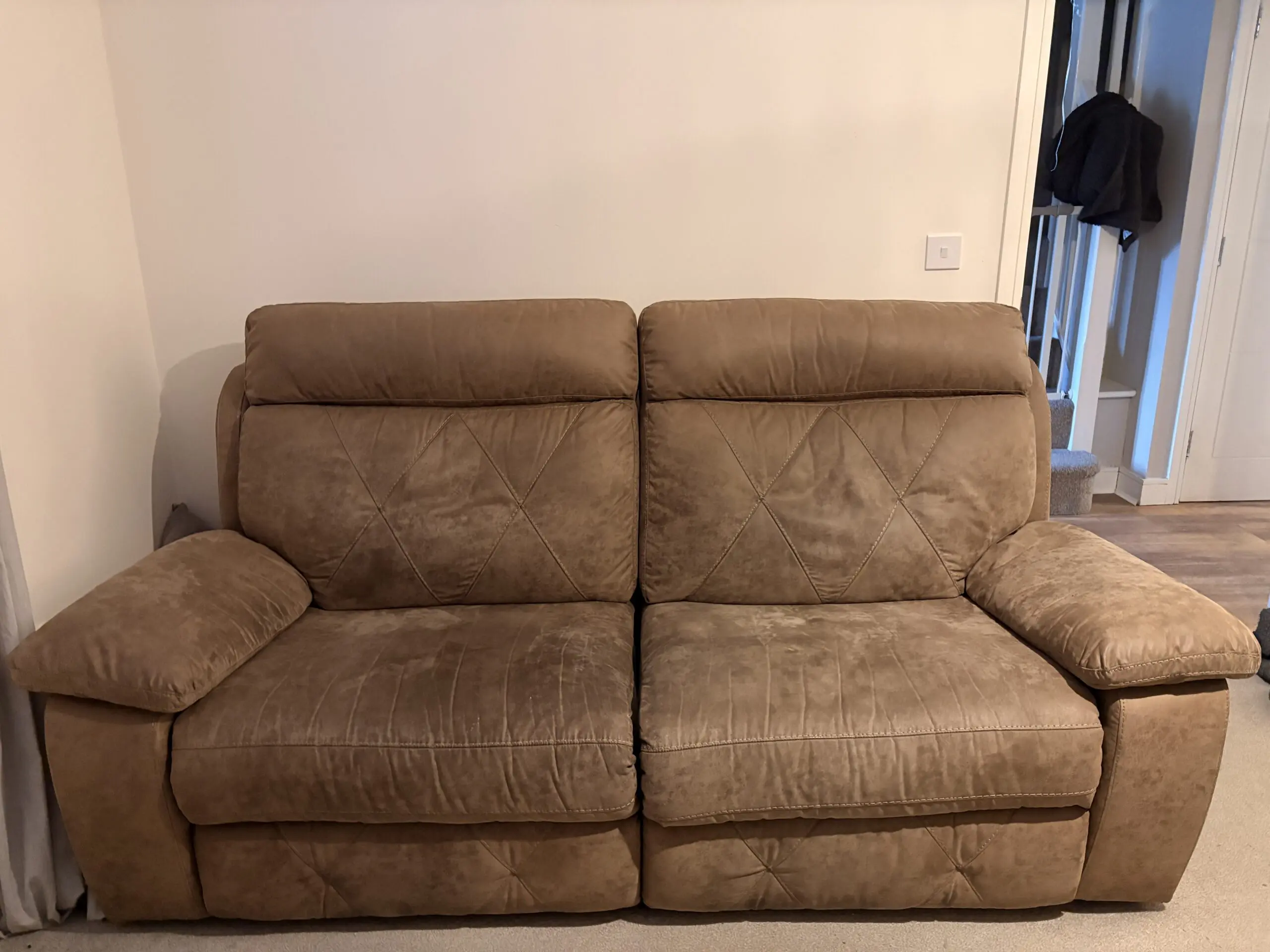 2 x sofas for sale, 2 seater recliners but large and comfortably sit 3 people if needed. They’re brown leather suede and in good condition, only selling because we’re reconfiguring our living room