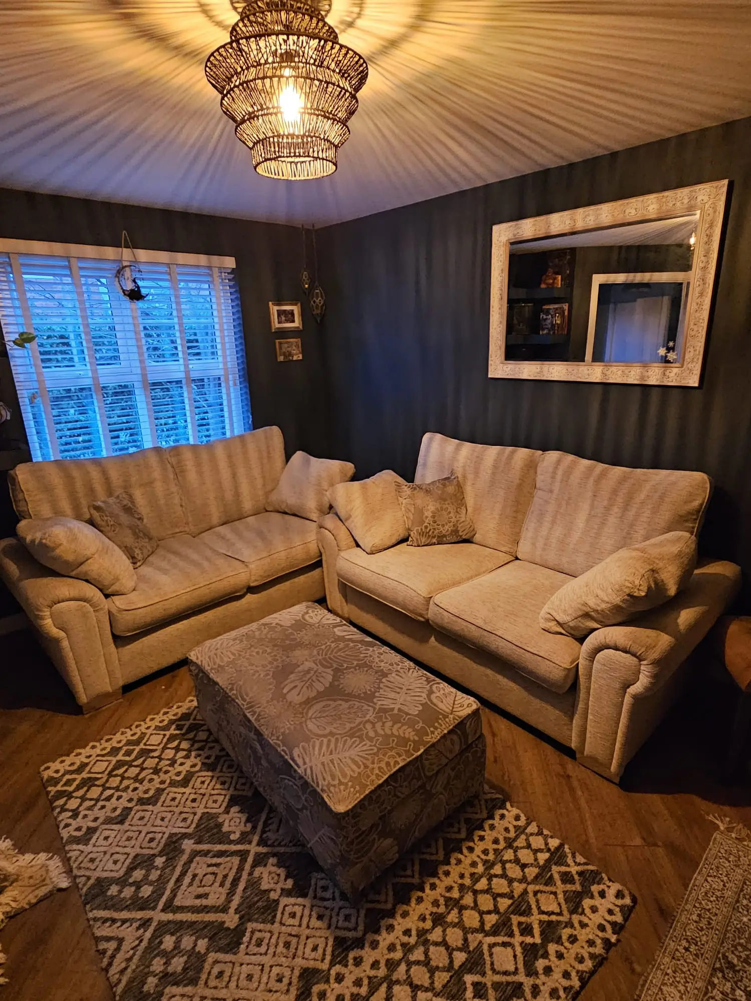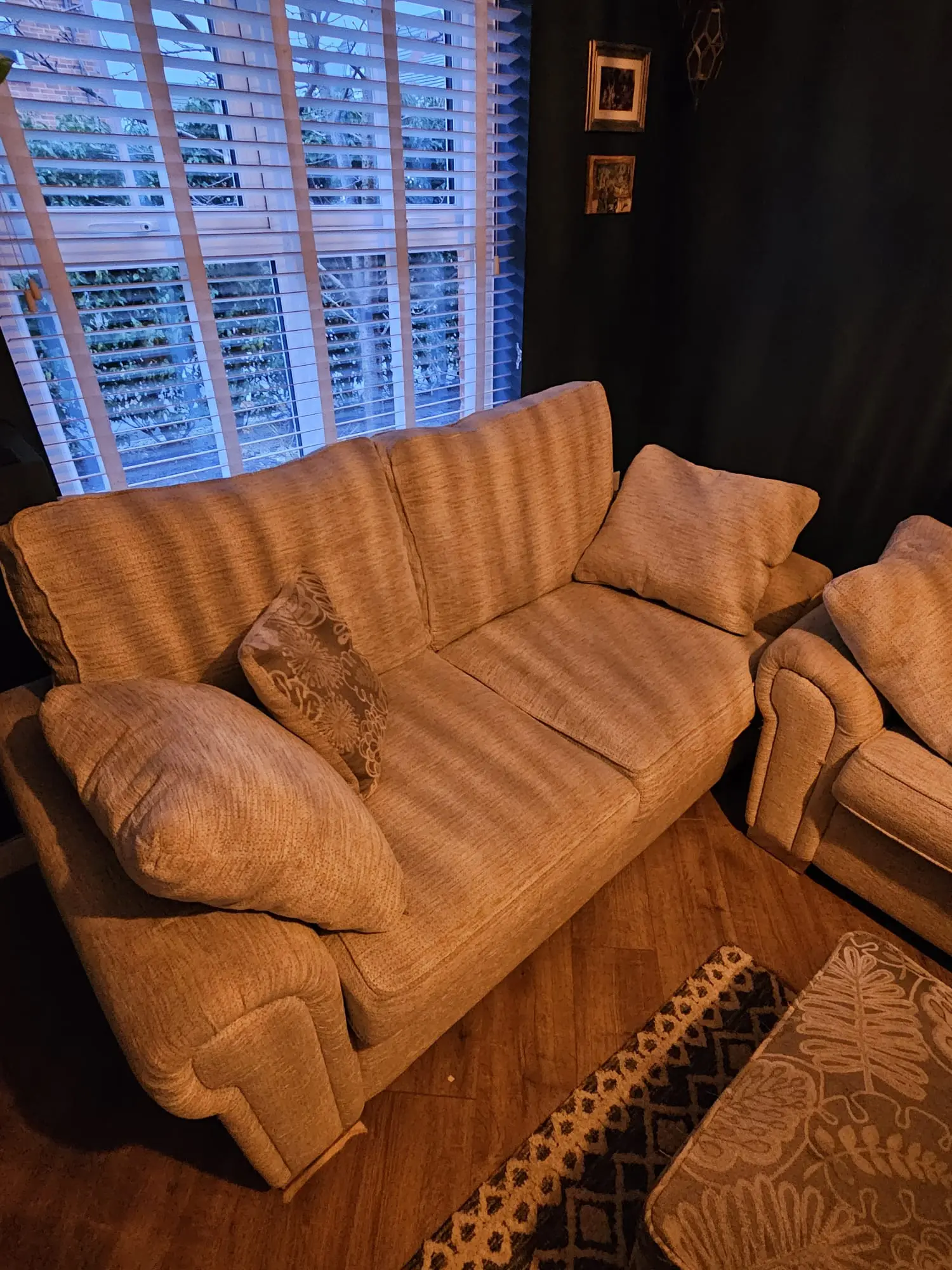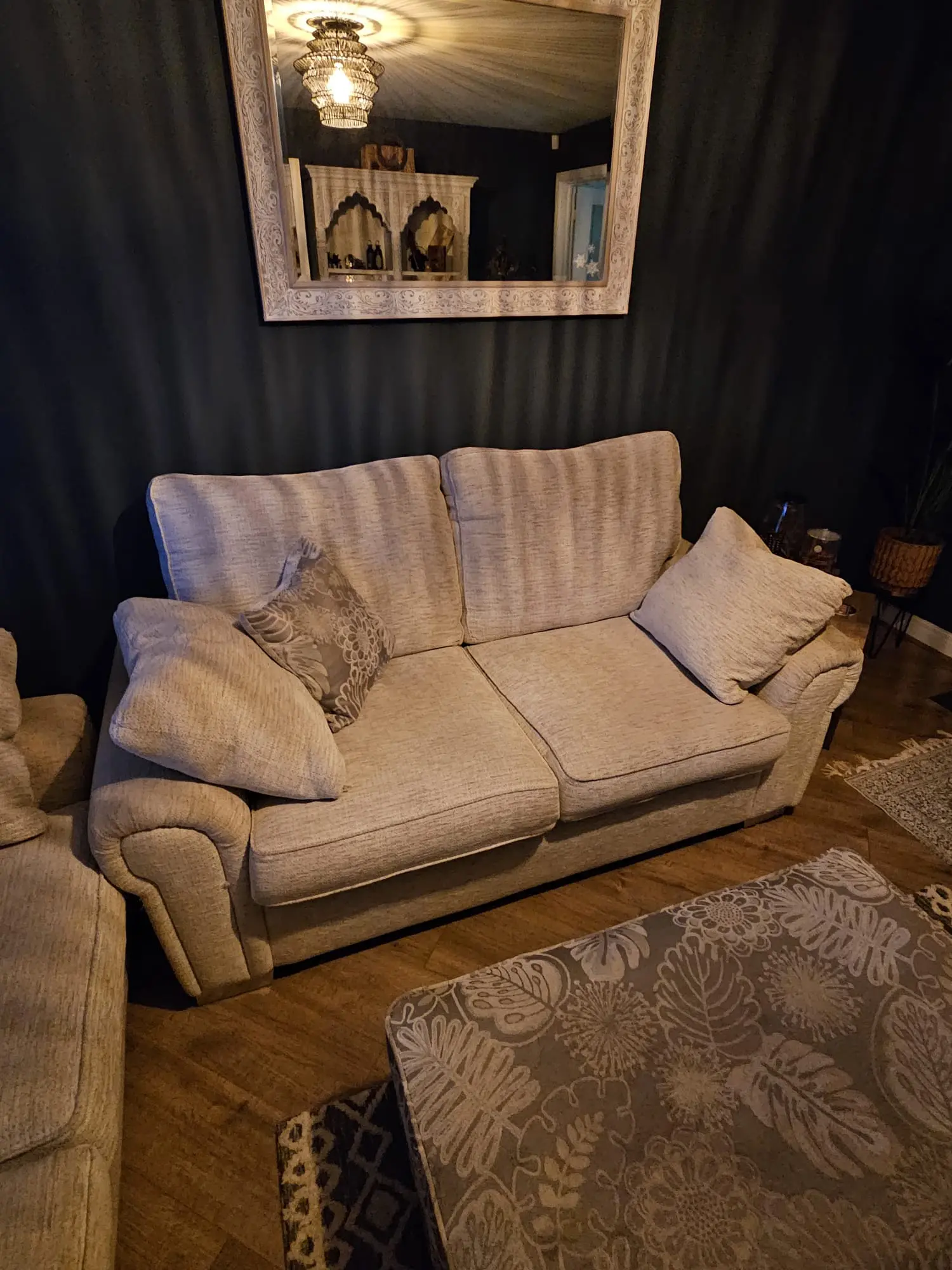 Two matching beige/cream 2-seater sofas, complete with a coordinating ottoman footstool. Each sofa comes with one scatter cushion, both in the same pattern and colours as the ottoman for a cohesive look.