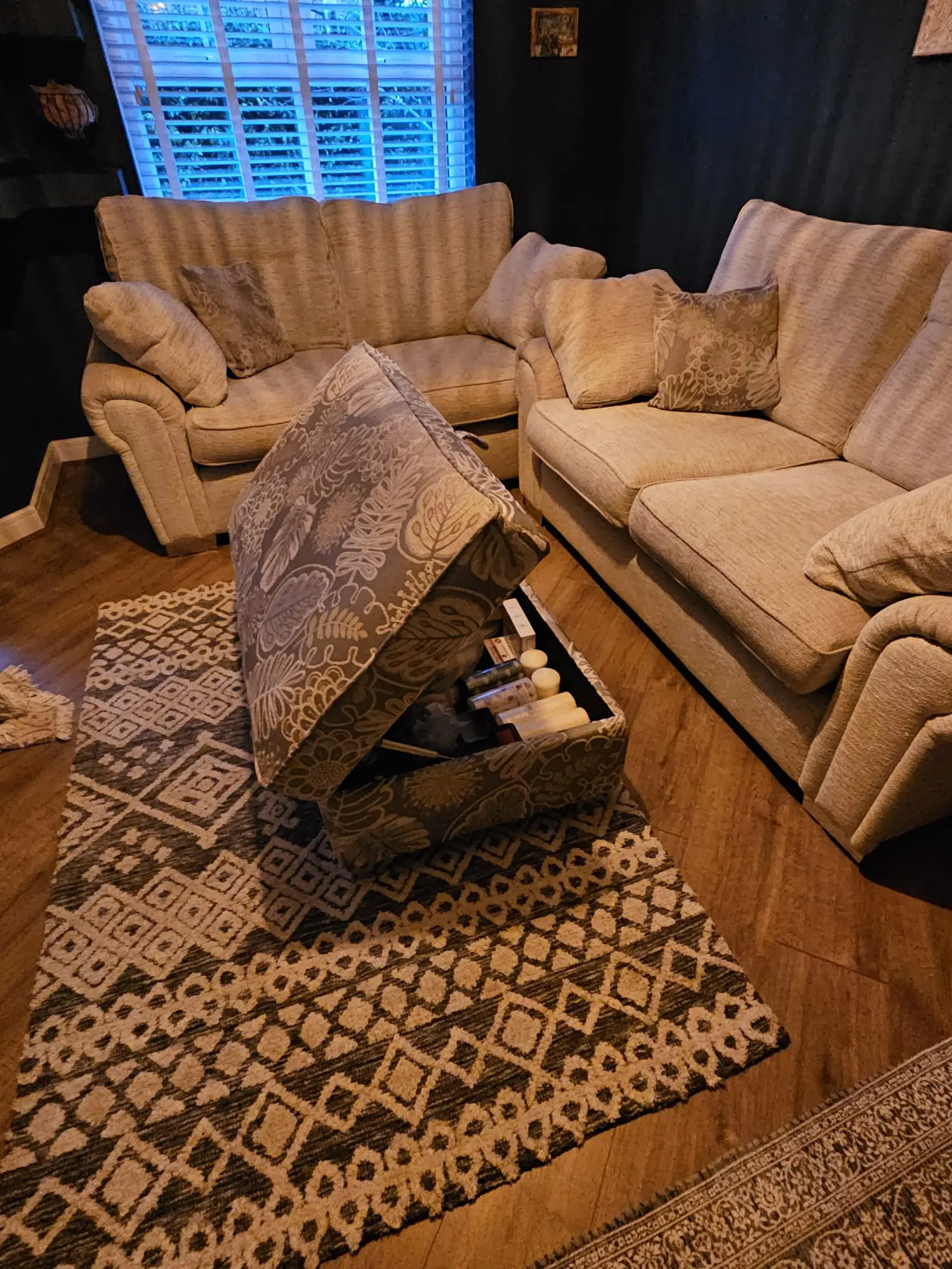 The ottoman features a cream and pale green leaf pattern with a grey-blue base colour and offers ample internal storage. It would benefit from a shampoo clean.