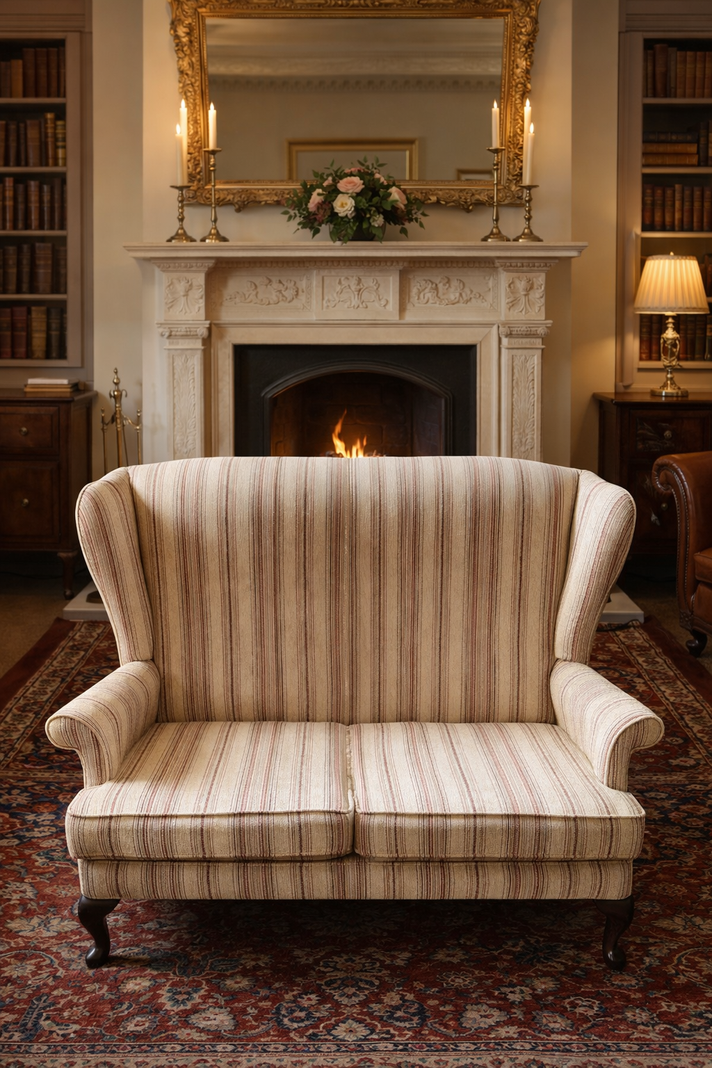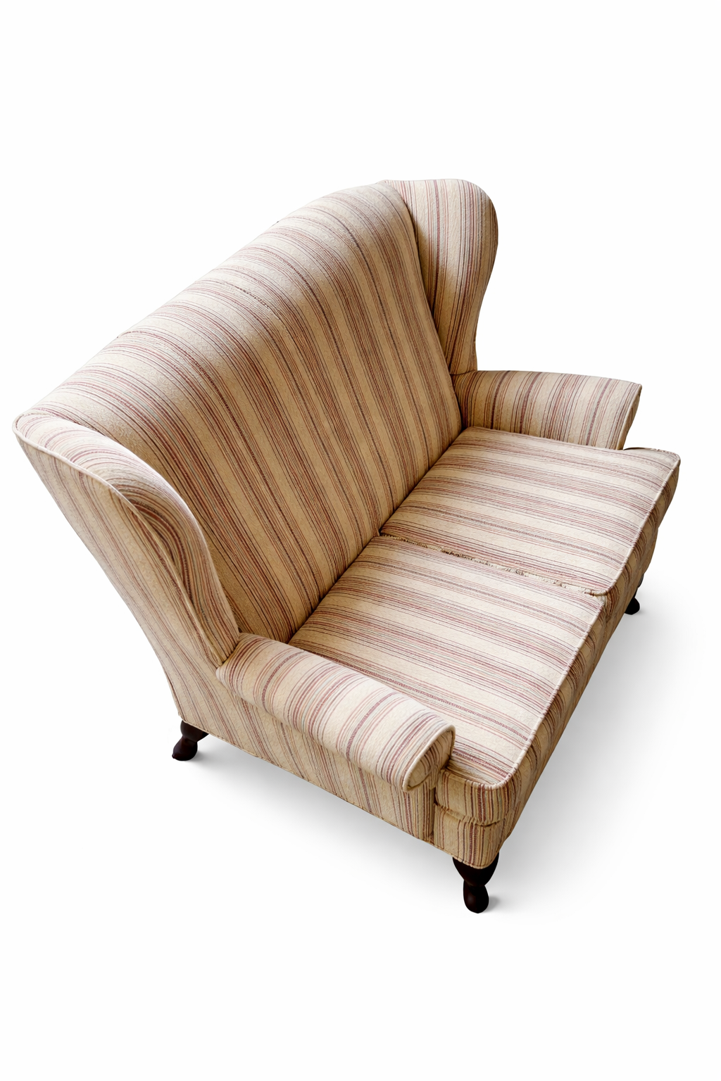 A classic Parker Knoll two-seater loveseat in a traditional wingback form, upholstered in a neutral striped fabric.