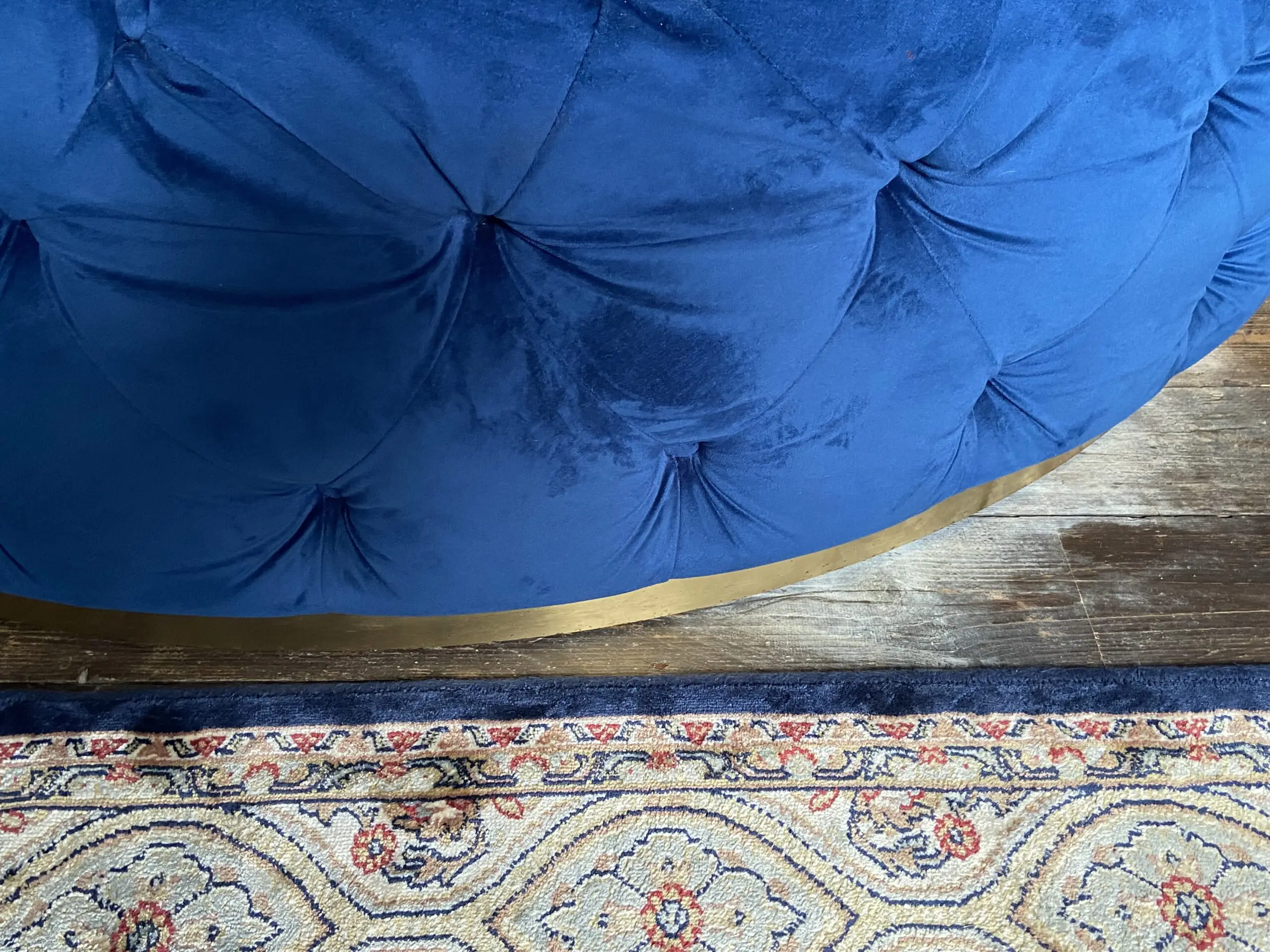 A Velvet navy loveseat offers a luxurious feel with a medium, rich texture that reflects the light. This iconic loveseat boasts a scroll-arm design with deep buttoning on the back panel and arms. The real golden feet provide a classic finishing touch. A snug cuddle chair designed for two, this loveseat includes three matching throw cushions. Hardly used from a clean non-smoking home.