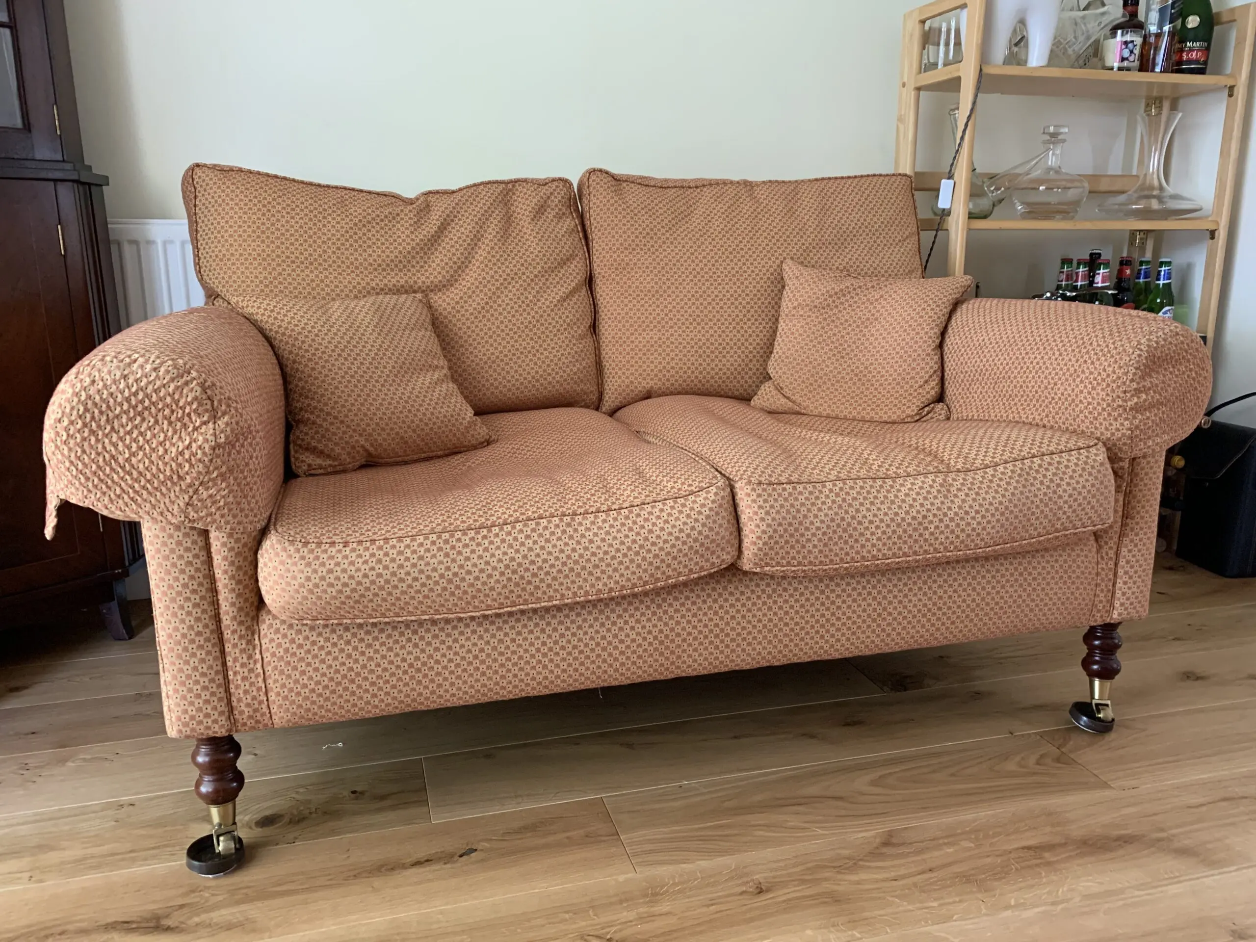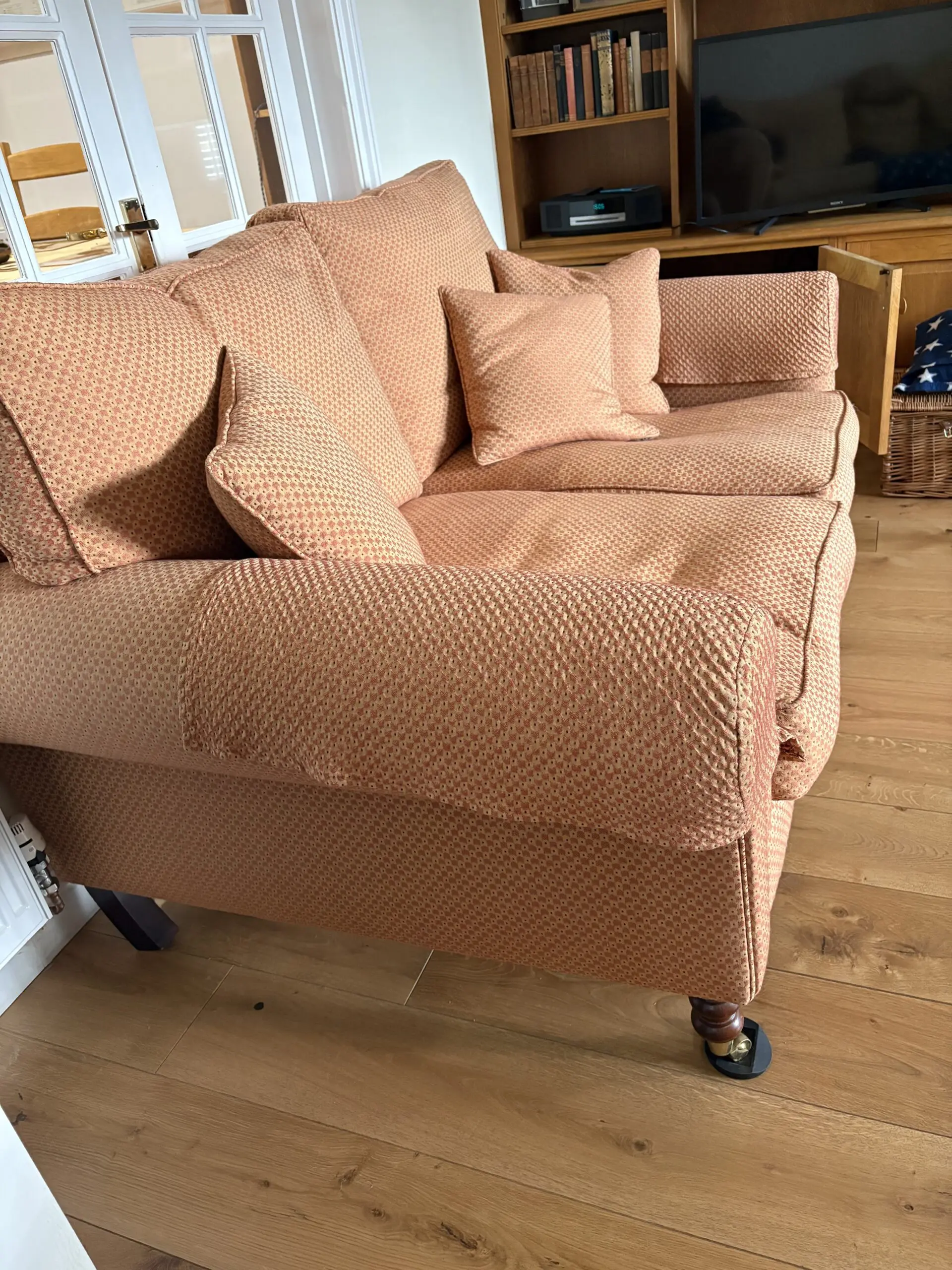 Probably from John Lewis originally but not sure. Red and beige check-like pattern. Mahogany feet. 3 matching scatter cushions