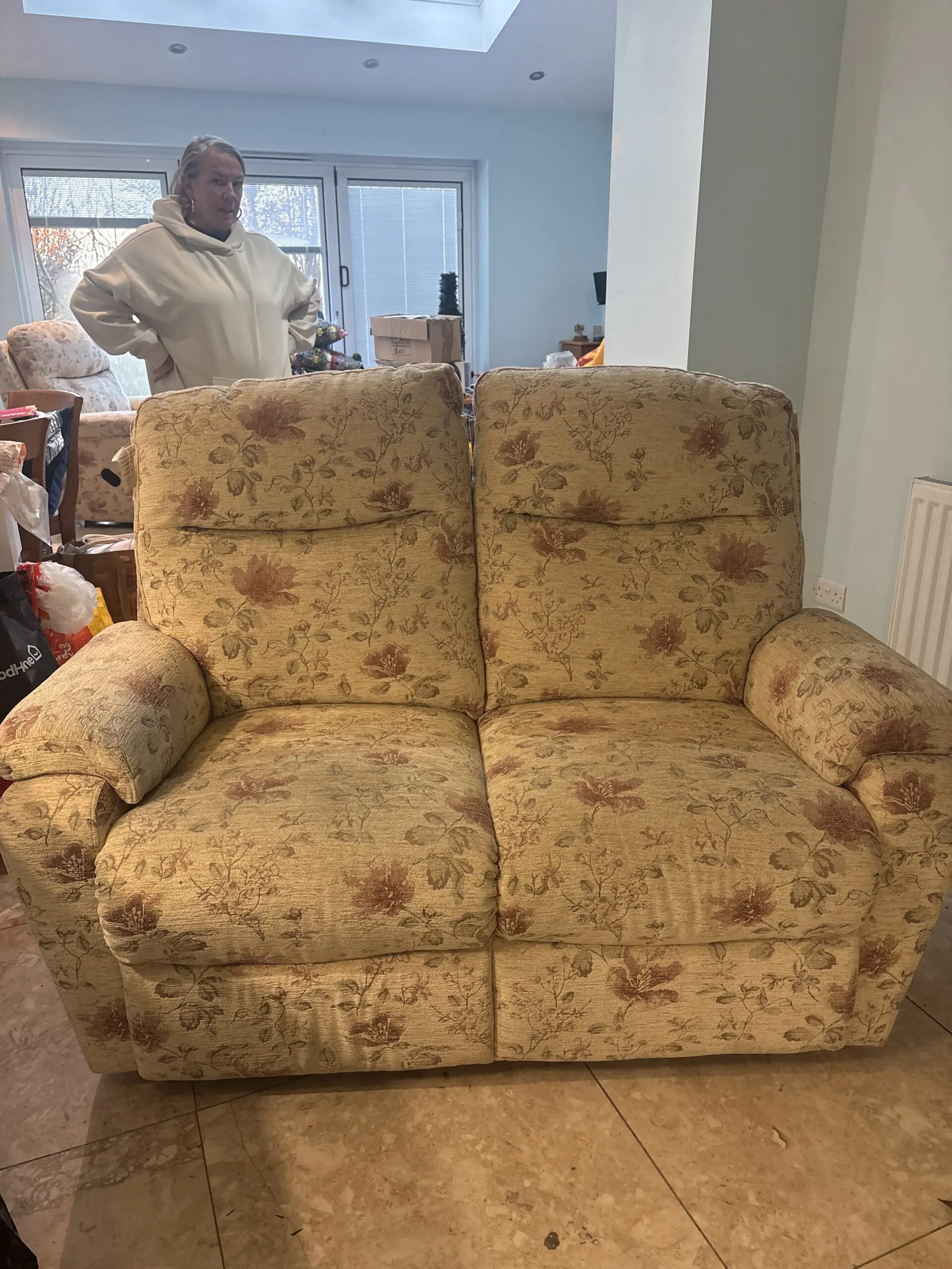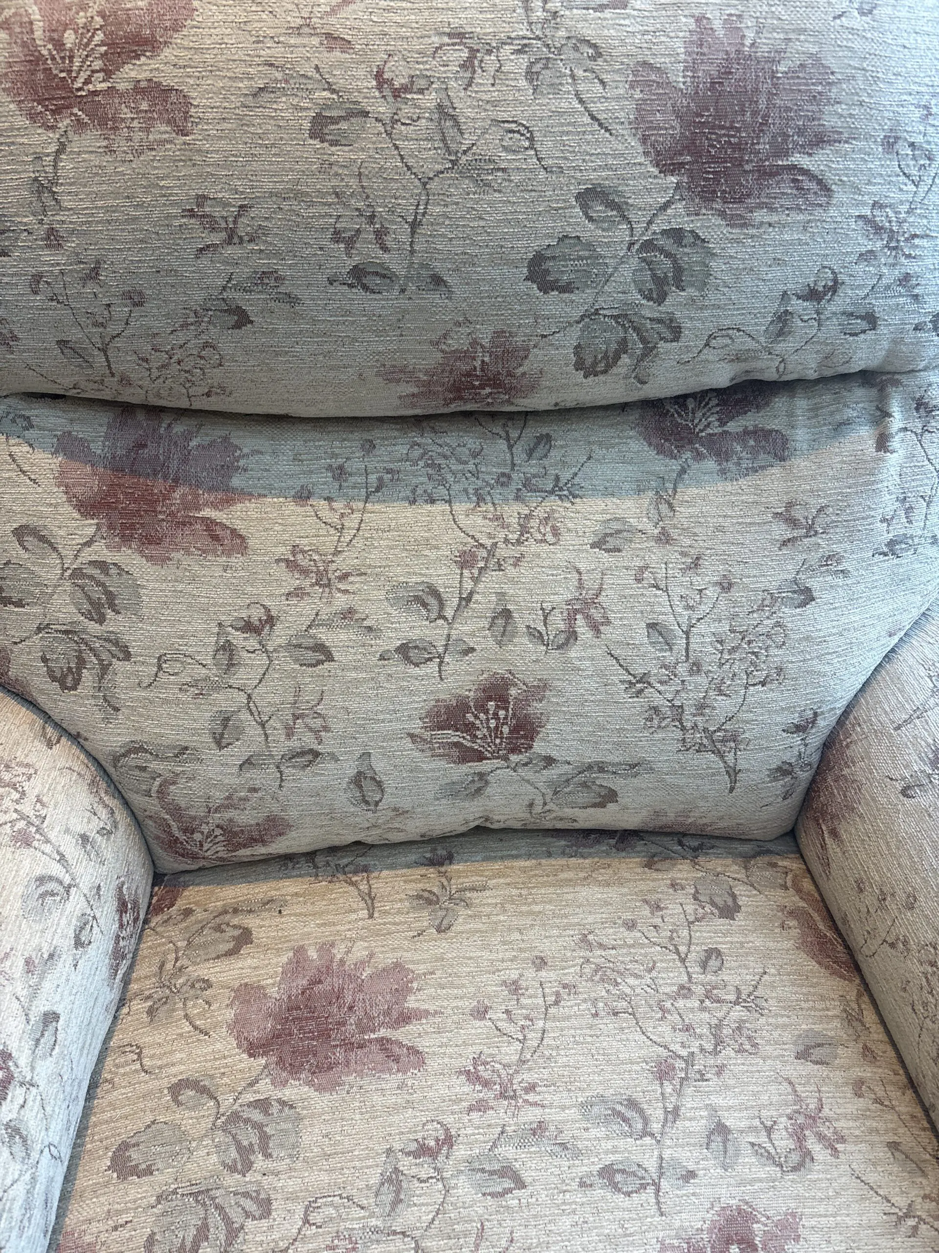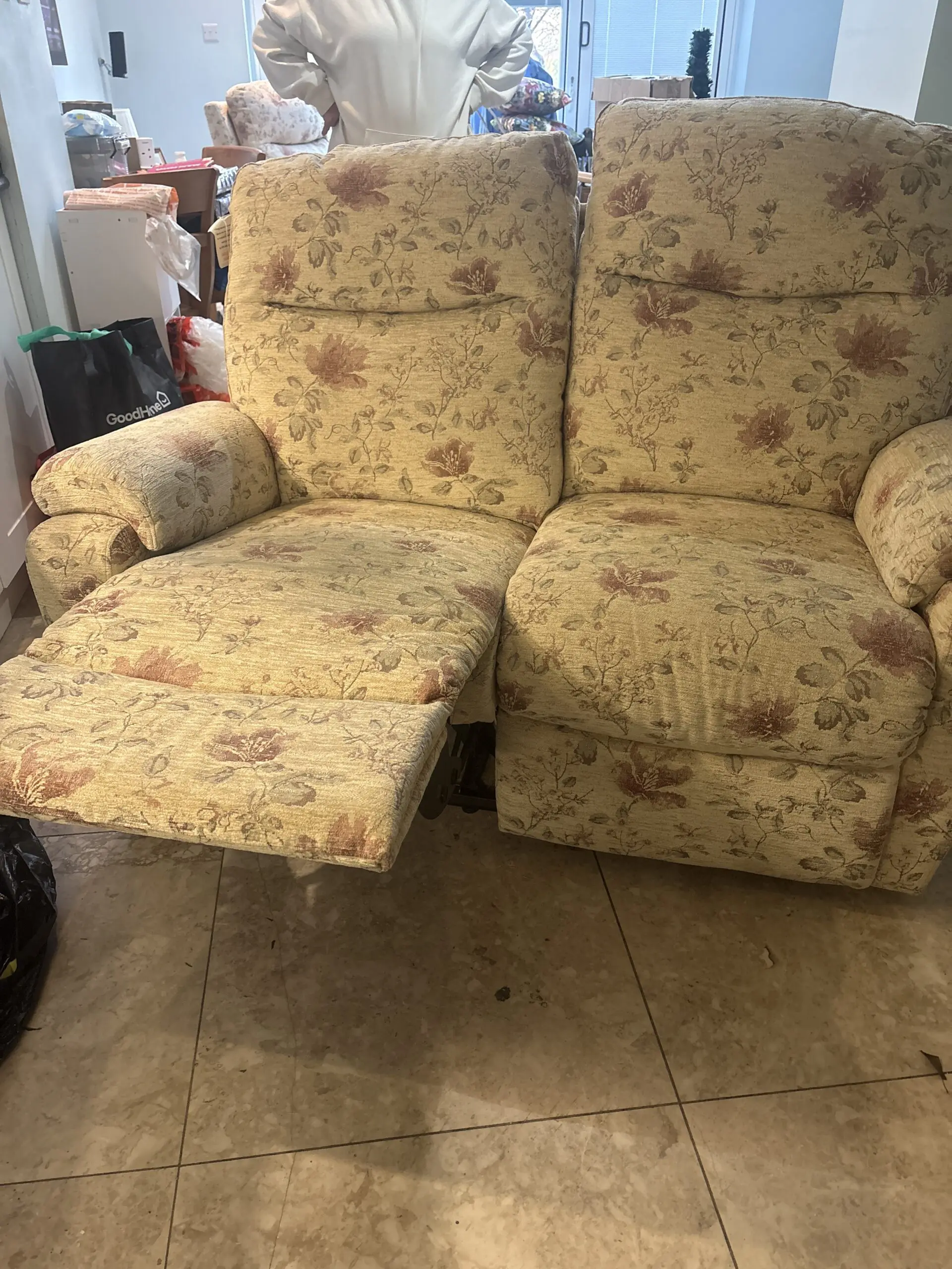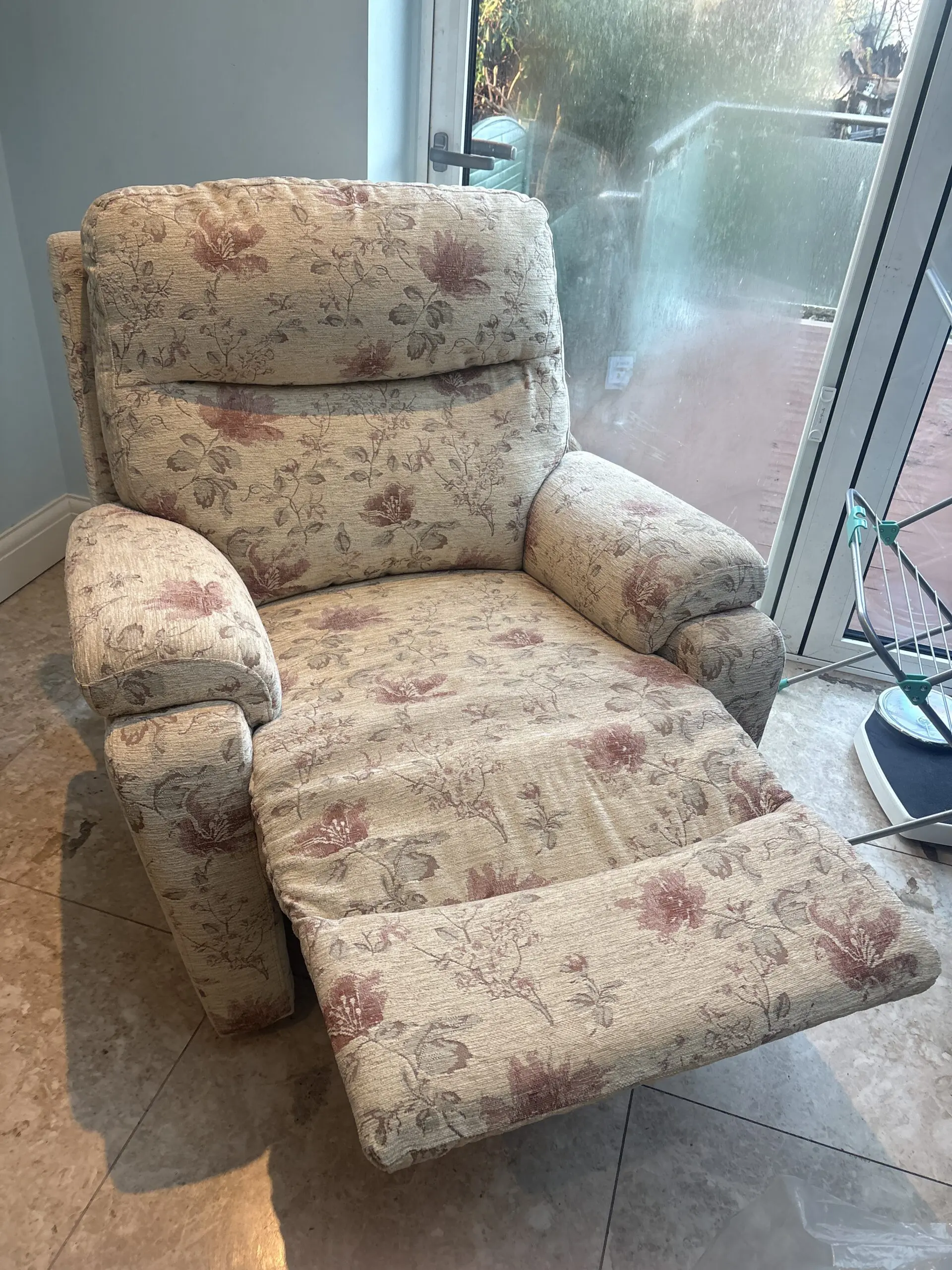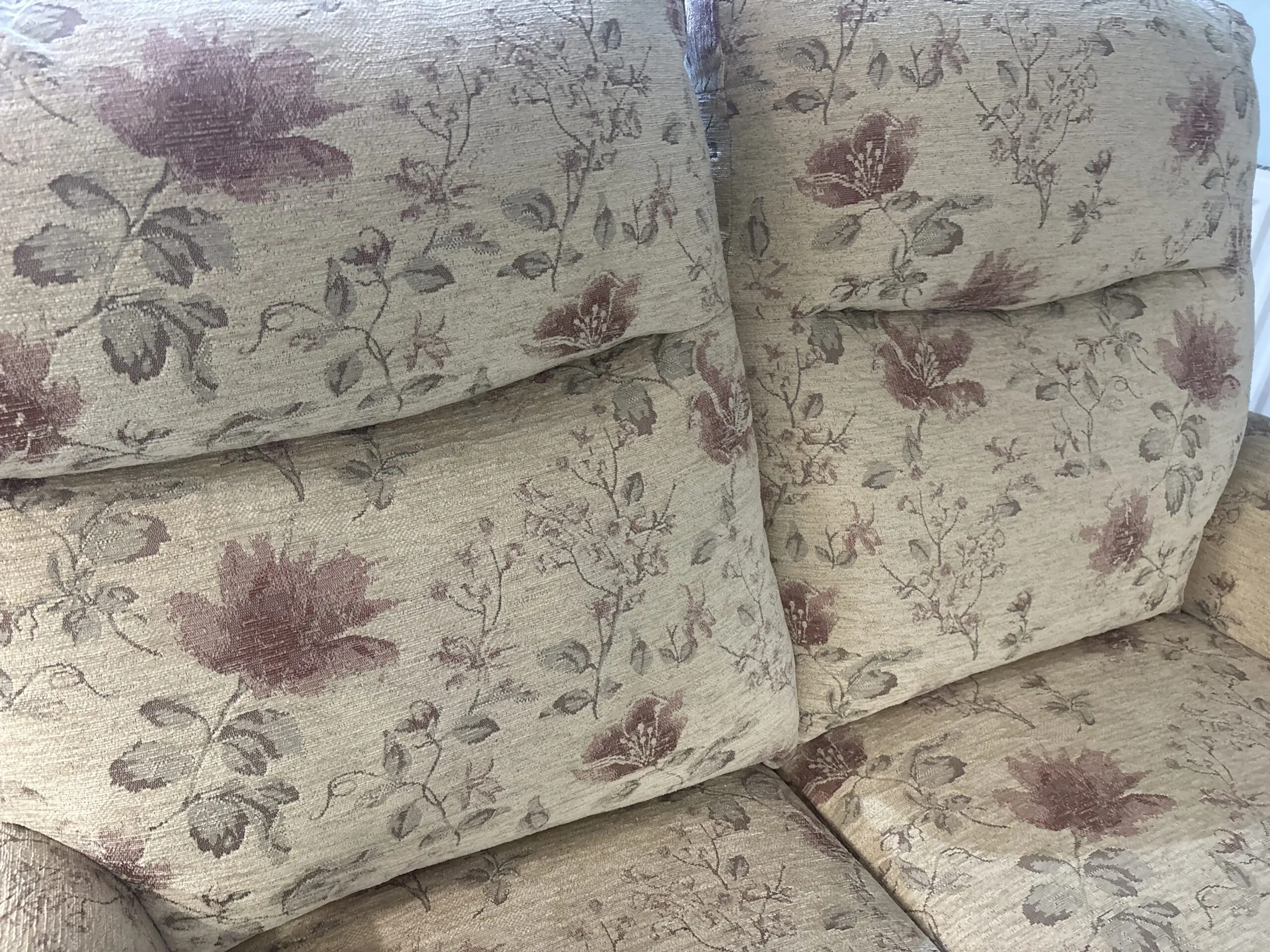 Two seater + arm chair. Beige floral. Recliner. Excellent condition as barely used.