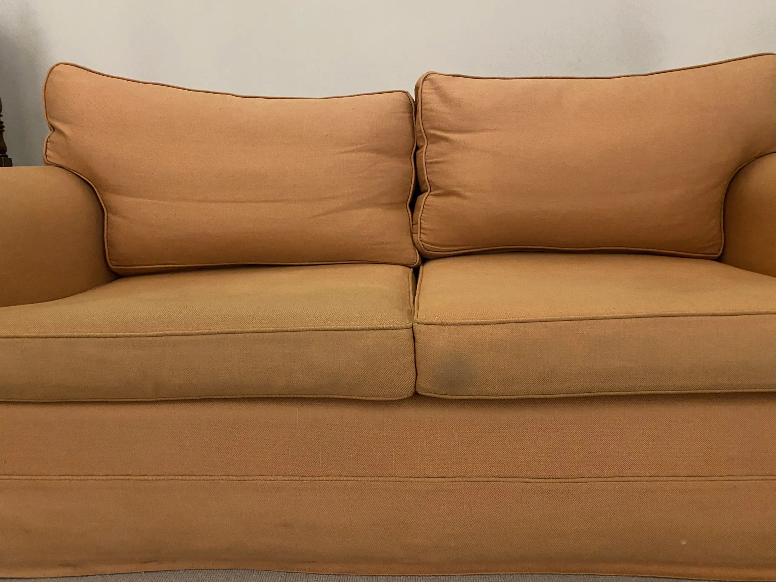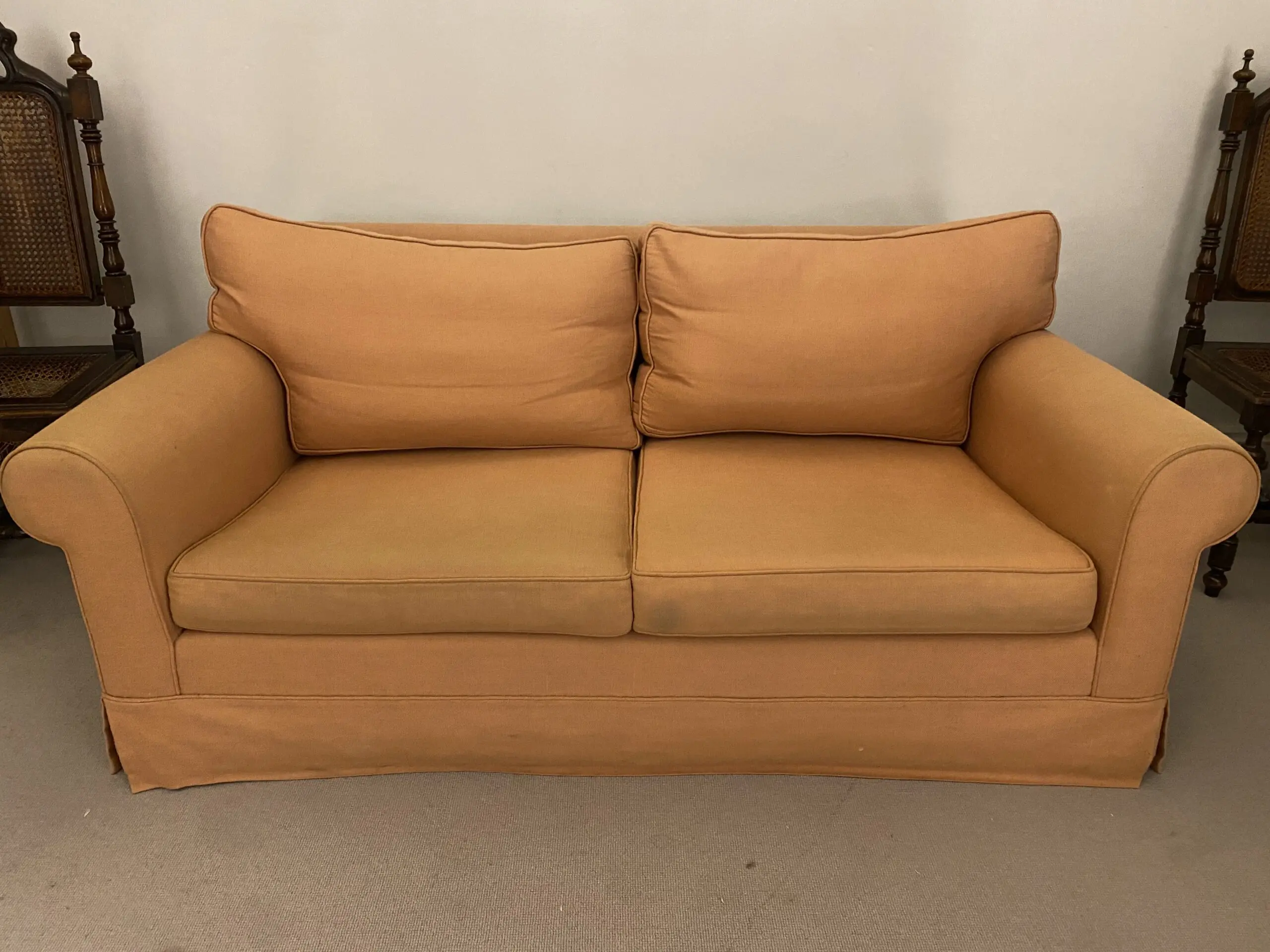A bespoke made two seater sofa, that easily fits three people. The cushions are feather filled, so super comfy. The seats are sponge, so they spring back after sitting. Classic rolled arms, skirted base, and removable seat/back cushions for easy cleaning. Comfortable and well-built.