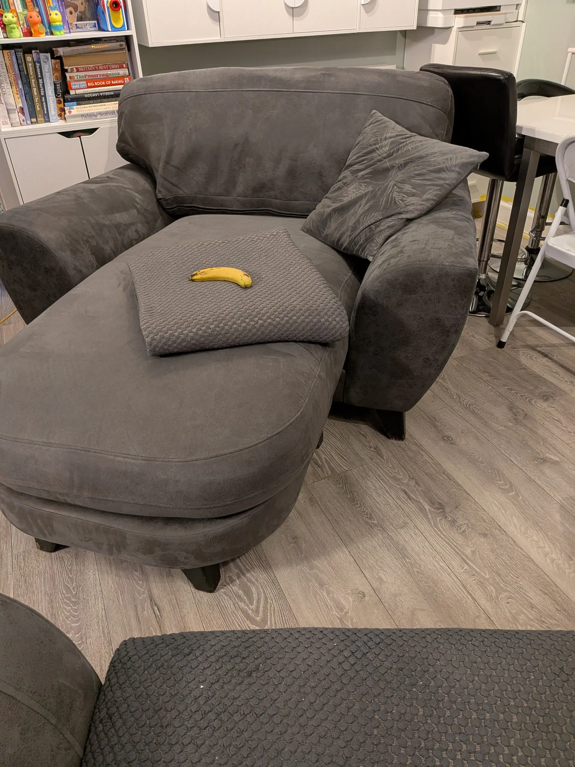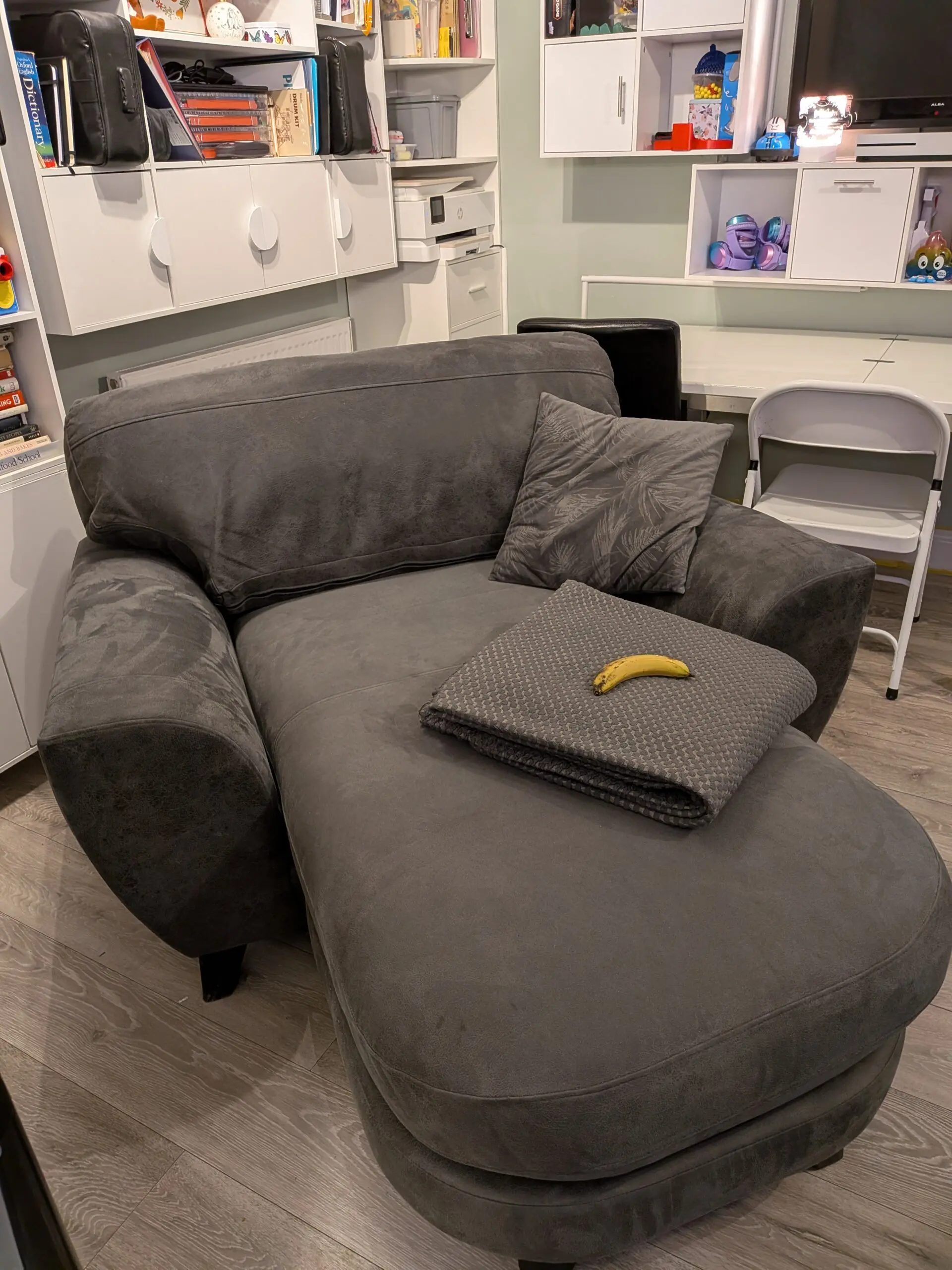 Bespoke one and a half seater extended snuggle chair. Only 18 months old and in very good condition. Cost new £649. Few small marks but no real wear. Living room remodel forces sale. Exceptionally comfy. NOTE CUSHION, THROW AND BANANA (for scale) NOT INCLUDED.