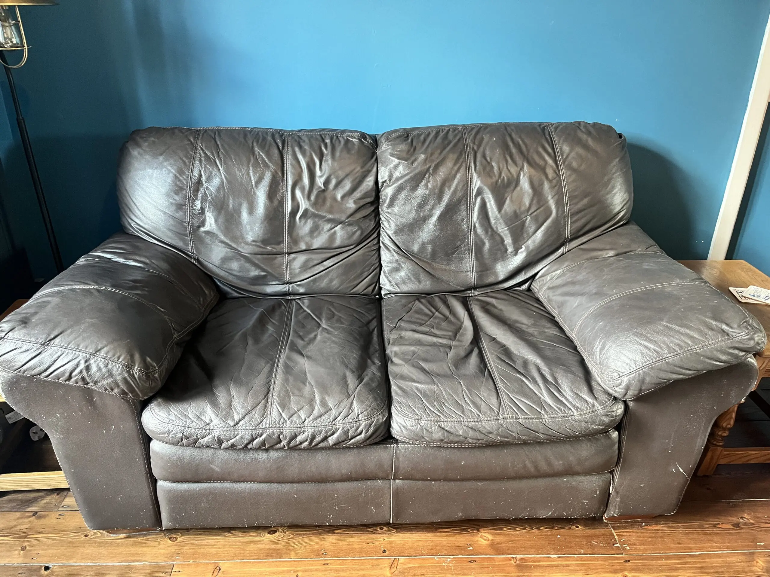 Comfy black leather 2 seater sofa in fair condition, from pet-free and smoke-free home.