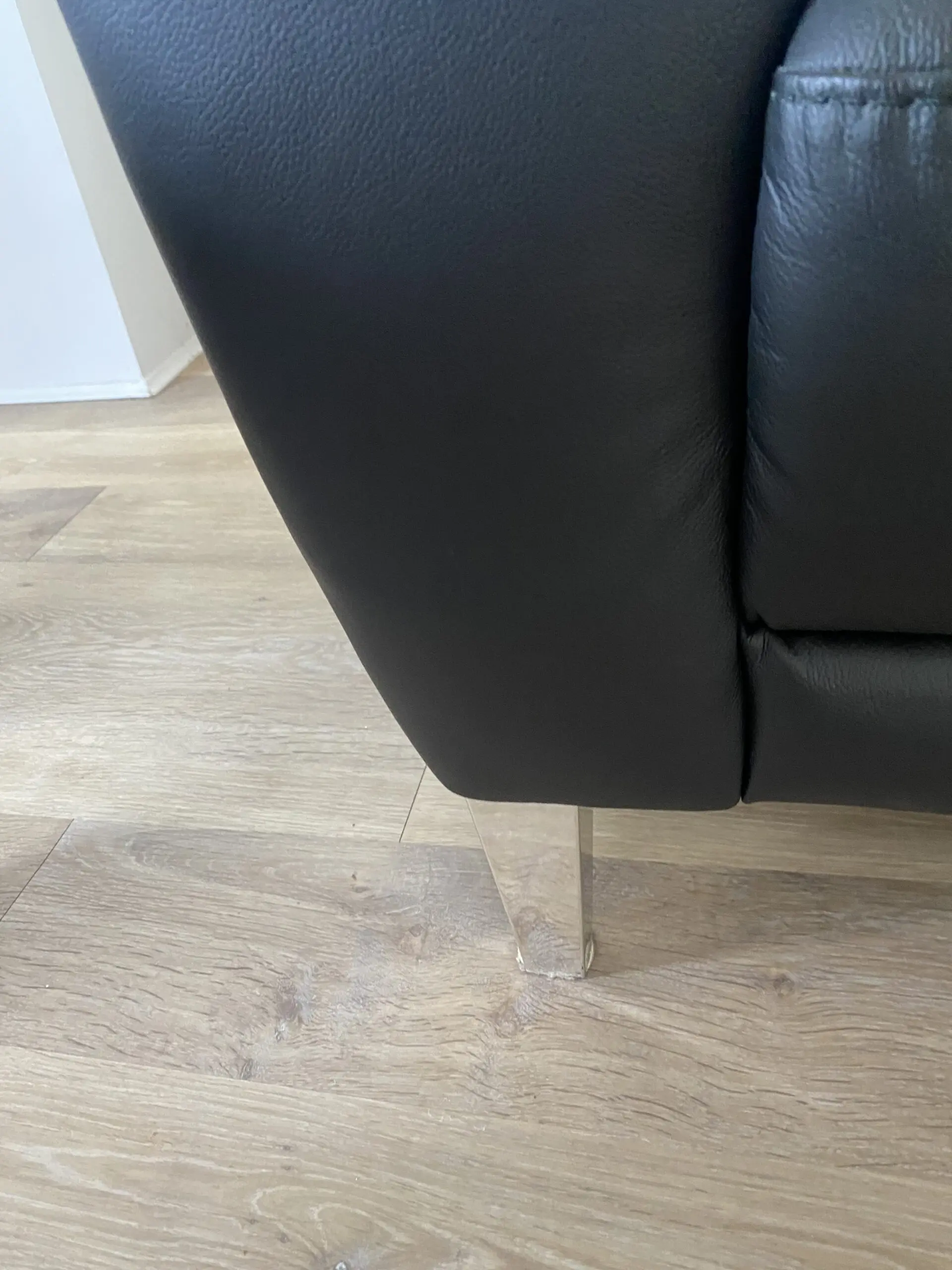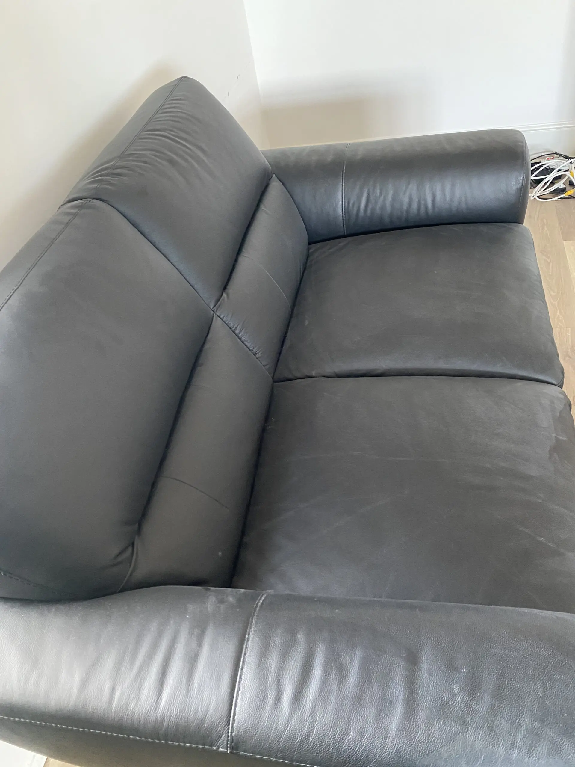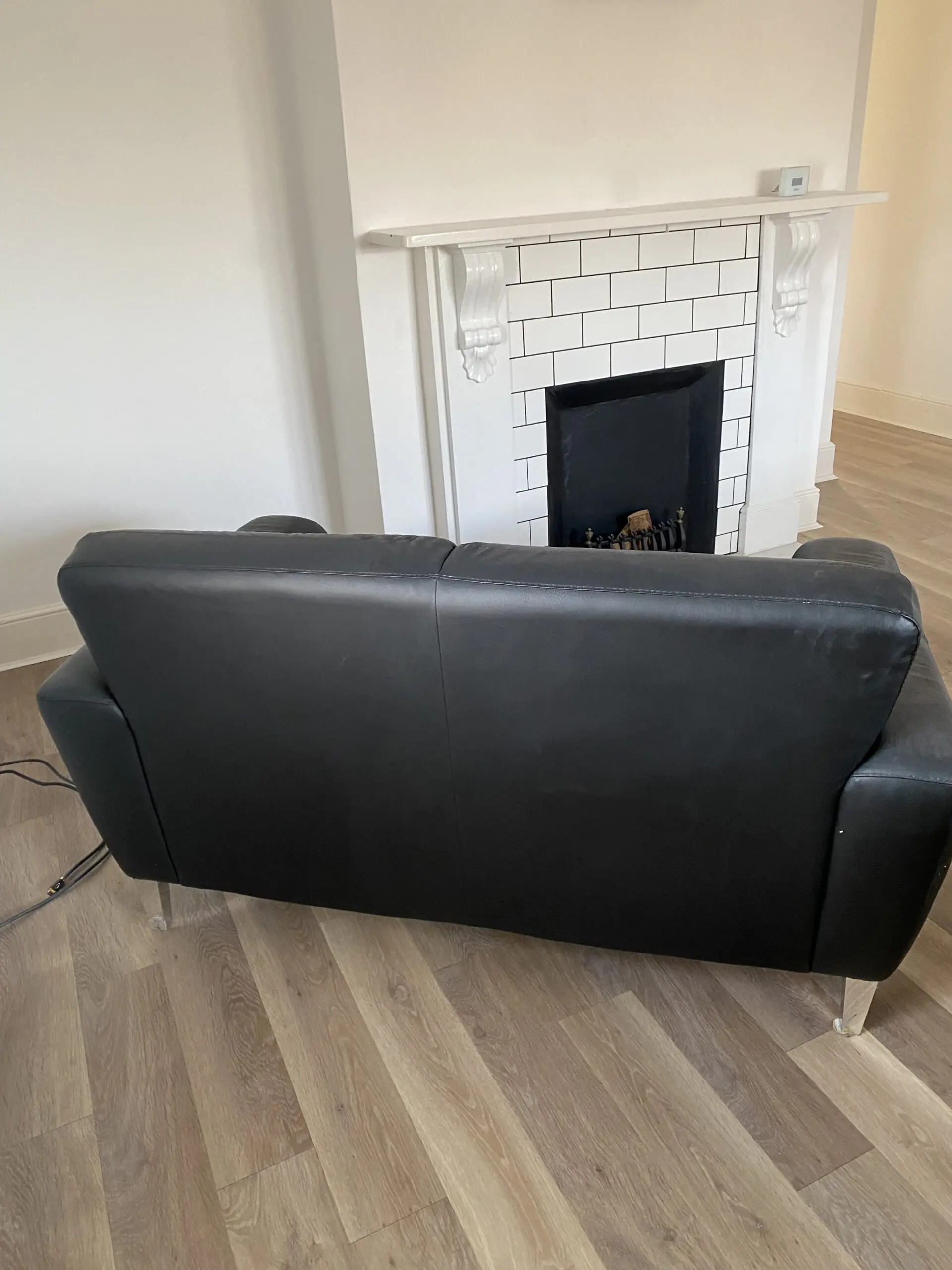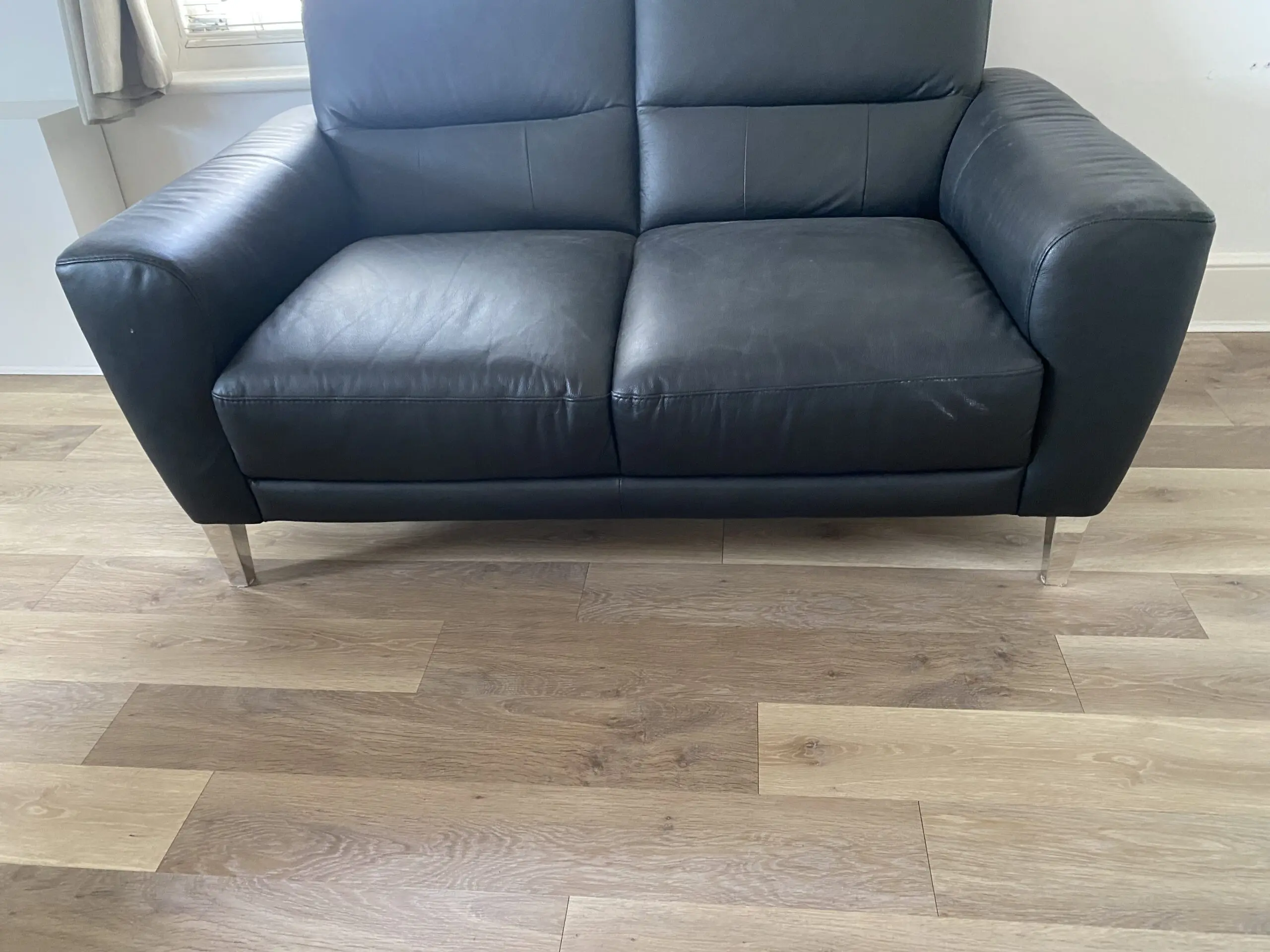 Contemporary large 2-seater sofa with cushioned back and seat. Chrome feet. Fully fire retardant to meet UK safety regulations. Upholstered in soft black leather. One year old. Excellent condition.