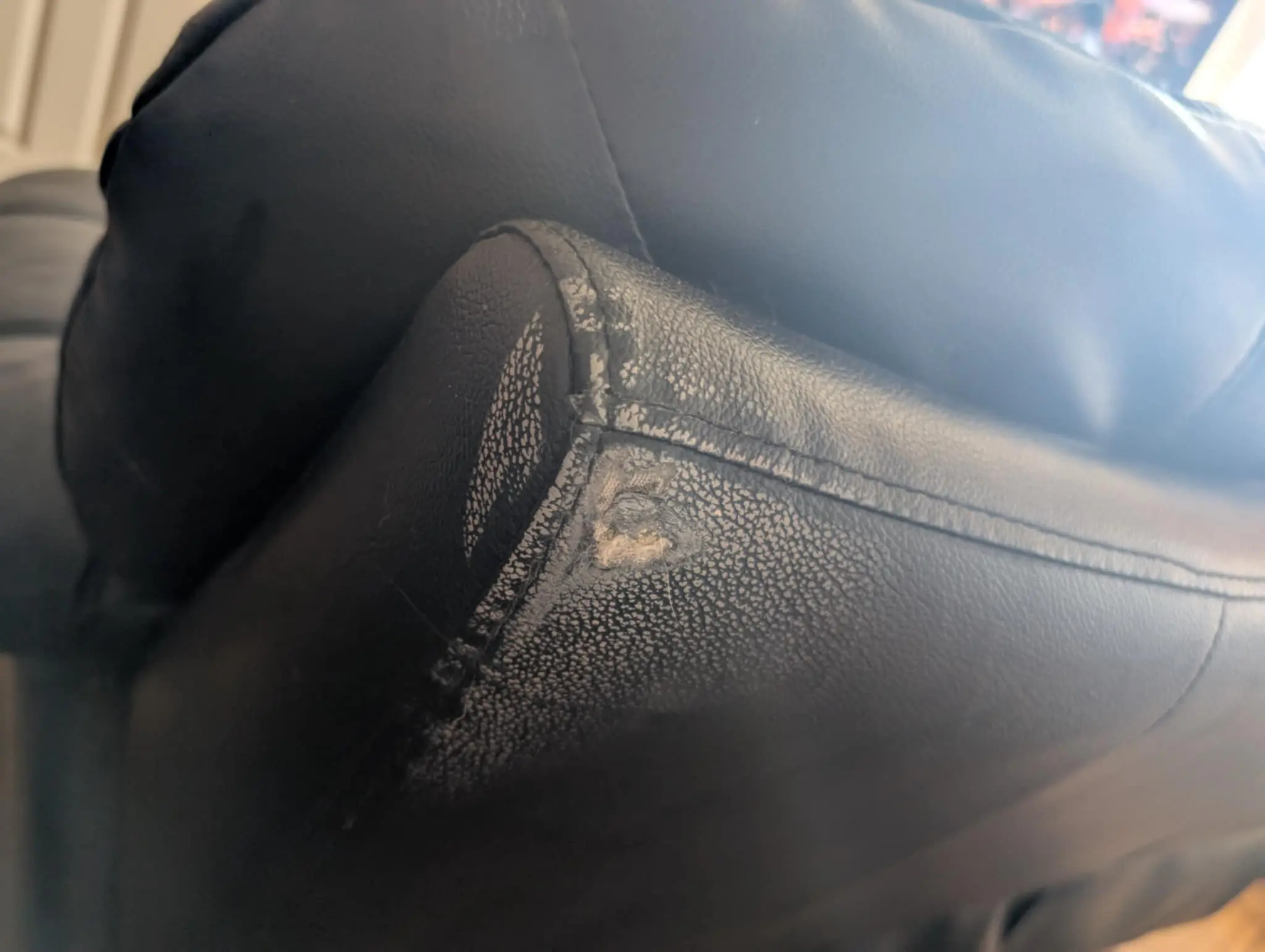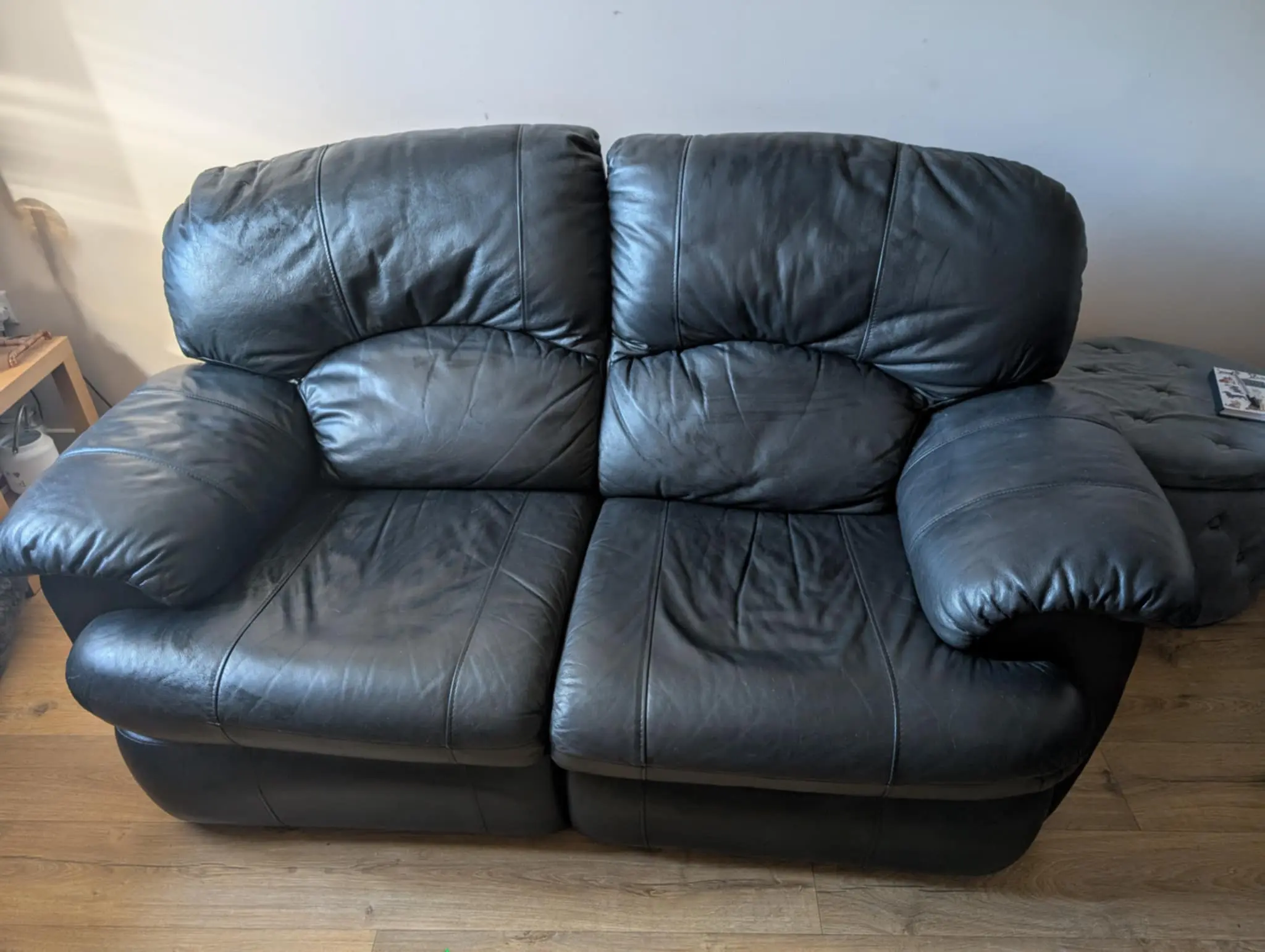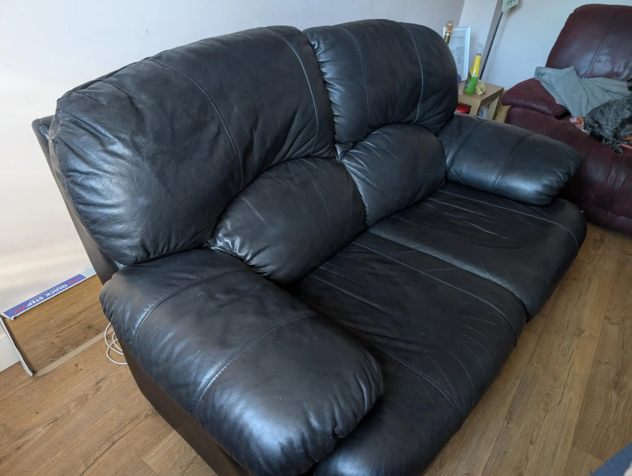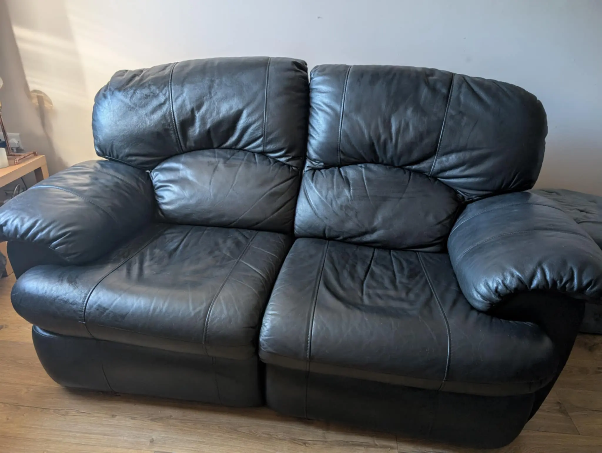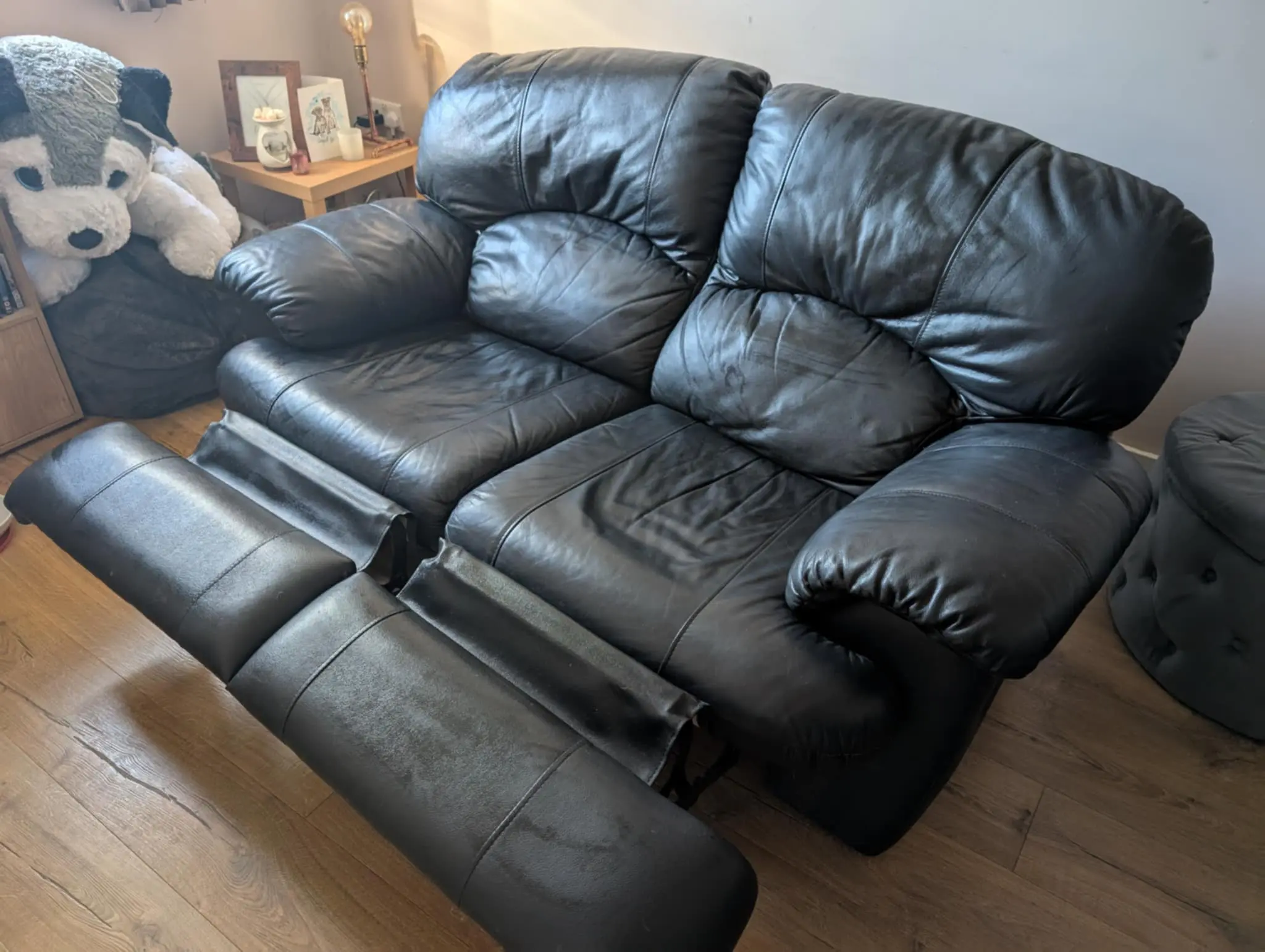 Two seater black recliner sofa. Has some small wear and tear. In fair condition. Both recliners work well. Selling due to moving house.