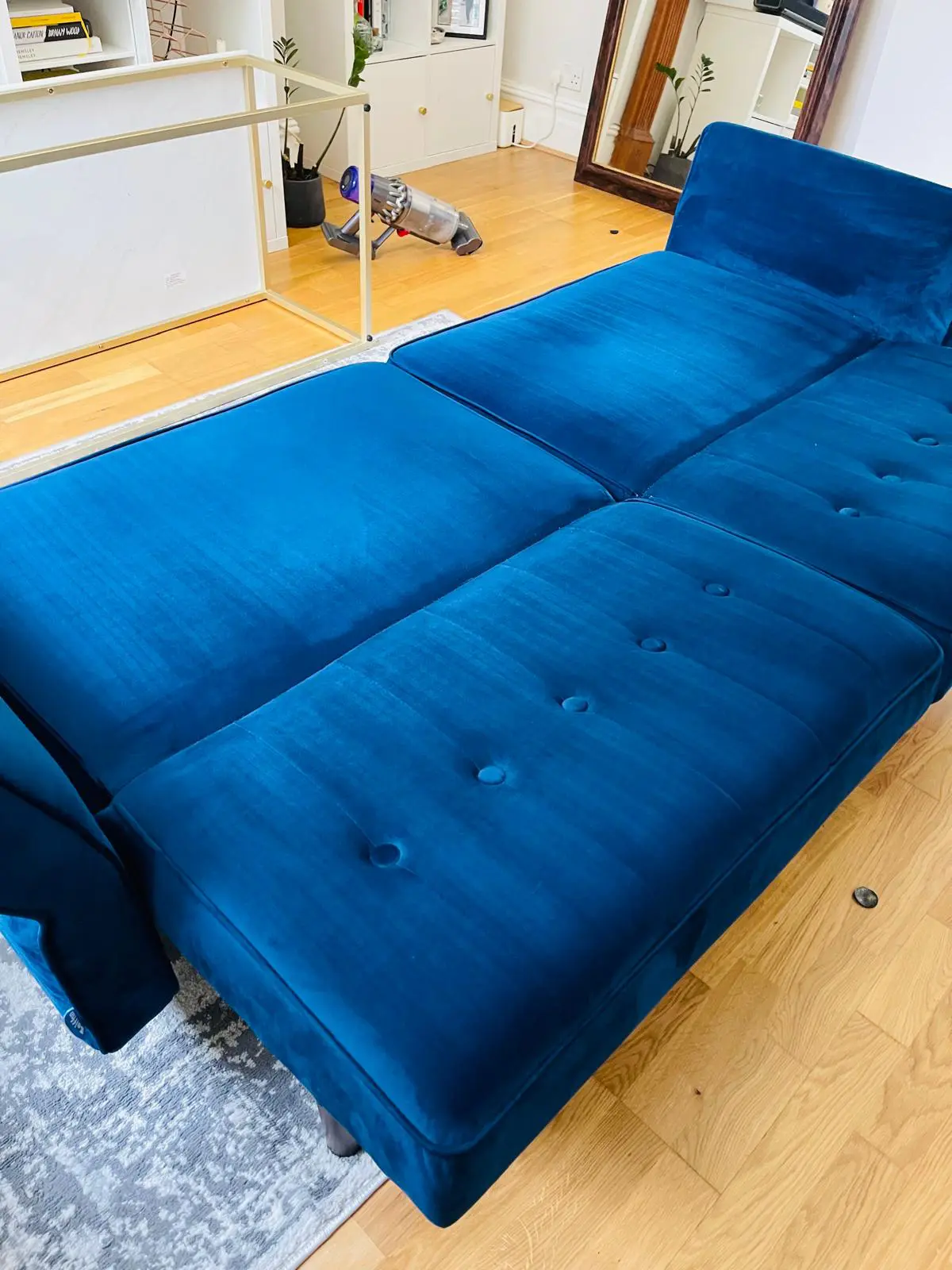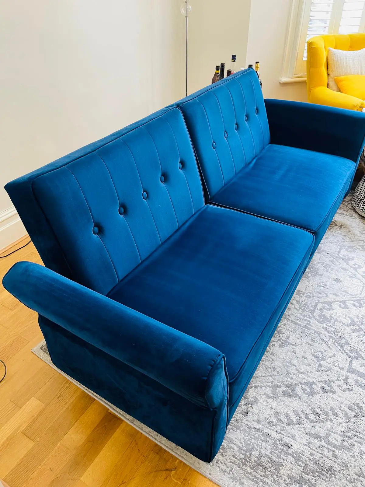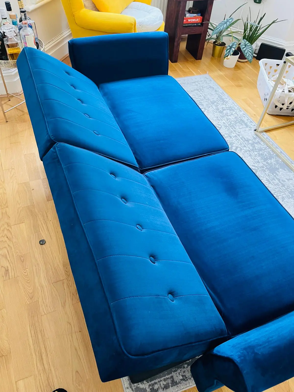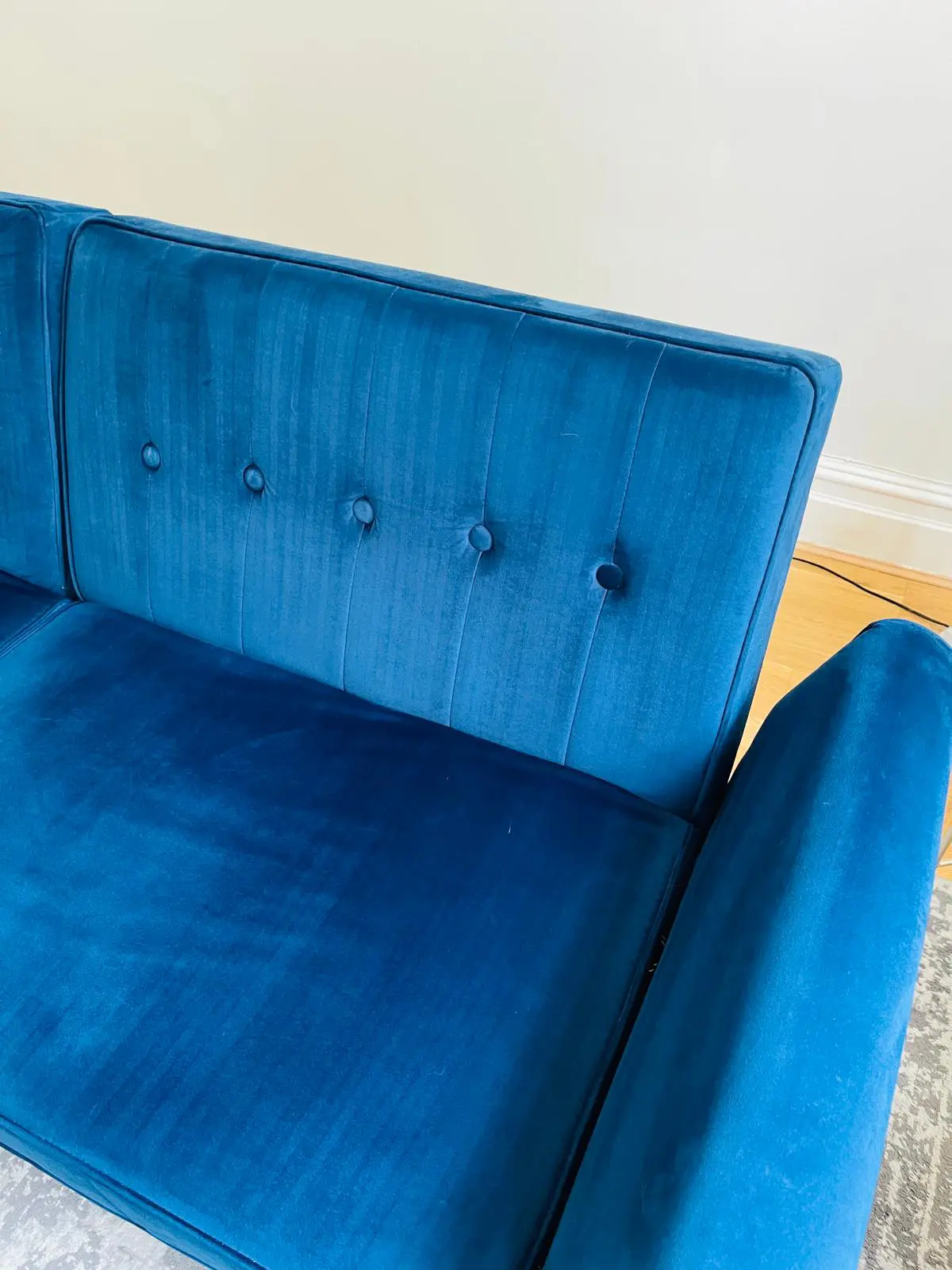 Blue velvet sofa bed in excellent condition. Reclining back rest. Opens up to a bed .