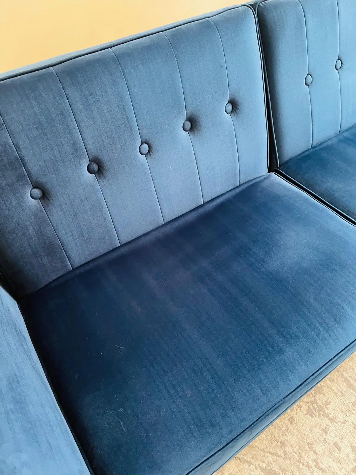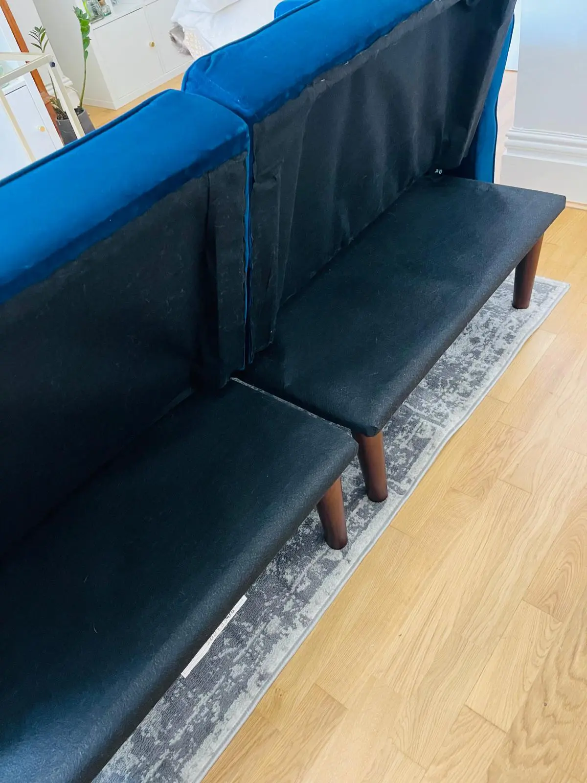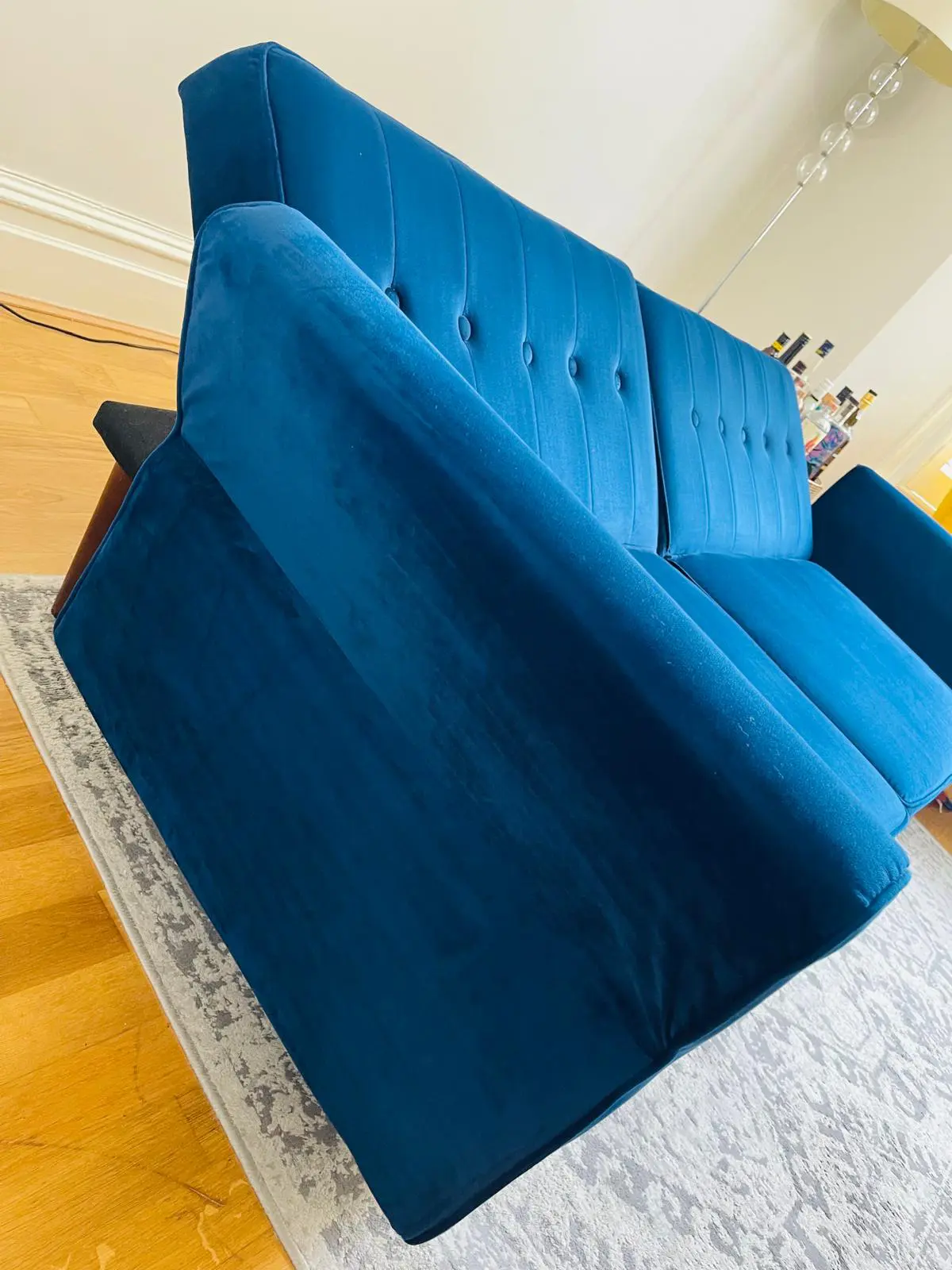 Blue velvet sofa bed in excellent condition. Reclining back rest. Opens up to a bed .