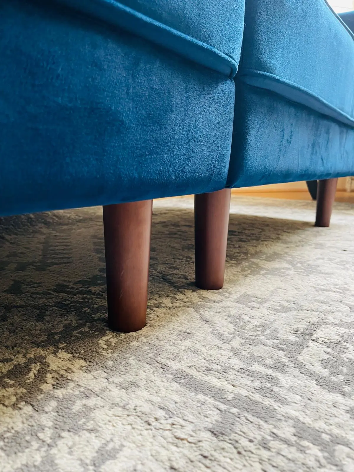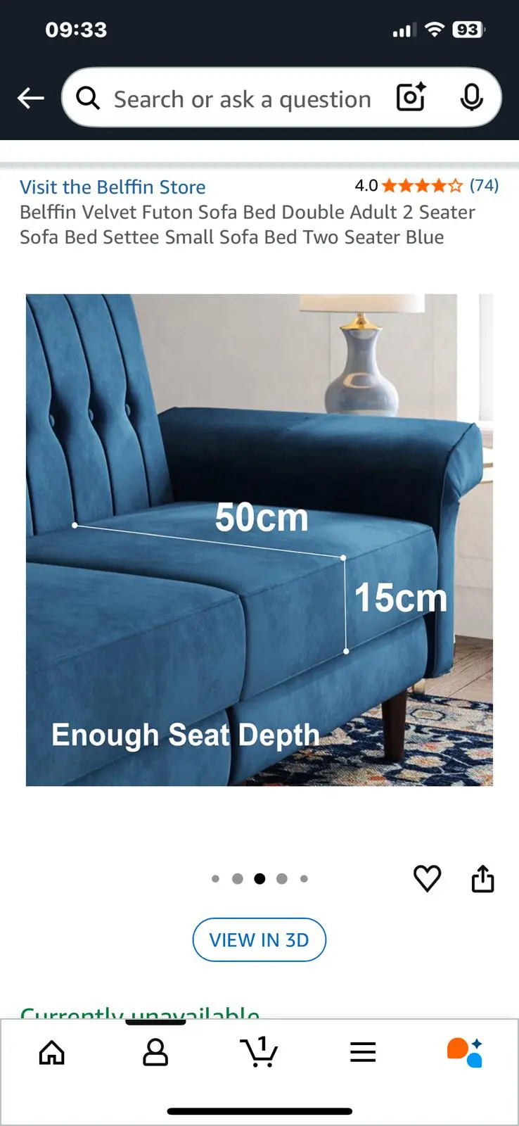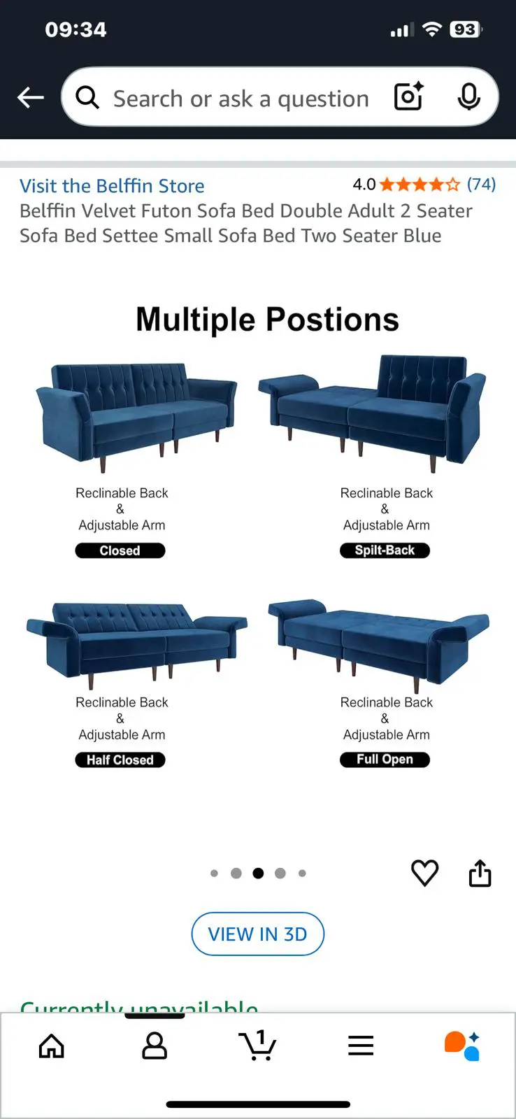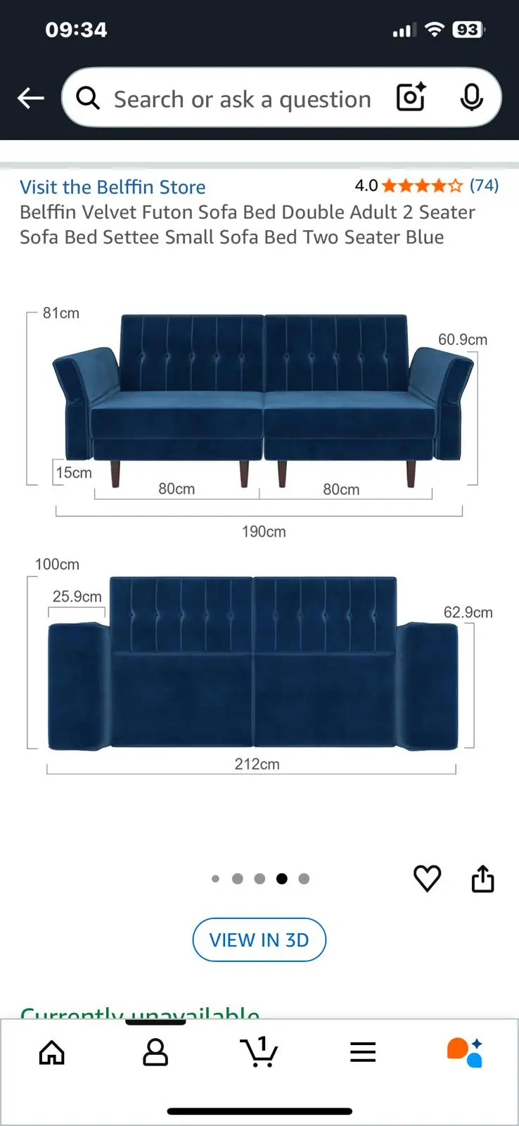 Blue velvet sofa bed in excellent condition. Reclining back rest. Opens up to a bed .