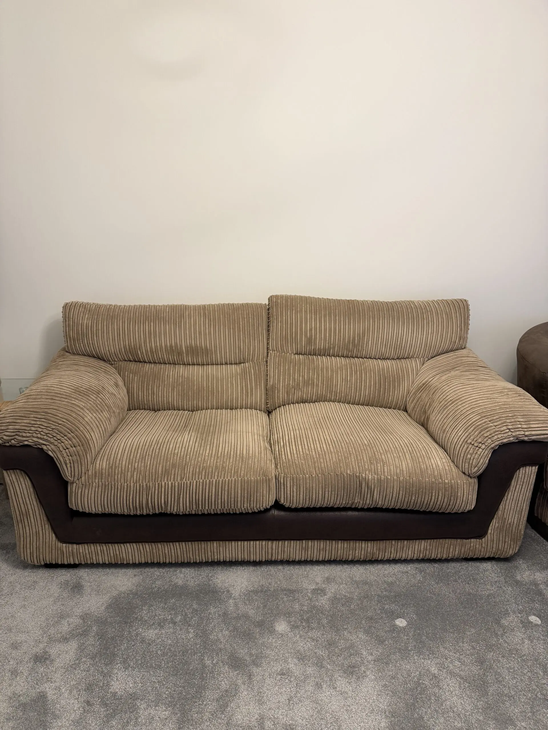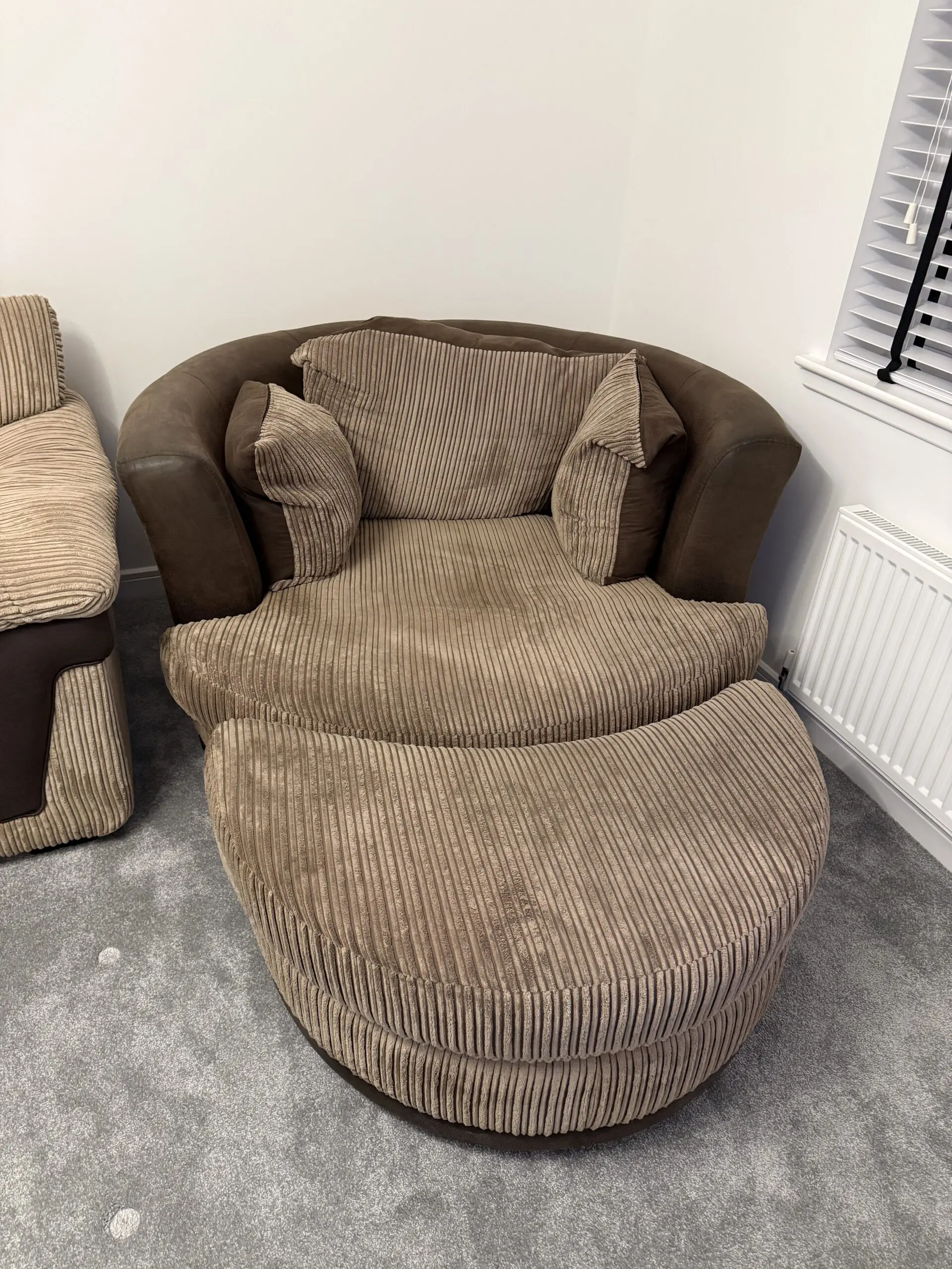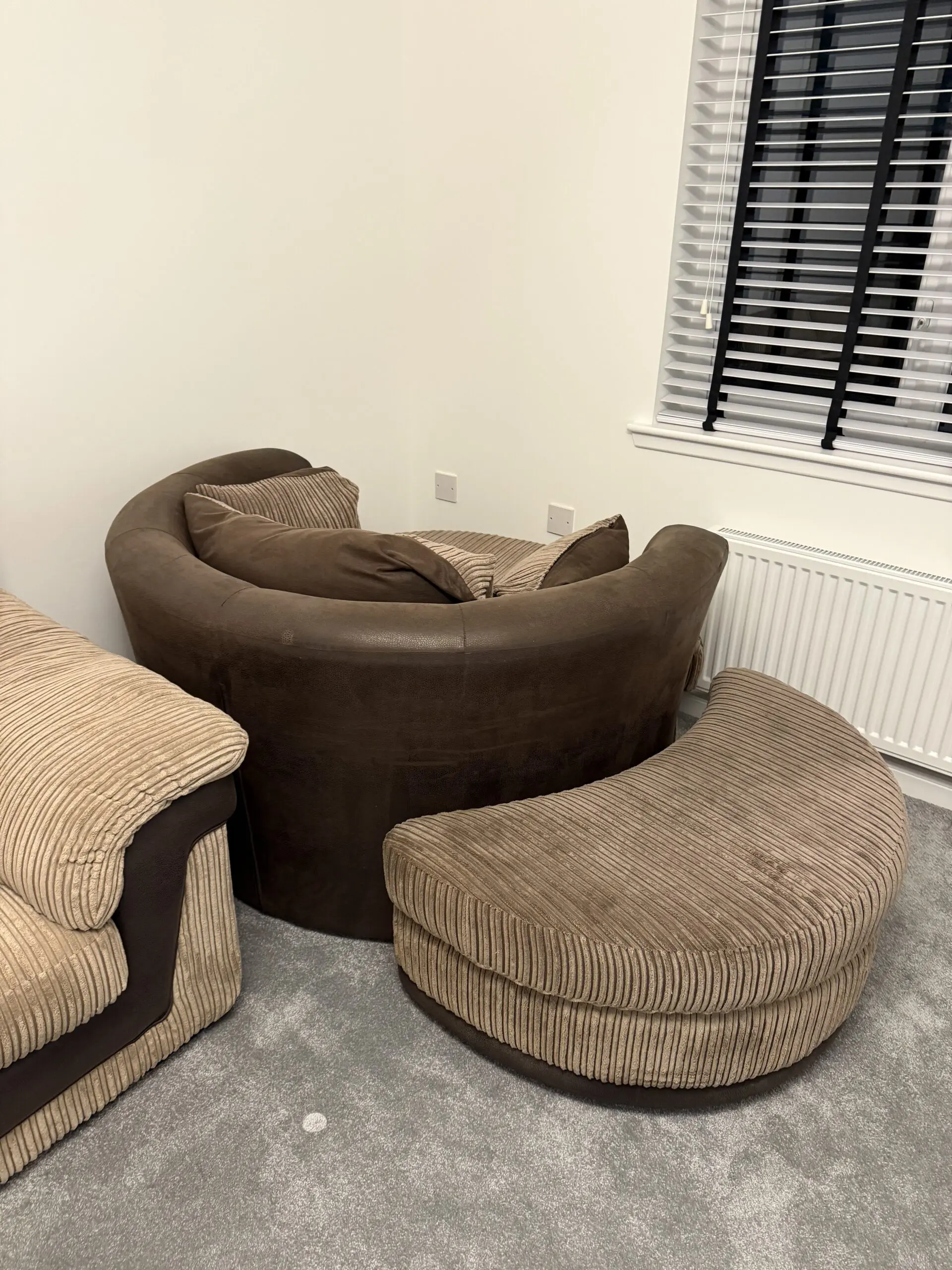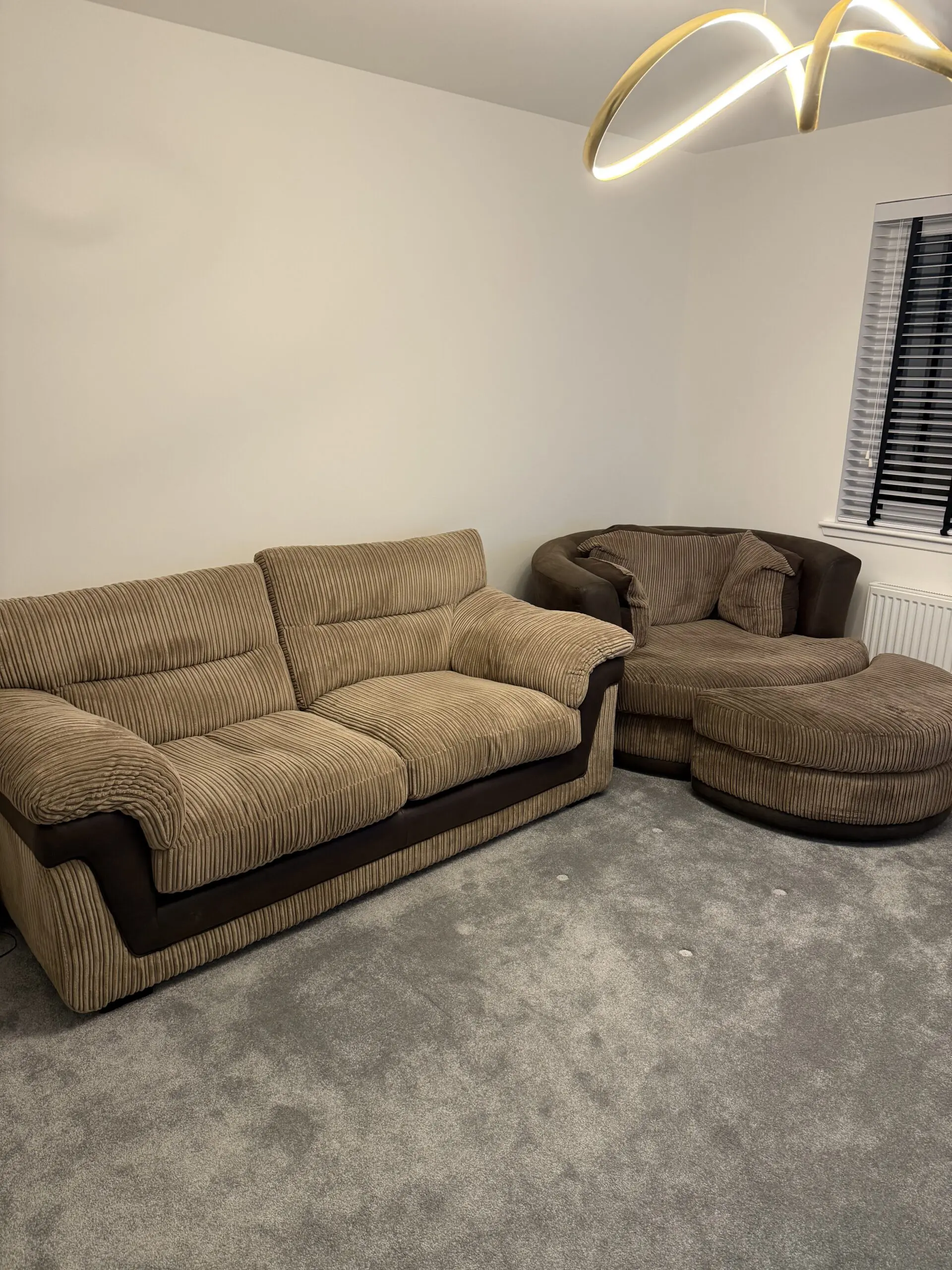 Gently used 3 seater brown sofa and matching corner chairs with pouffe leg rest. The sofa and corner chairs are very comfortable and the corner chairs can swivel round. It will also include cushions shown in photos.