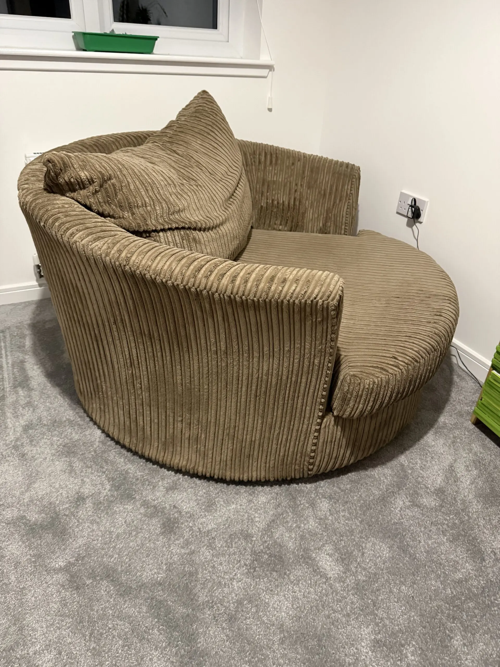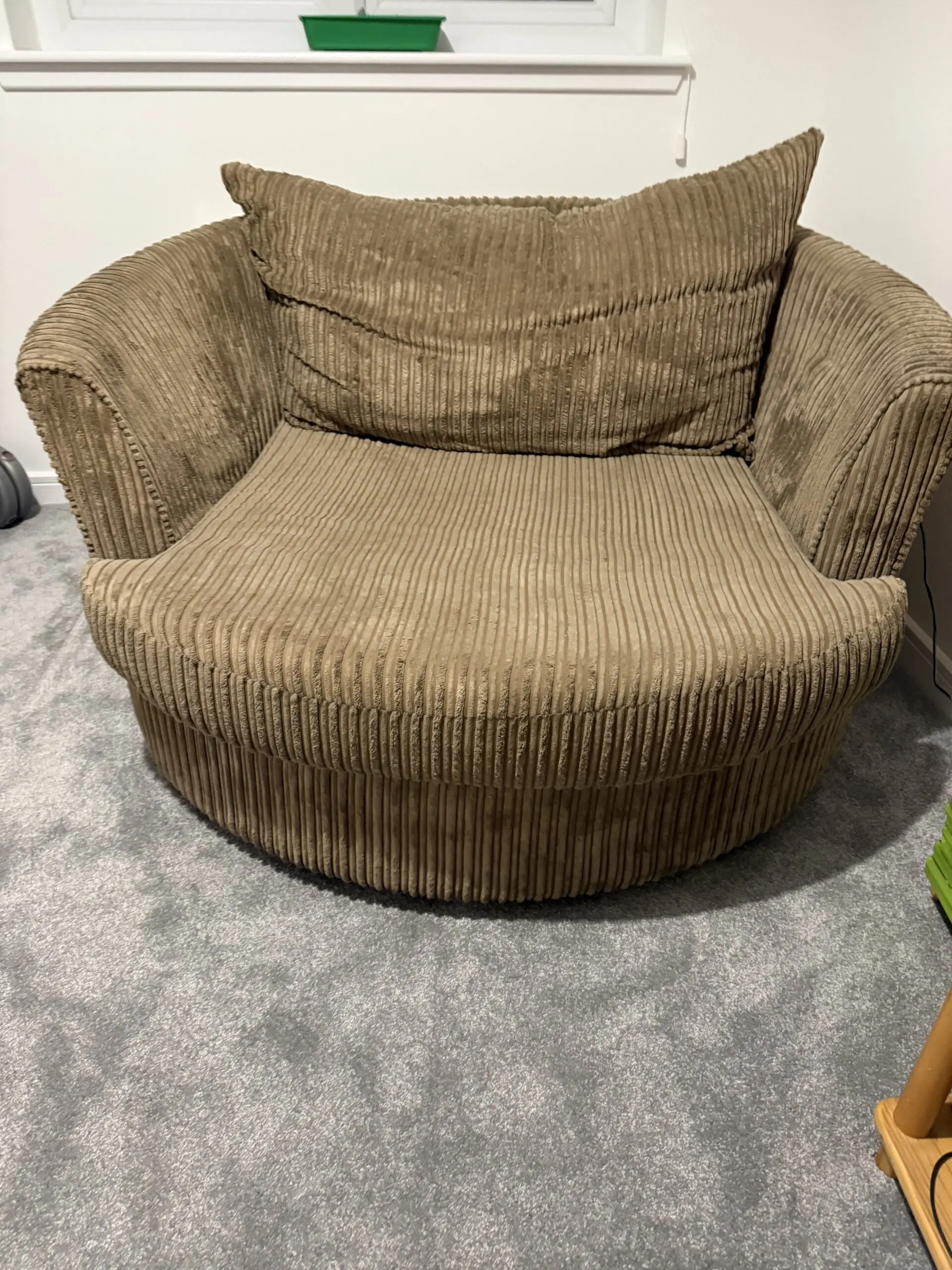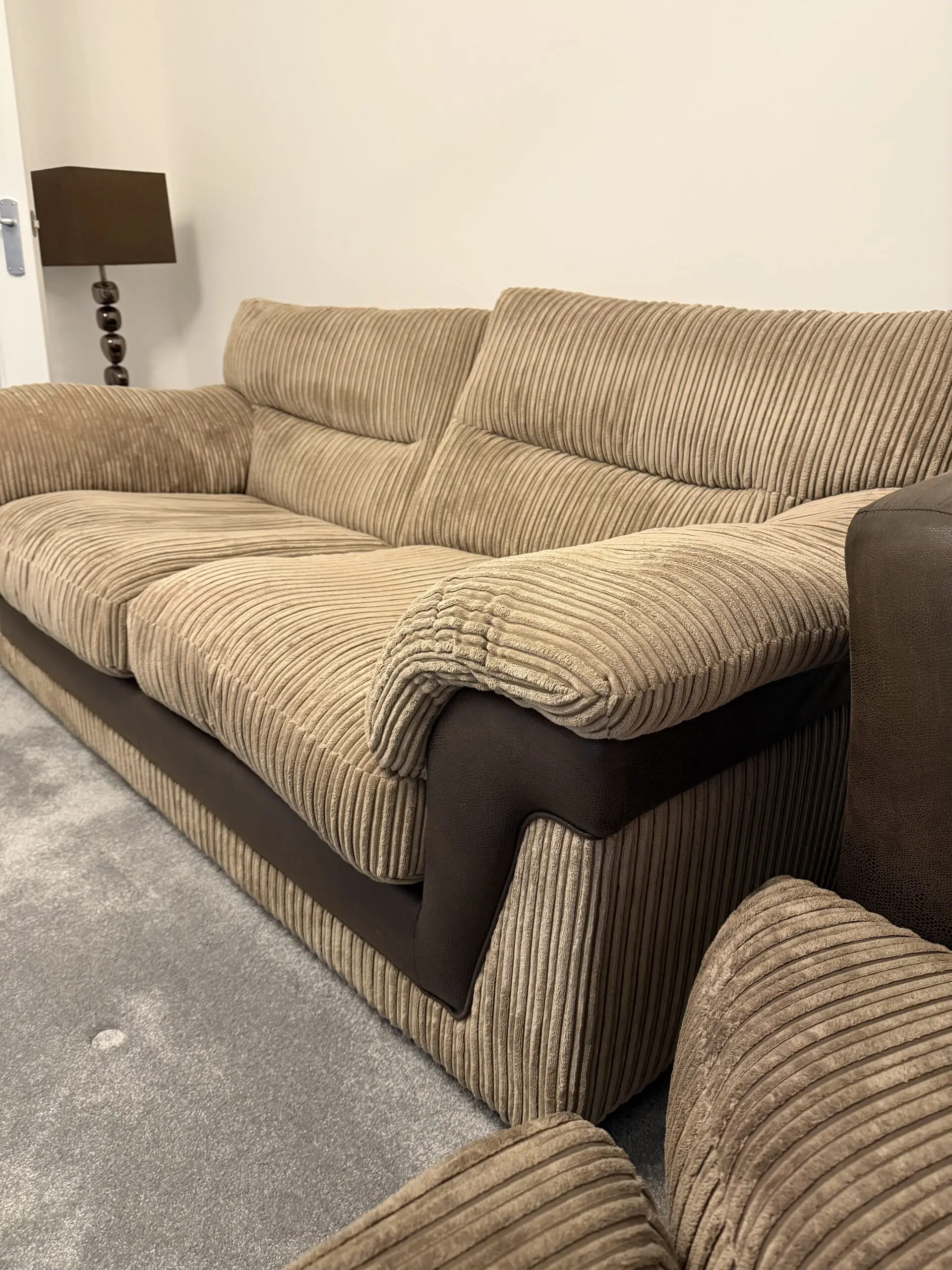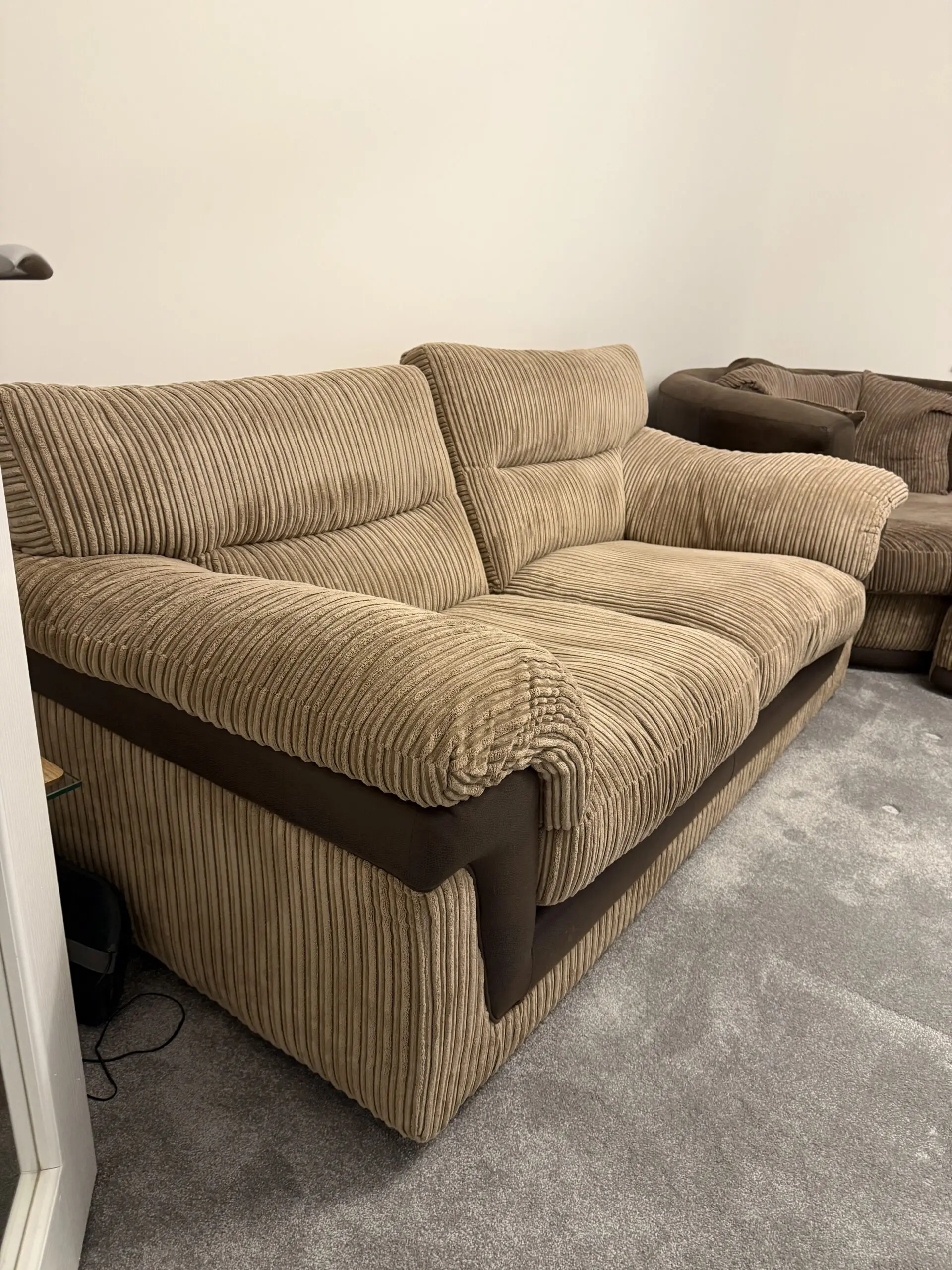Gently used 3 seater brown sofa and matching corner chairs with pouffe leg rest. The sofa and corner chairs are very comfortable and the corner chairs can swivel round. It will also include cushions shown in photos.