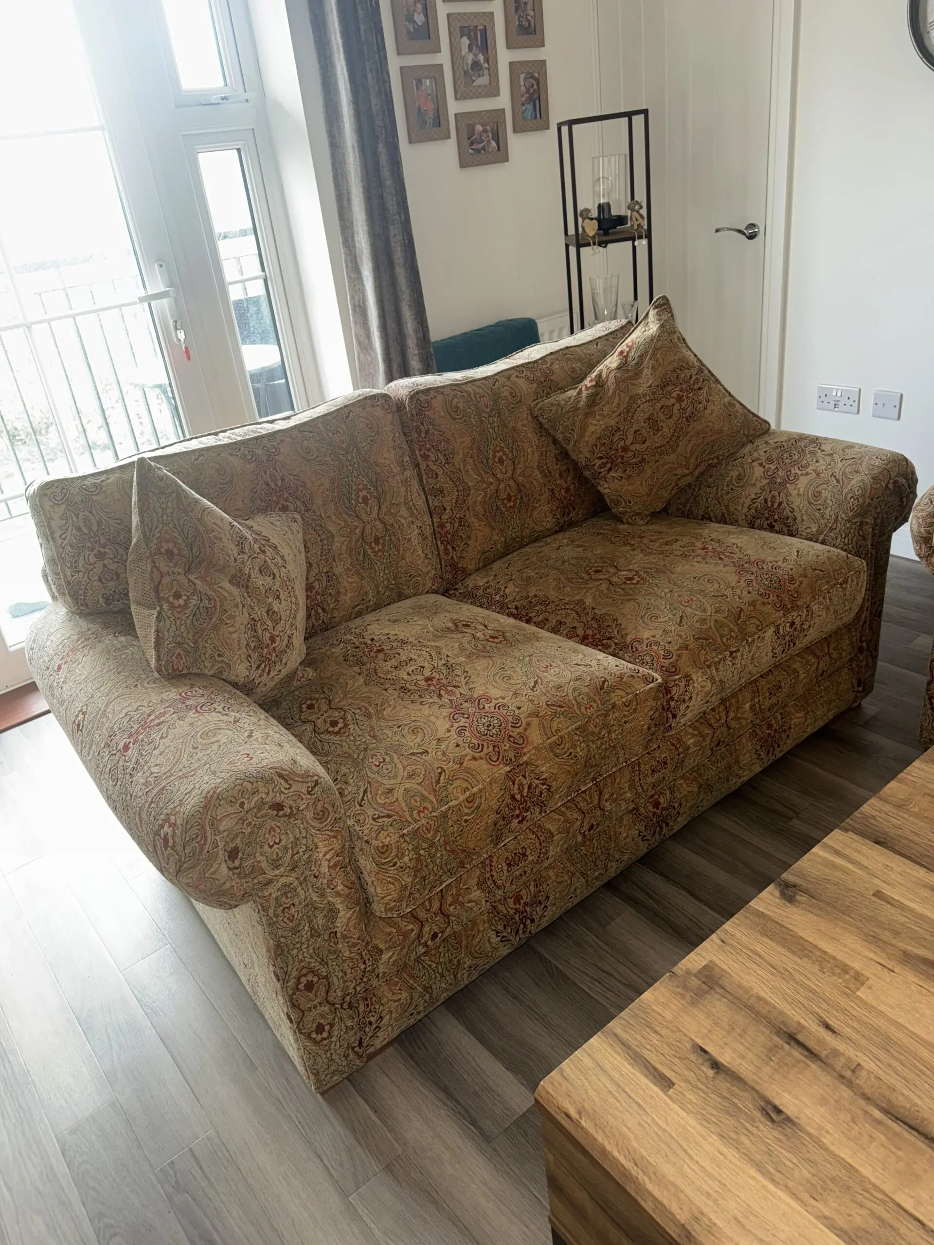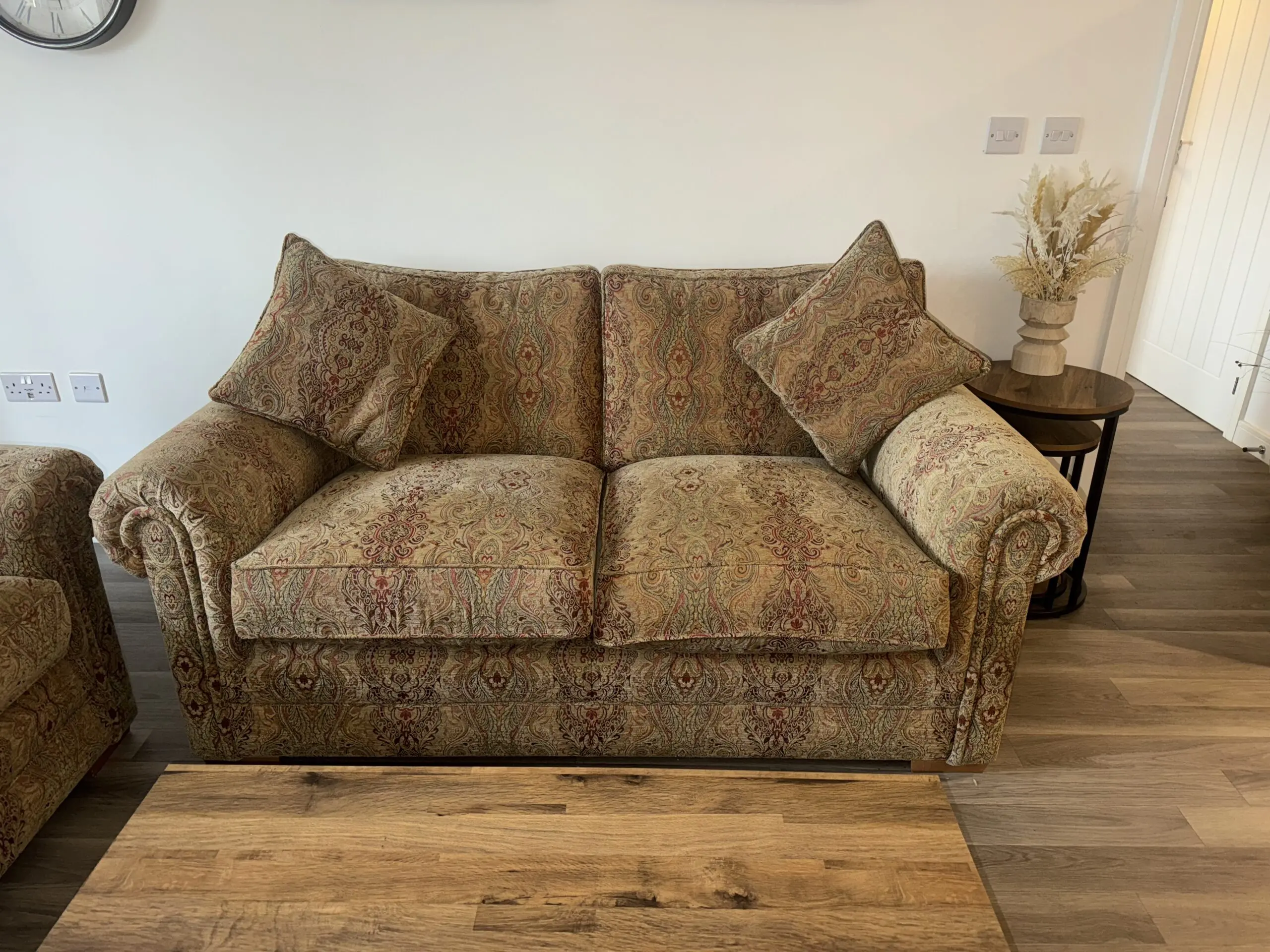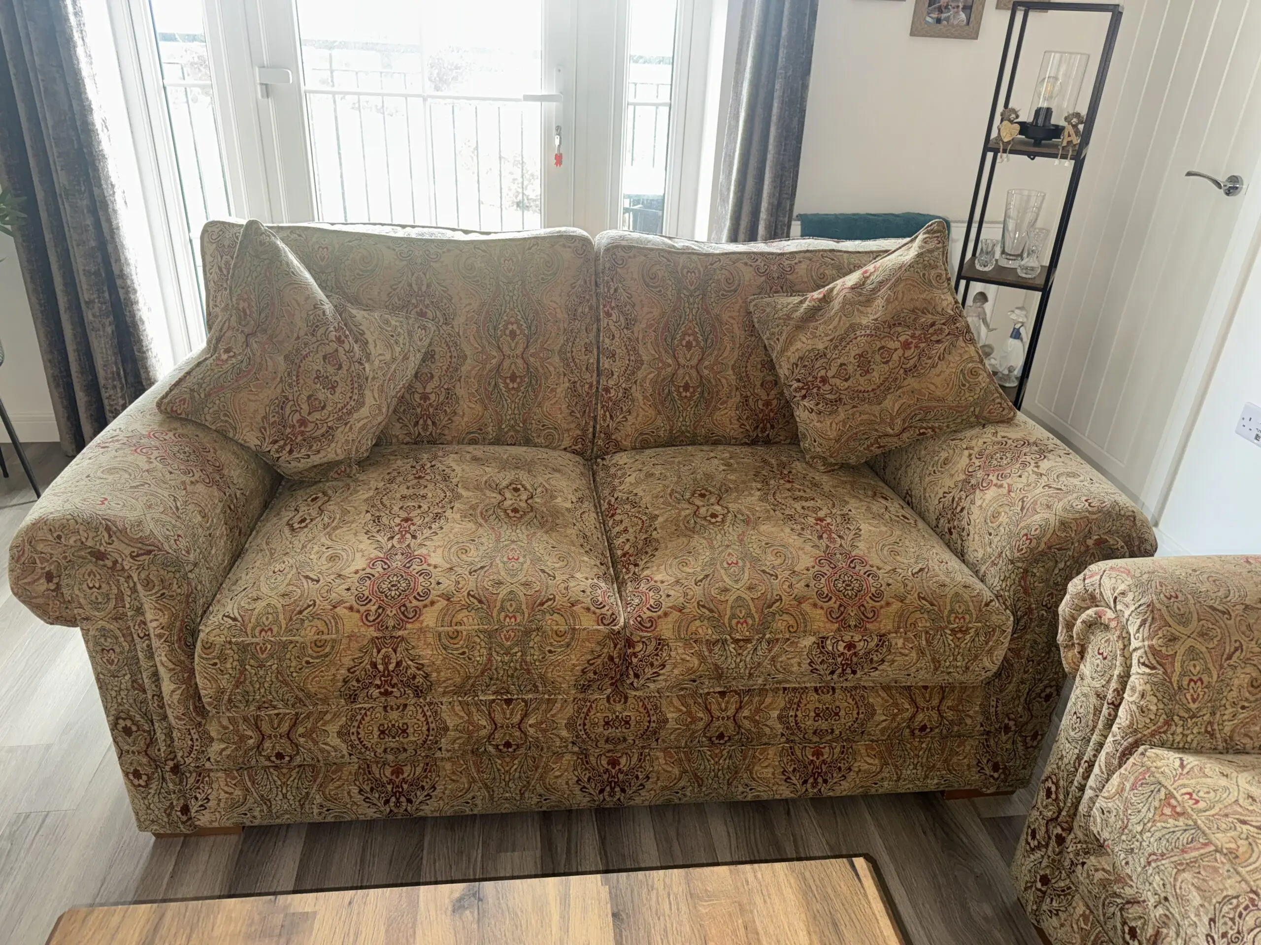 Unsure of the brand as these belonged to my mum but 2 x 2 seater sofas. In great condition with matching sofa cushions.