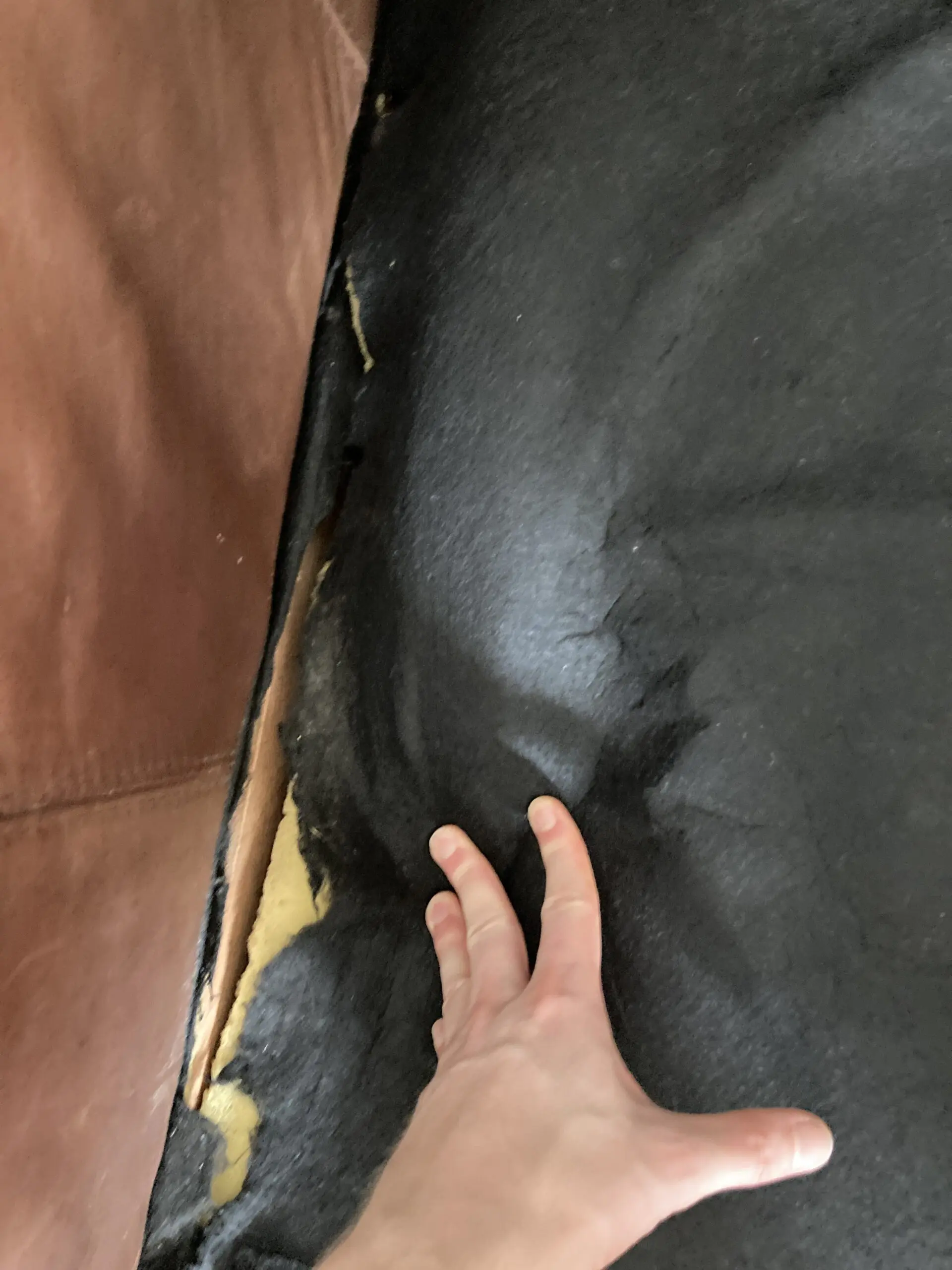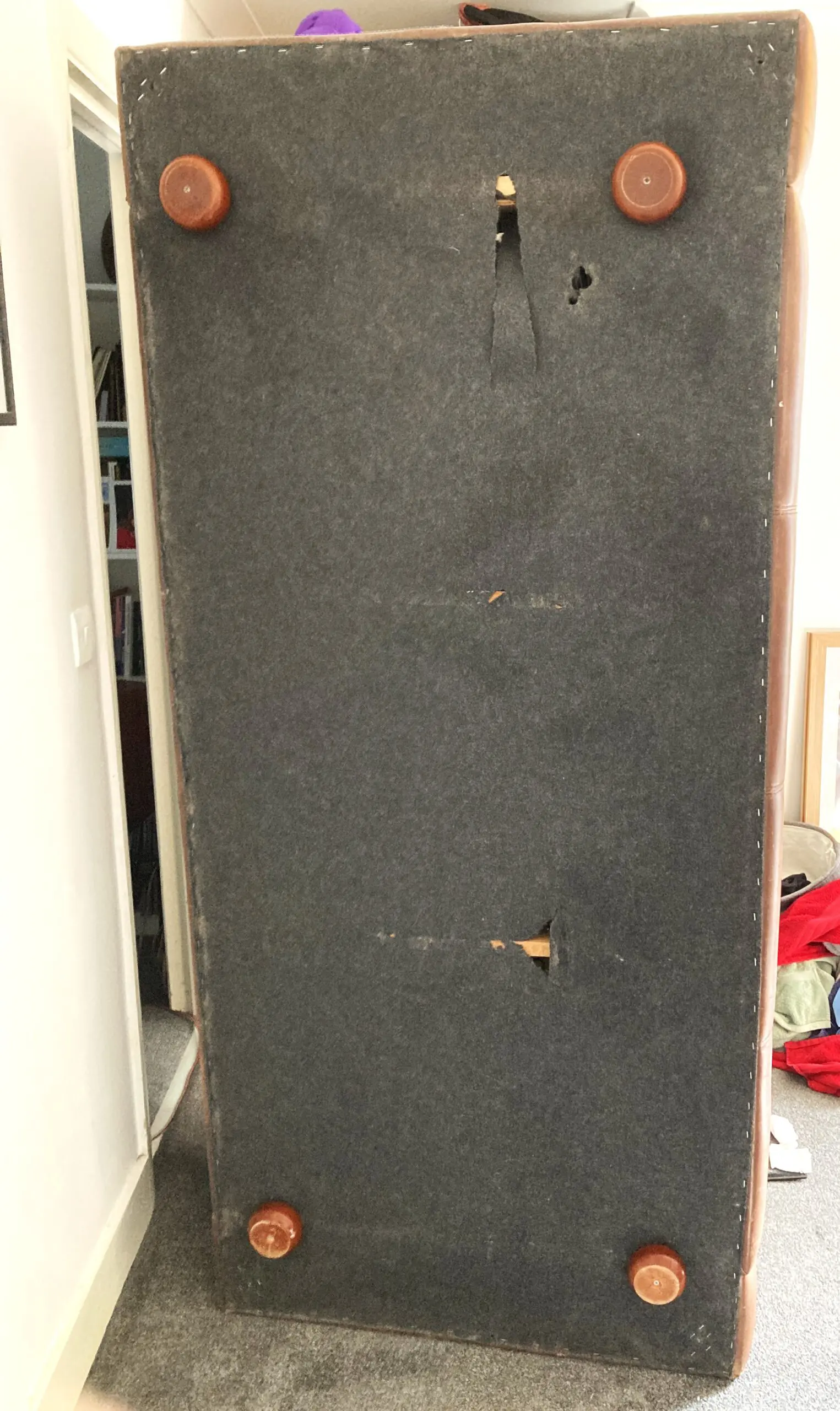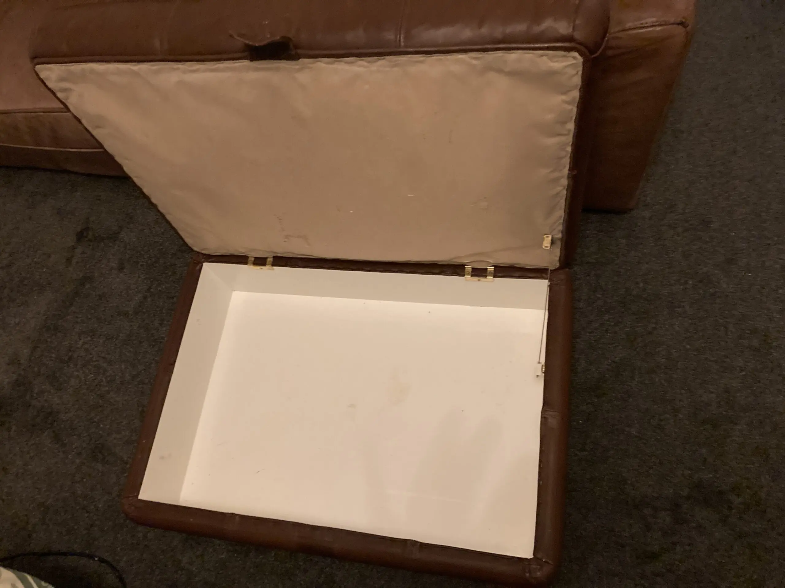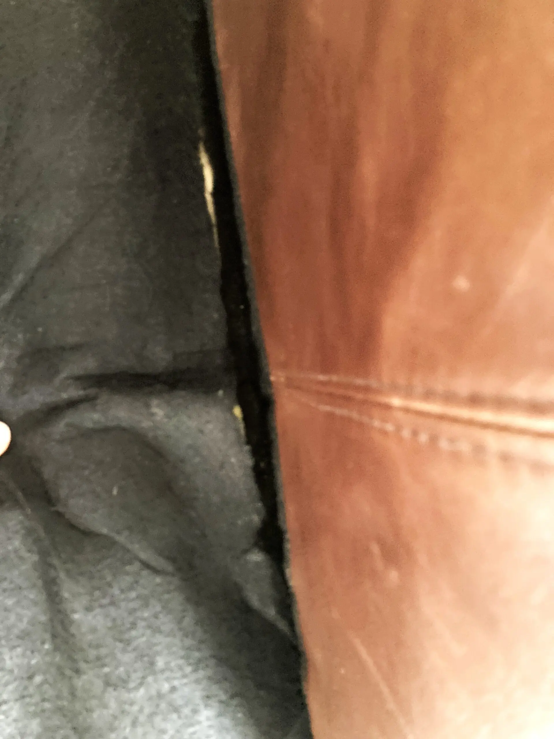 Used with signs of wear – to the unseen underside the fabric (not the leather) is torn. Also beneath the leather cusions – again not something you would see. The pouffe has some scuffs.