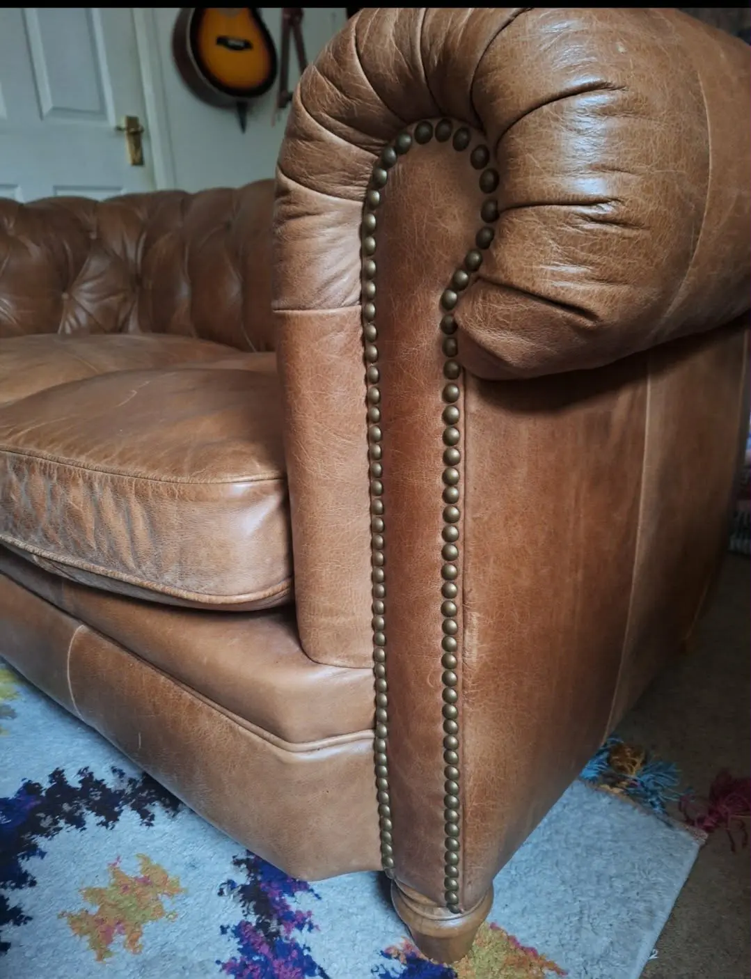 Would you love this beautiful classic sofa to add to any furniture collaboration for extra seating over Christmas? This Furniture Village Chesterfield “Newport” model with wooden feet is a gorgeous solid beach wood sofa which comes with Guardsman cover until 2027. This means any belt, buckle or key scratches can be removed along with marks such as ink as many times as you wish until the Guardsman expiry. The studs are all complete.