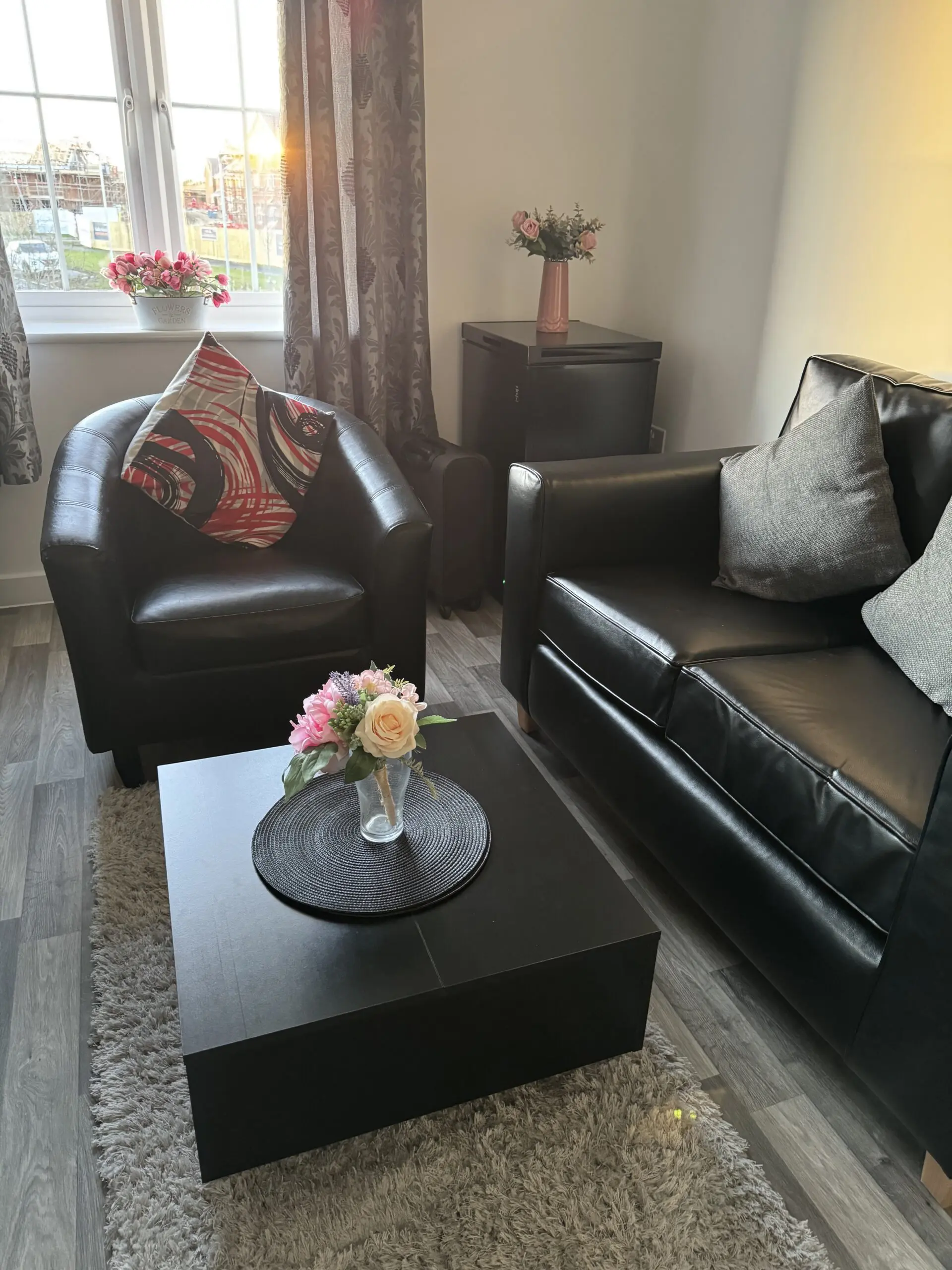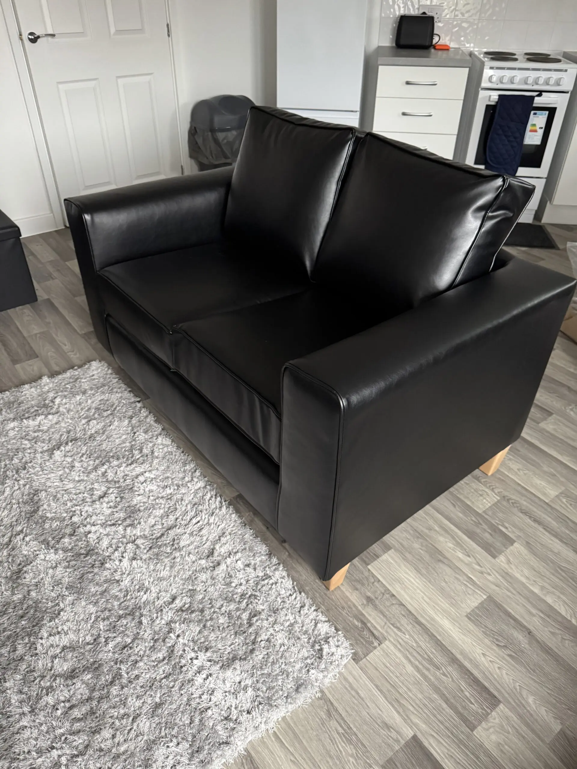 Sleek black faux-leather 2-seater sofa in excellent condition, hasn’t been used much at all.
