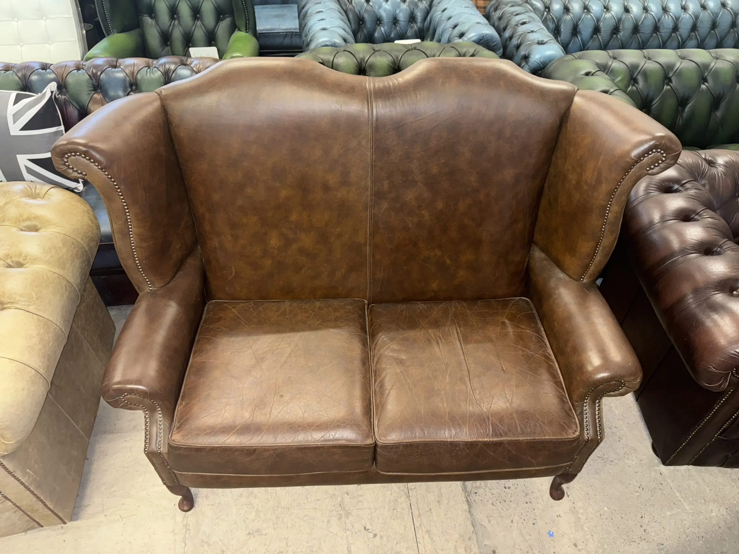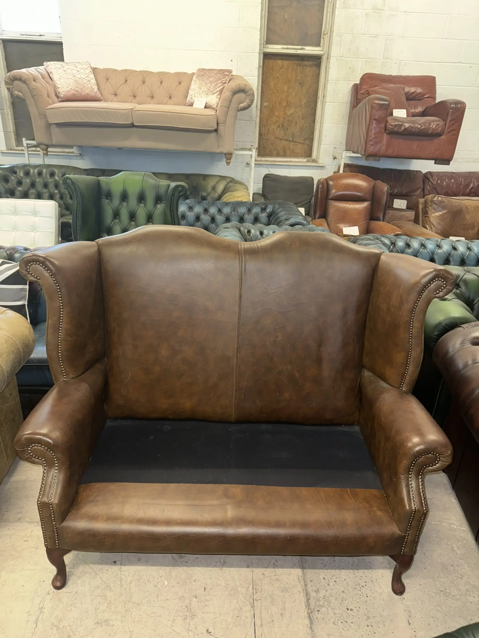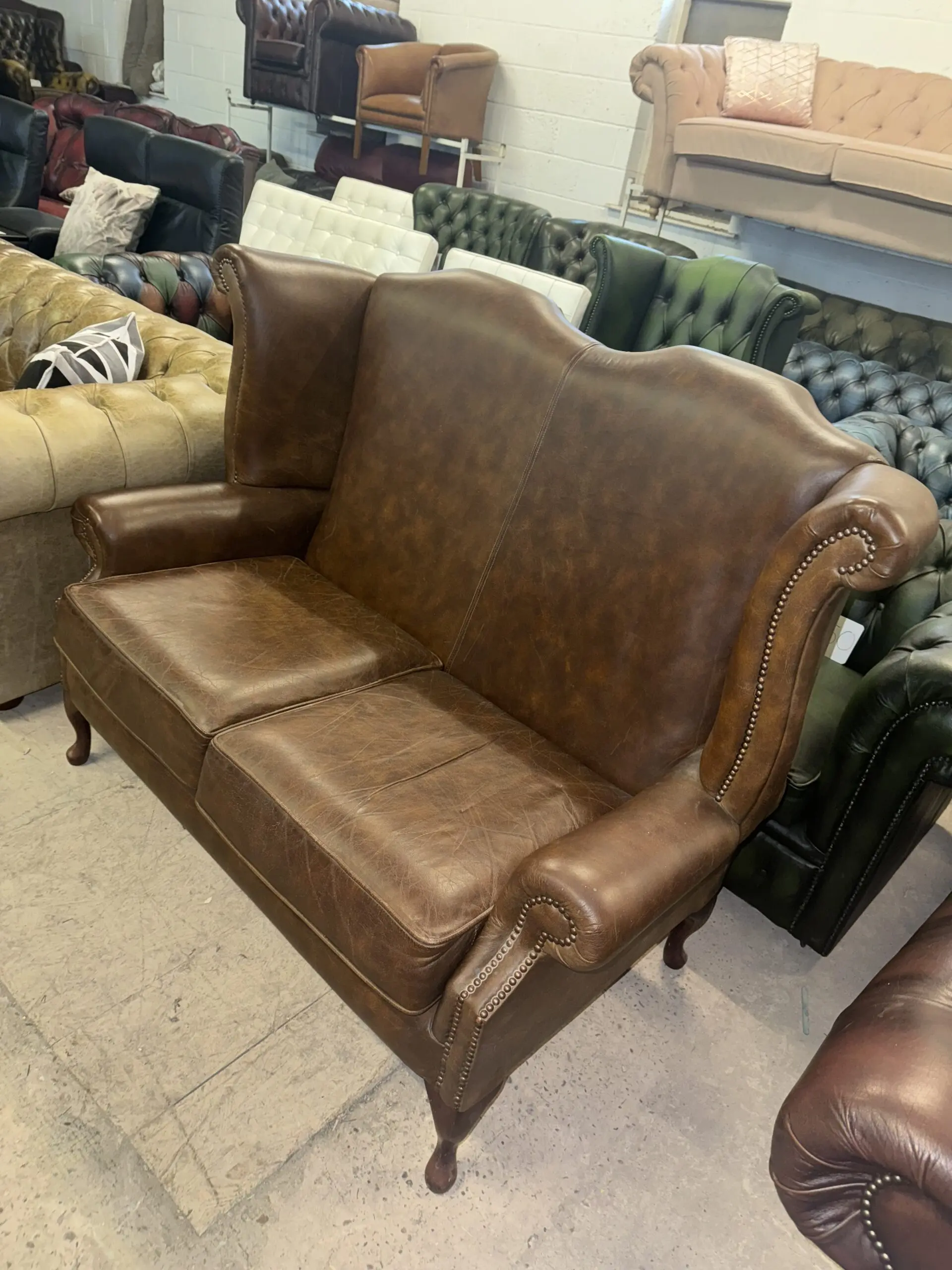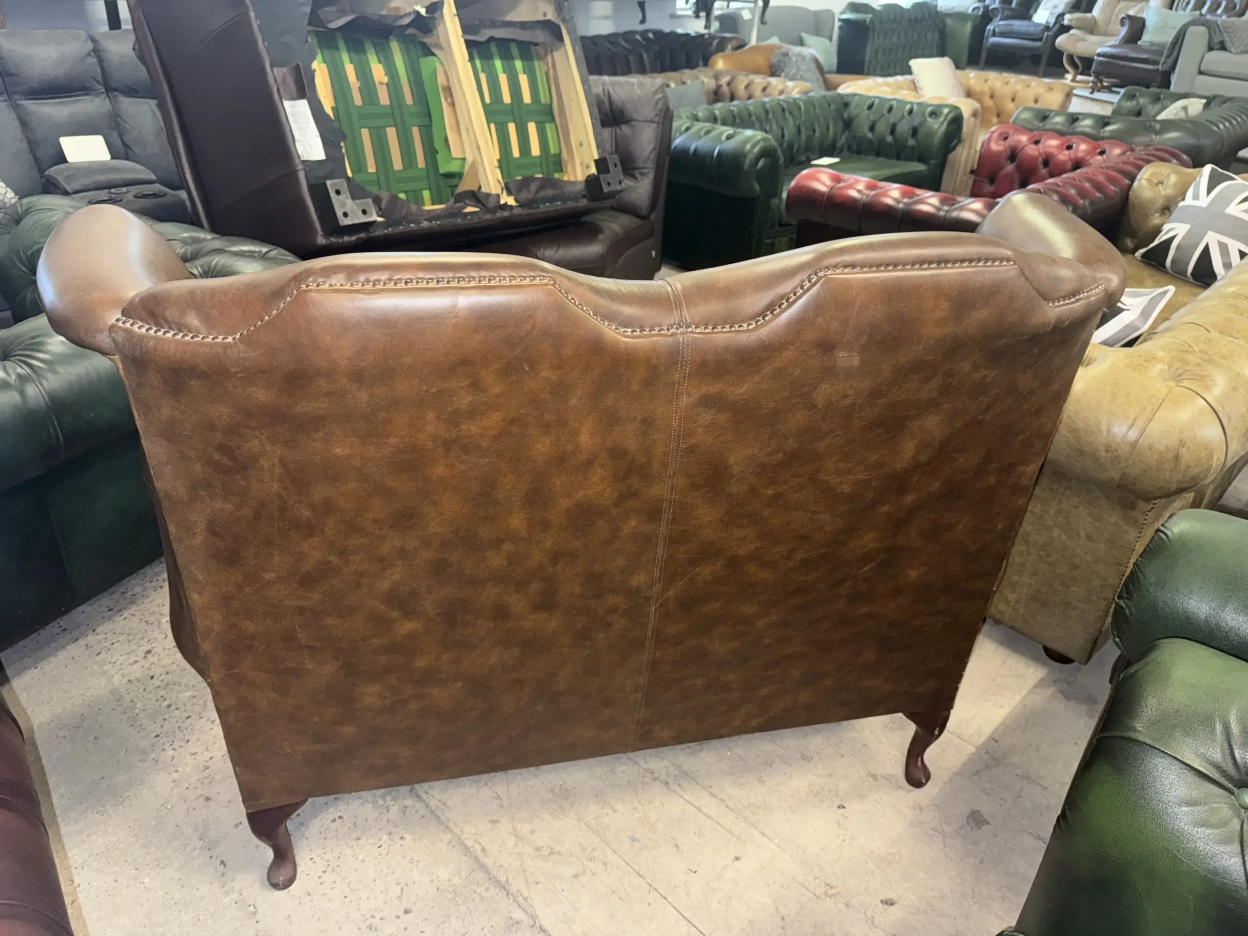 Chesterfield style tan brown real leather queen anne wingback two seater sofa with studding