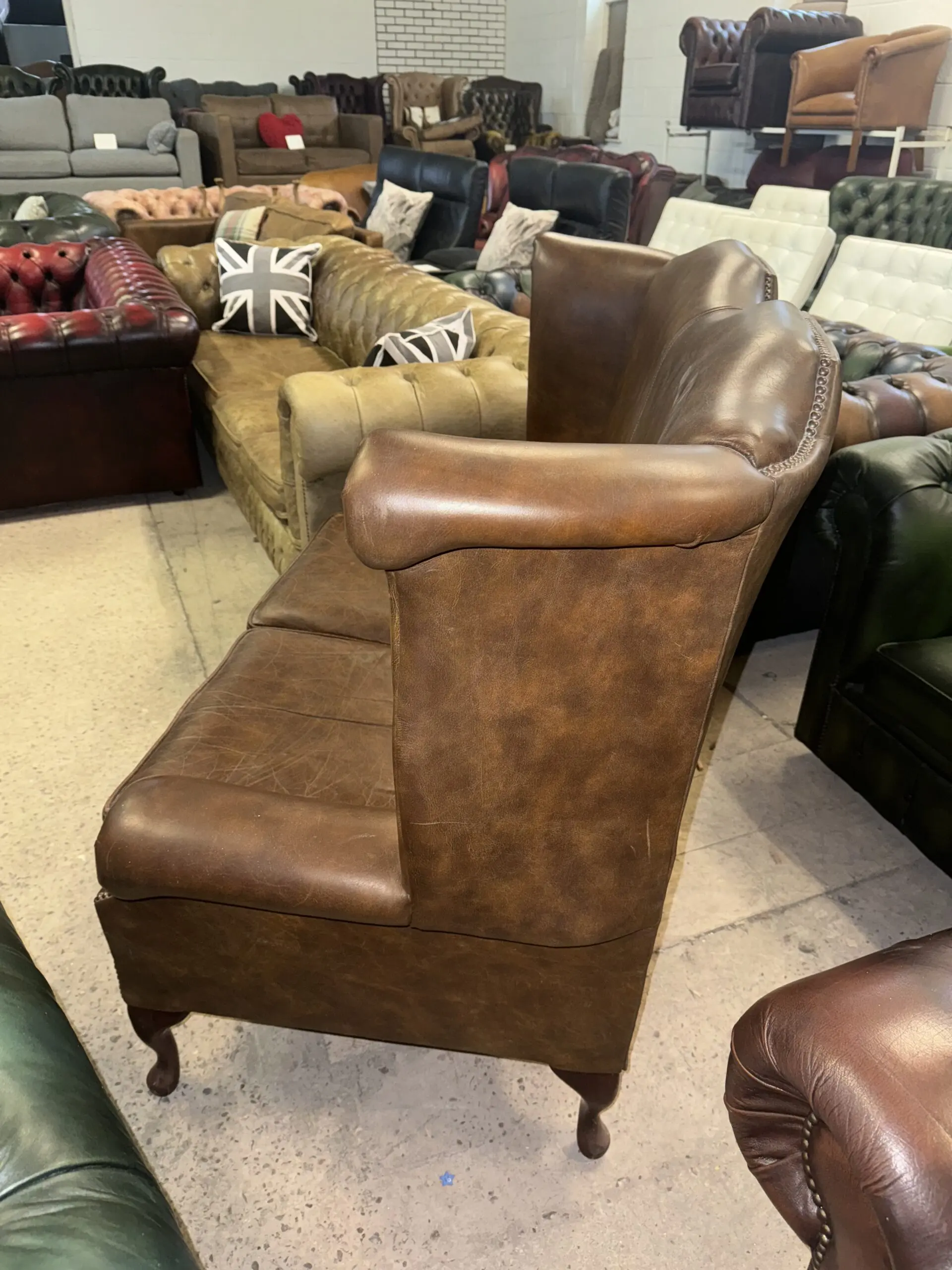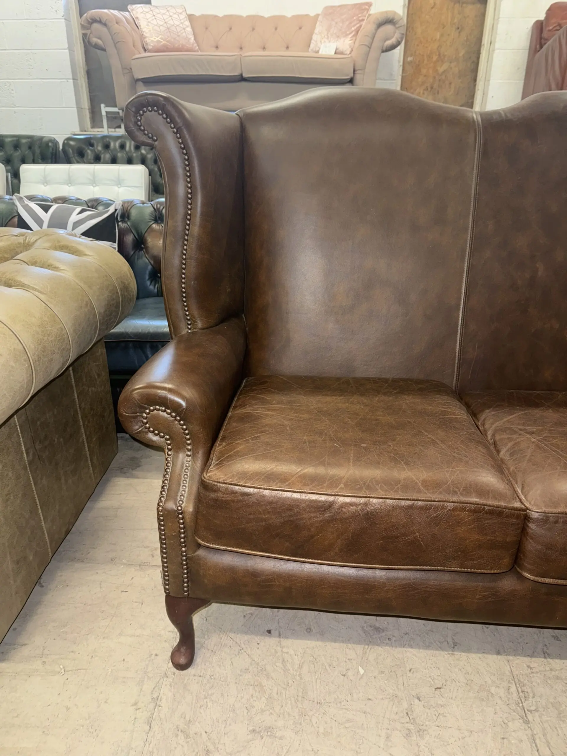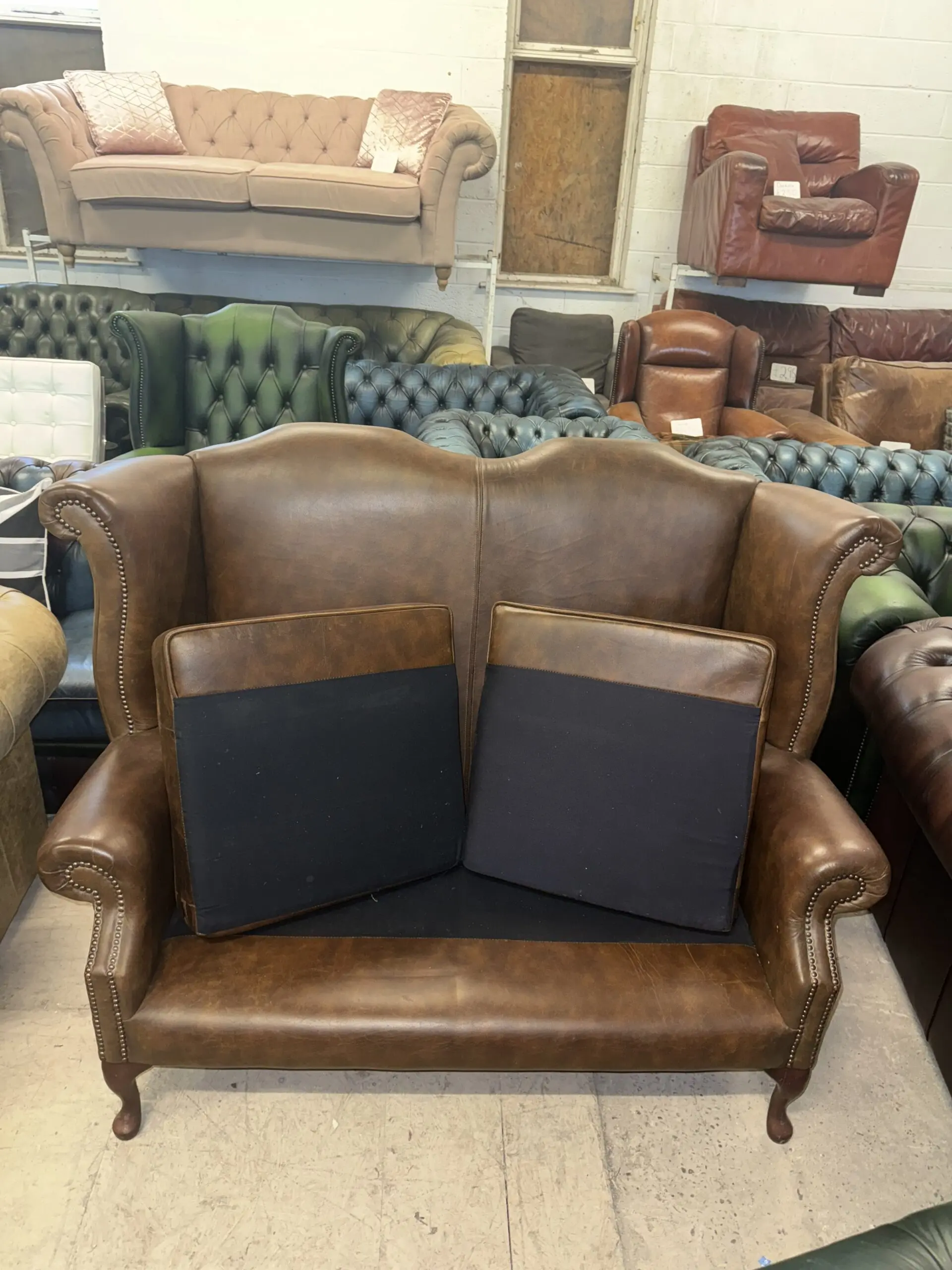 Chesterfield style tan brown real leather queen anne wingback two seater sofa with studding