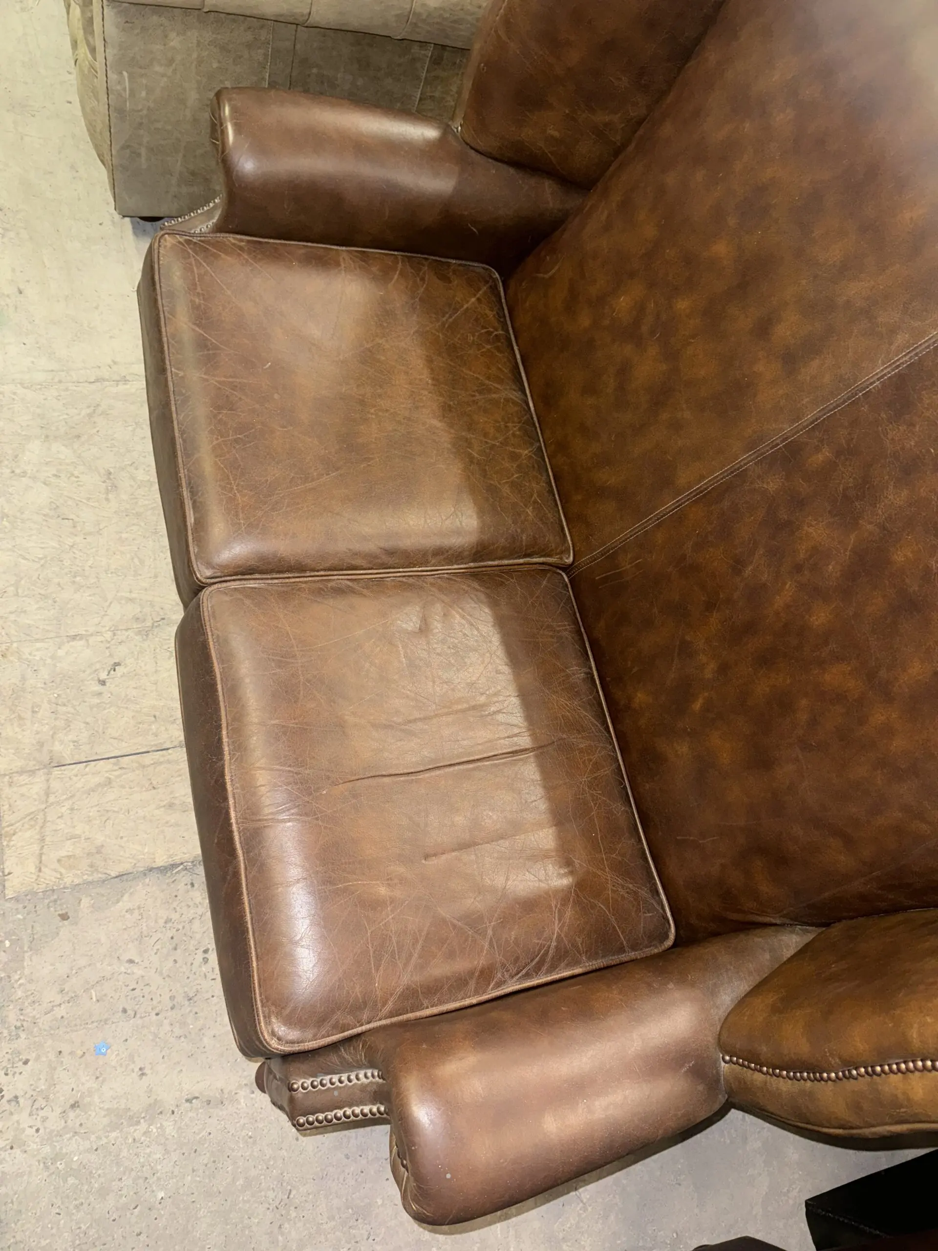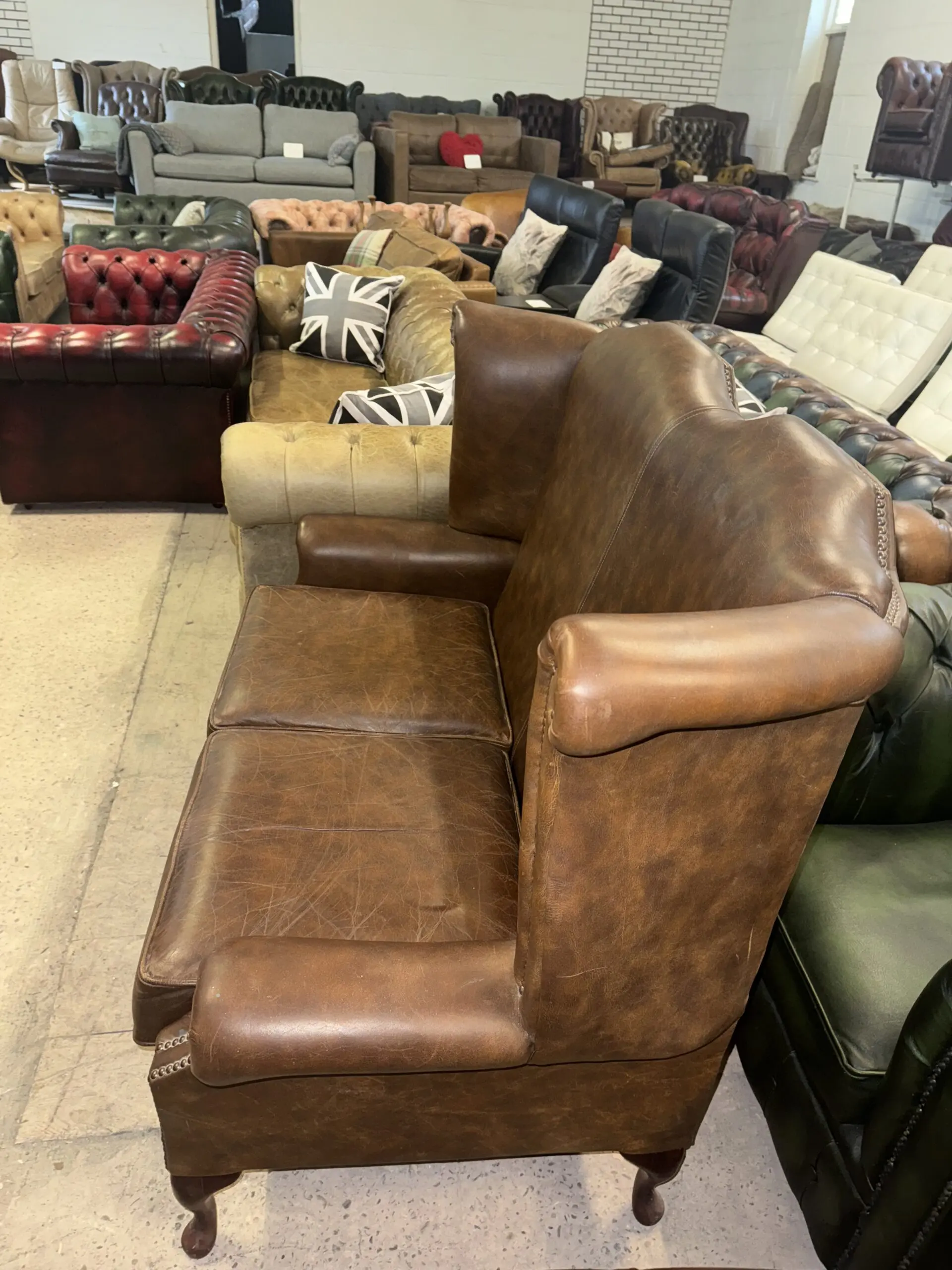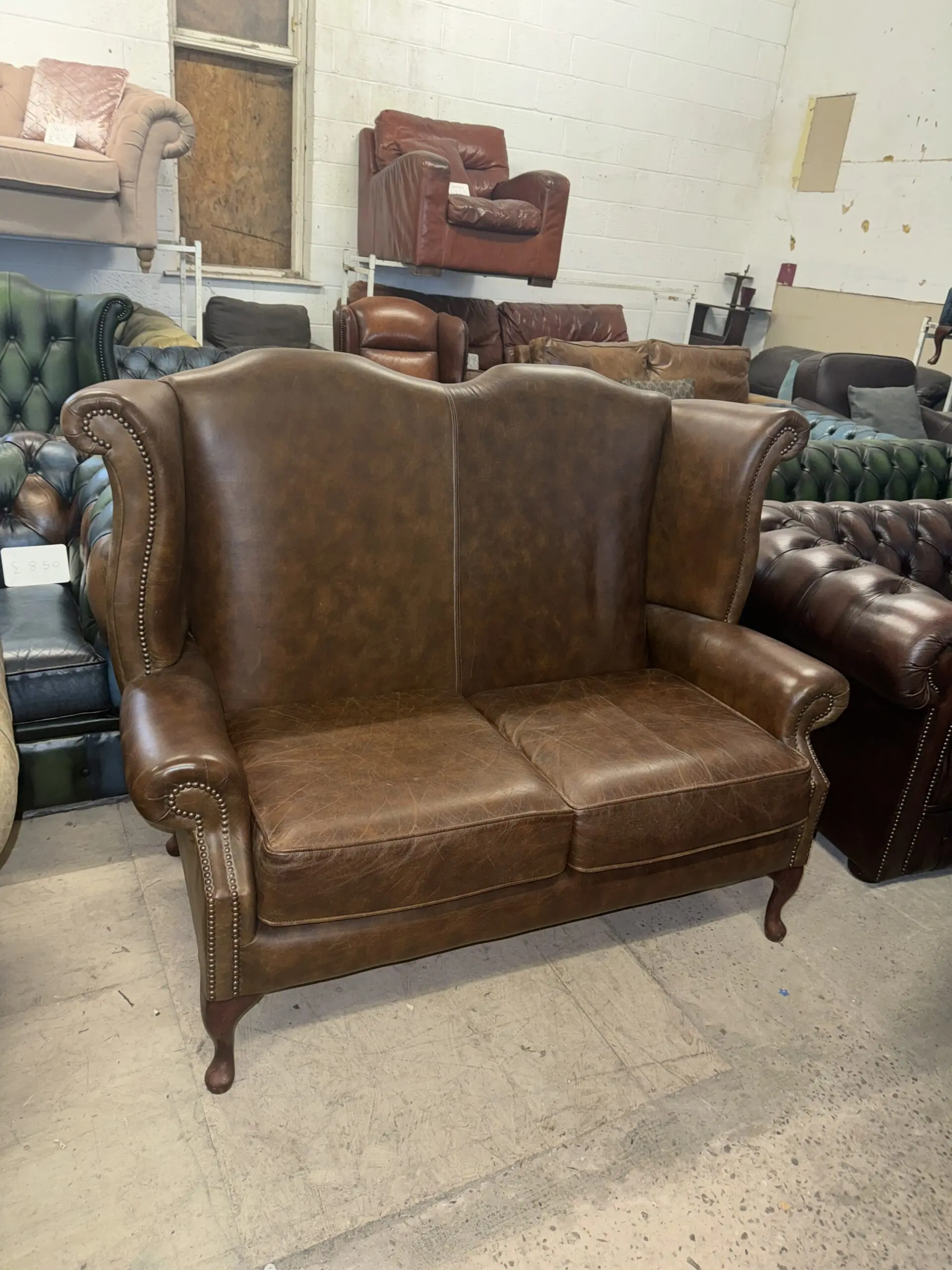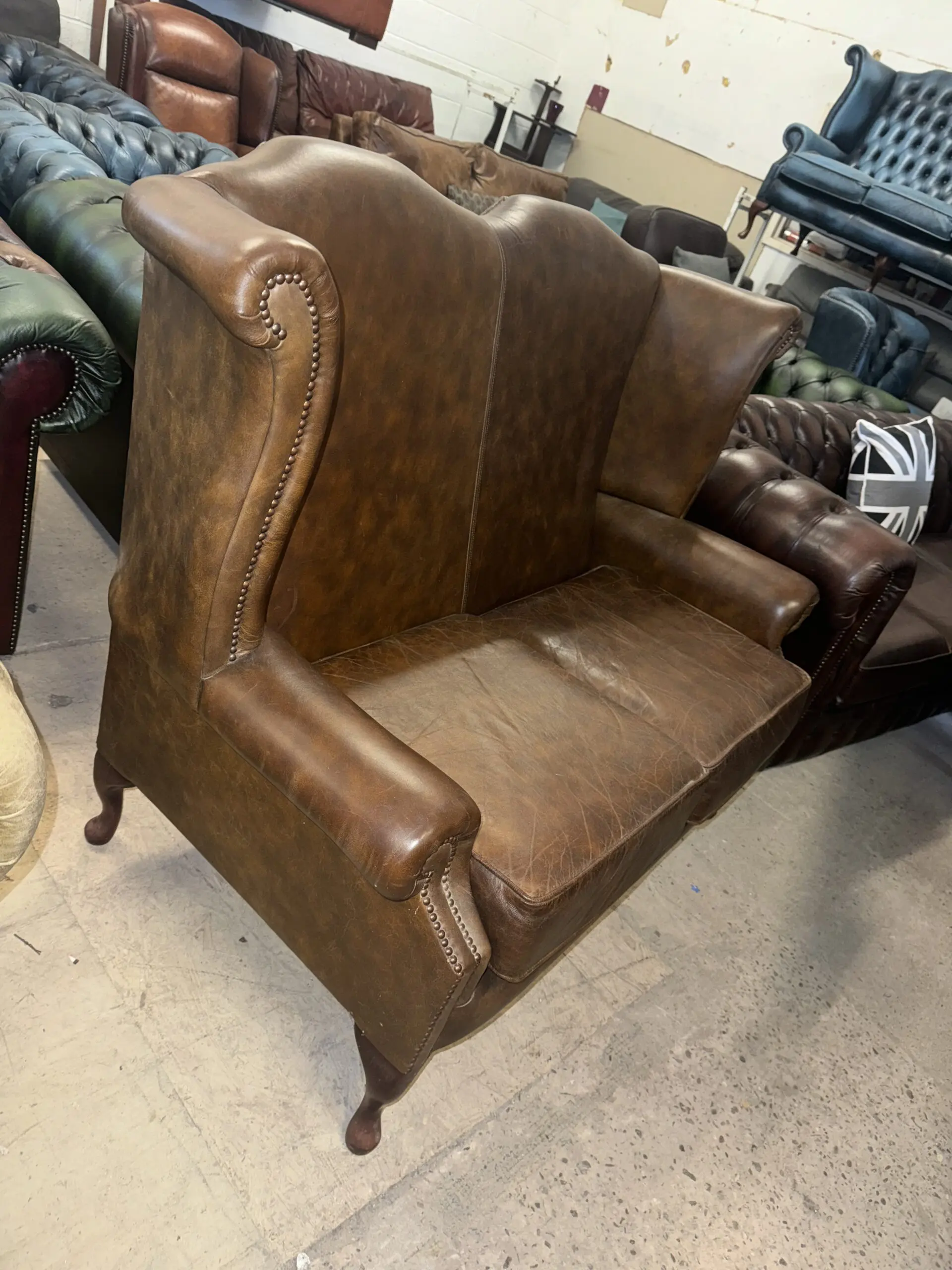 Chesterfield style tan brown real leather queen anne wingback two seater sofa with studding