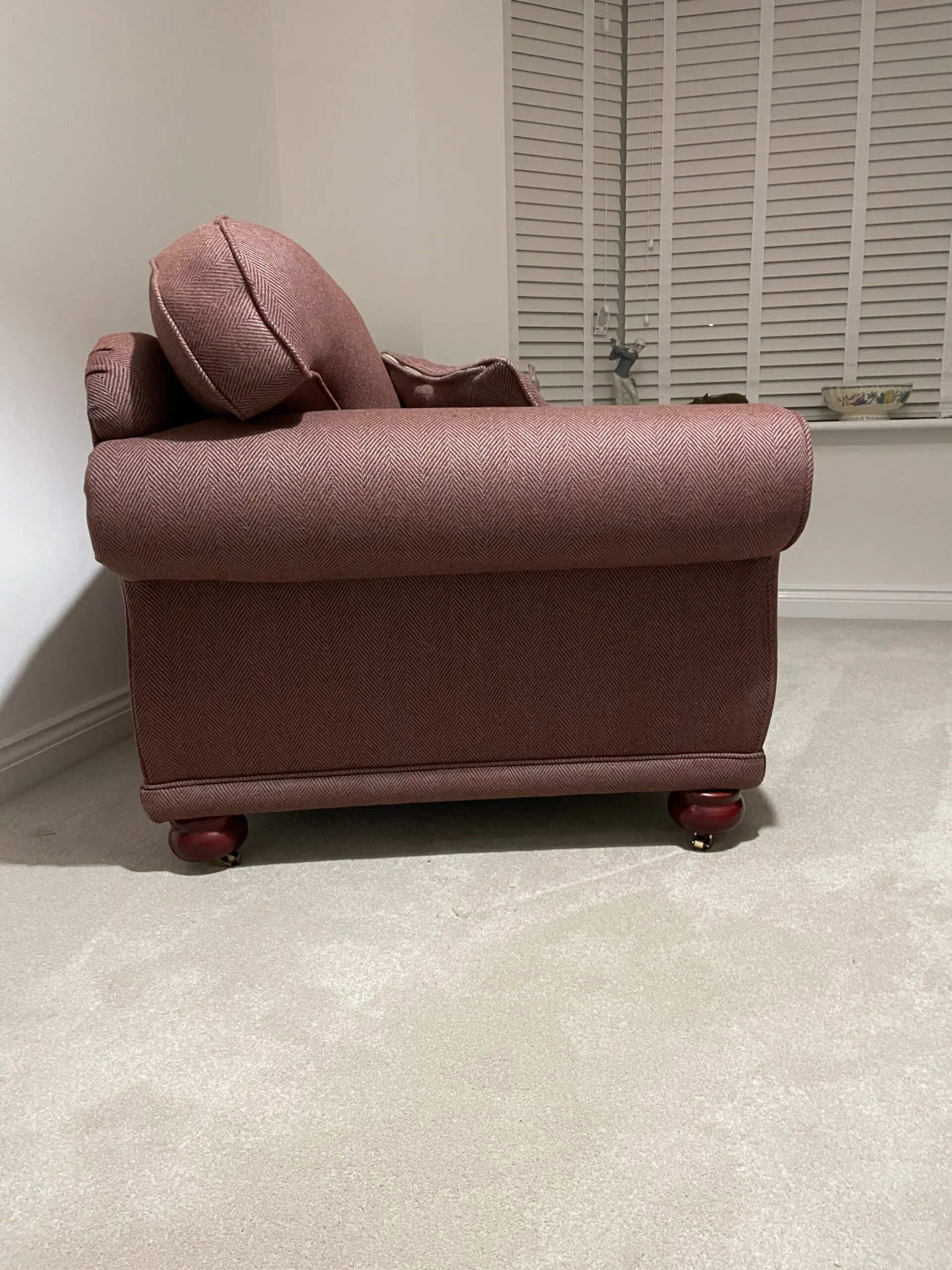 This lovely 2-seater sofa combines traditional design with comfortable seating for your living room. Features classic rolled arms, supportive back cushions, and elegant turned wooden feet that give it a timeless appeal. Re upholstered in 2020 in 100% wool Herringbone weave Paprika fabric adds subtle texture and visual interest to complement both traditional and contemporary decor. Perfect for couples or smaller living spaces whilst maintaining a sophisticated look that will suit any home.