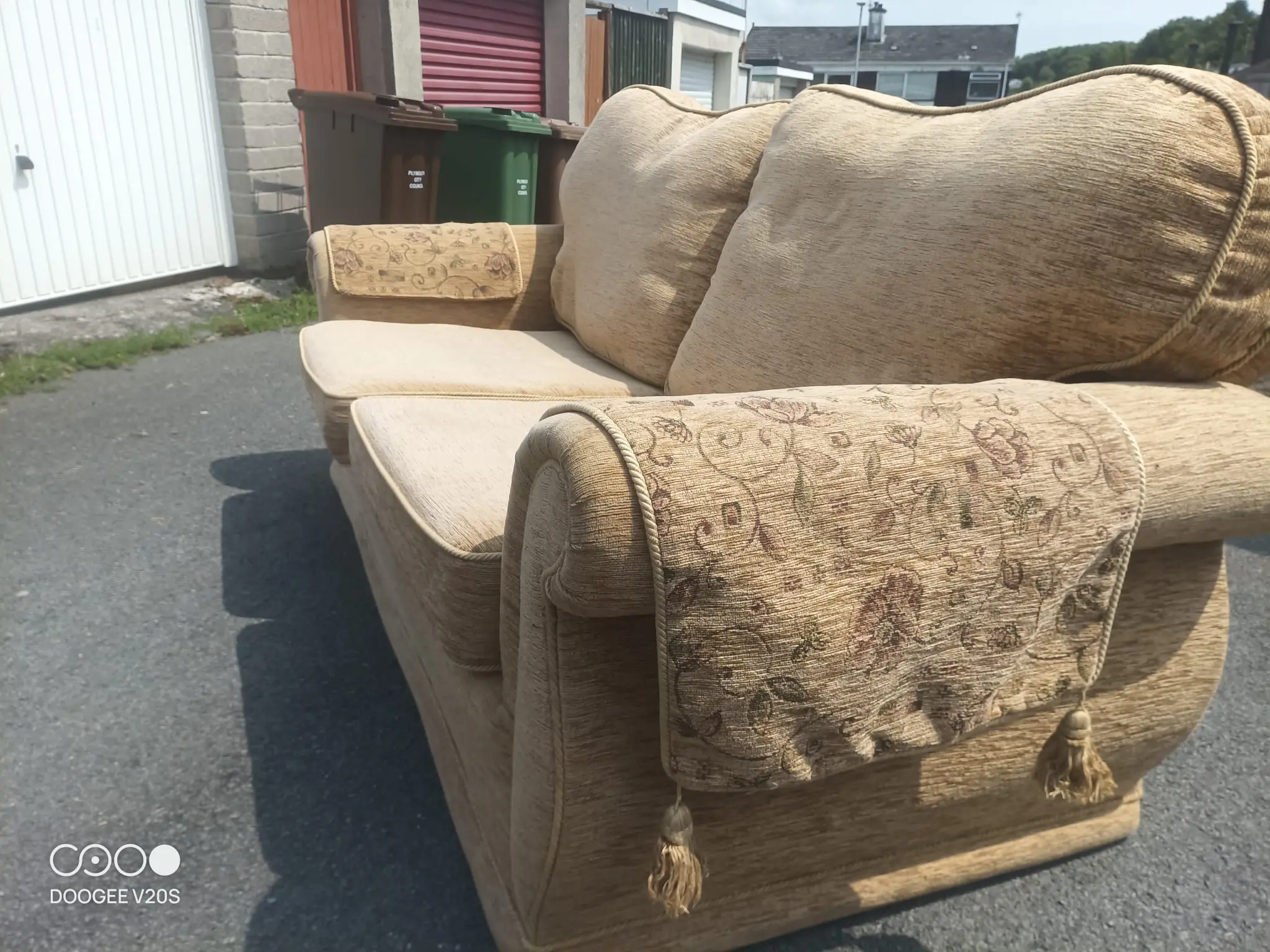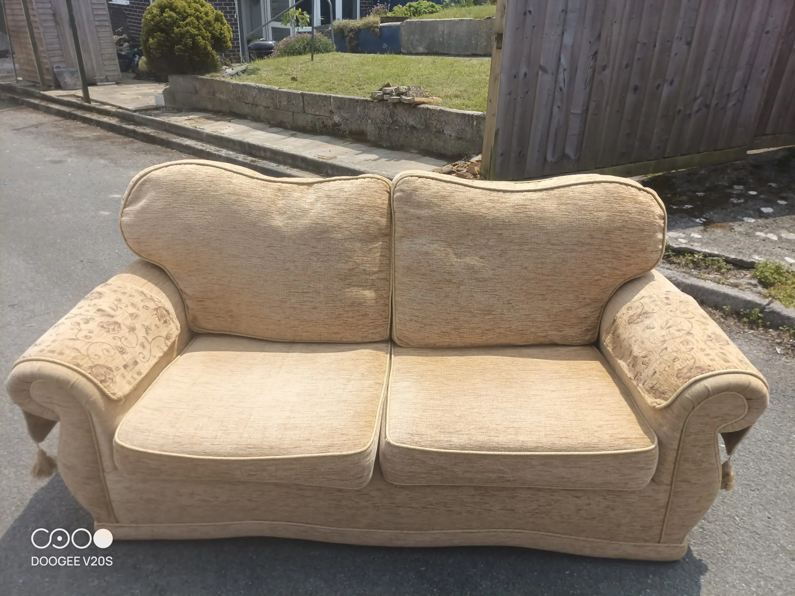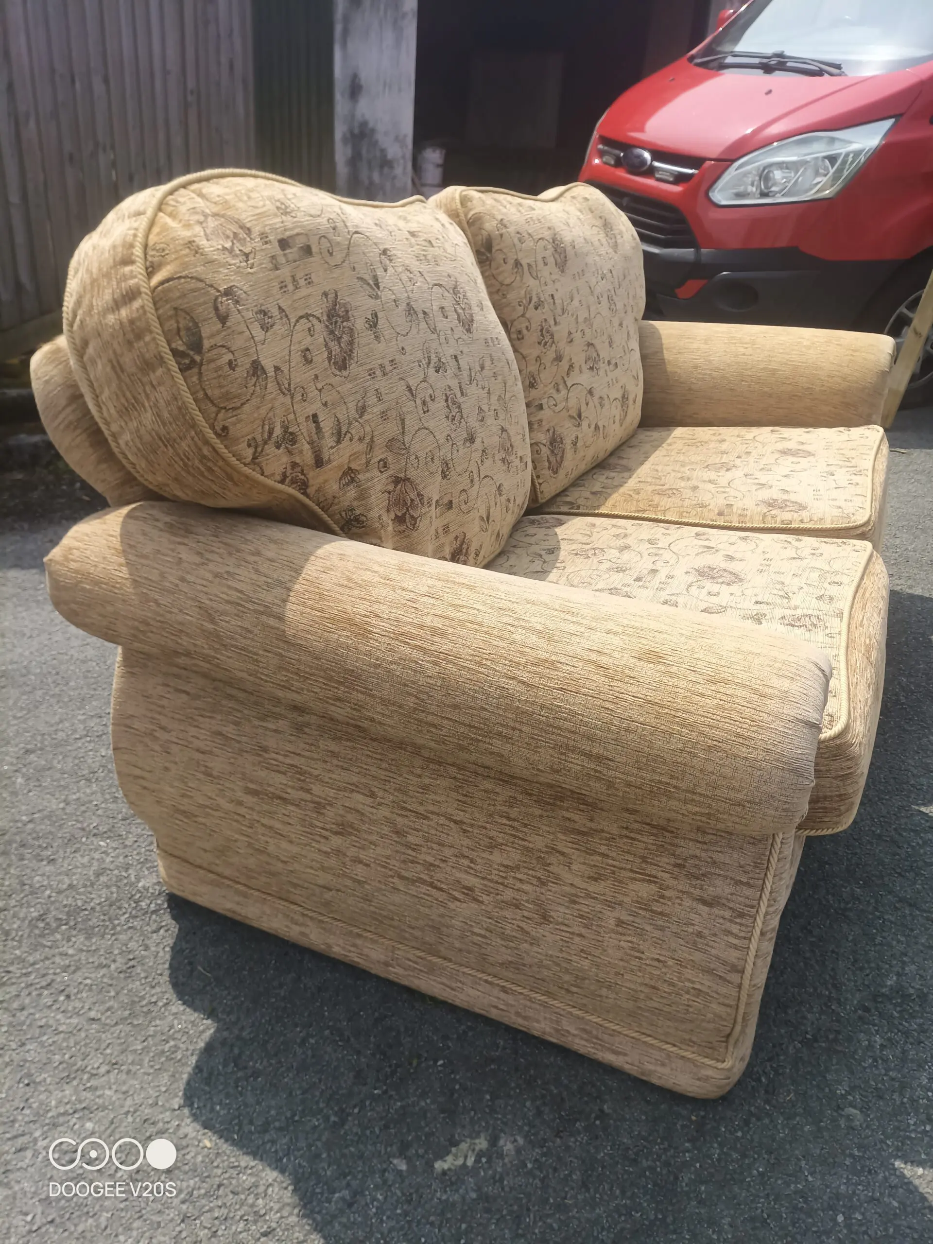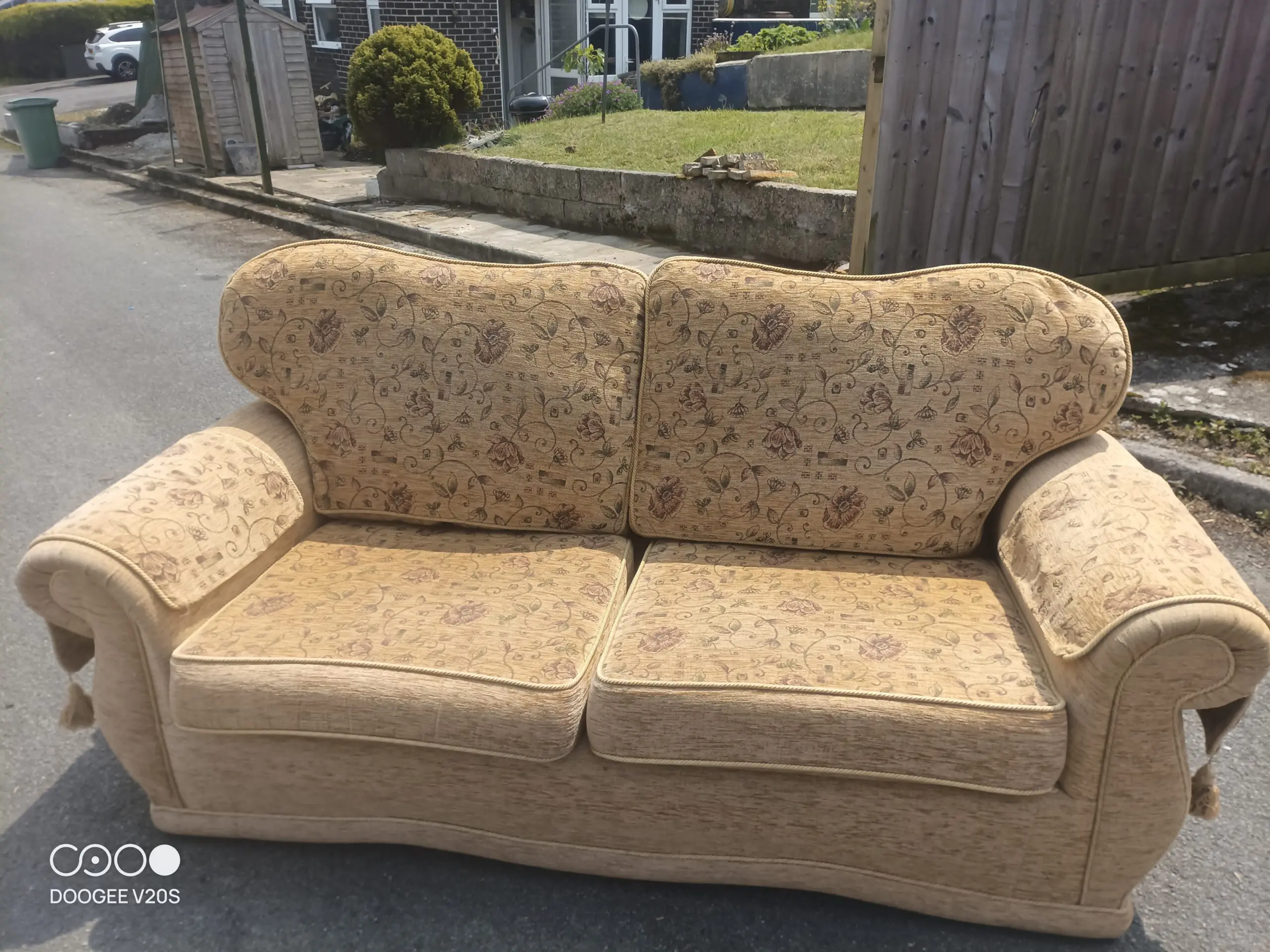 This is a classic style 2 seater sofa with an almost gold/yellow colour and with reversible cushions with a floral design.