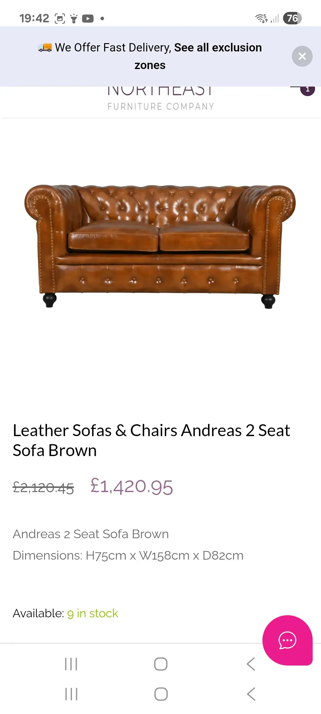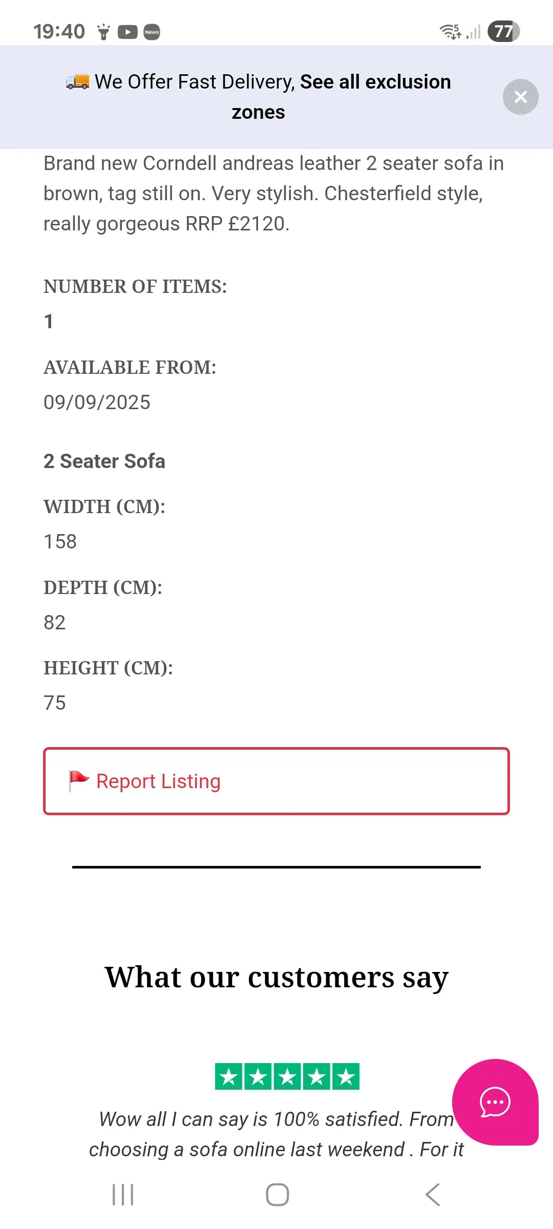 Wow all I can say is 100% satisfied. From choosing a sofa online last weekend . For it to be delivered today . What a beautiful sofa at a fraction of the price of a shop bought one. It's in excellent condition. Sofalistic is a wonderful place to purchase your sofa . I will recommend them to all my friends and family.