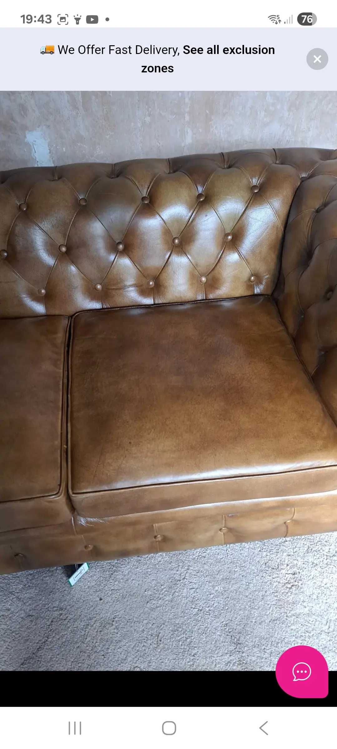 The sofa and chair I bought was as described by the seller - excellent condition. Delivery was quickly arranged and without any incidents. I was kept well informed of the delivery time on the day. Highly recommended.