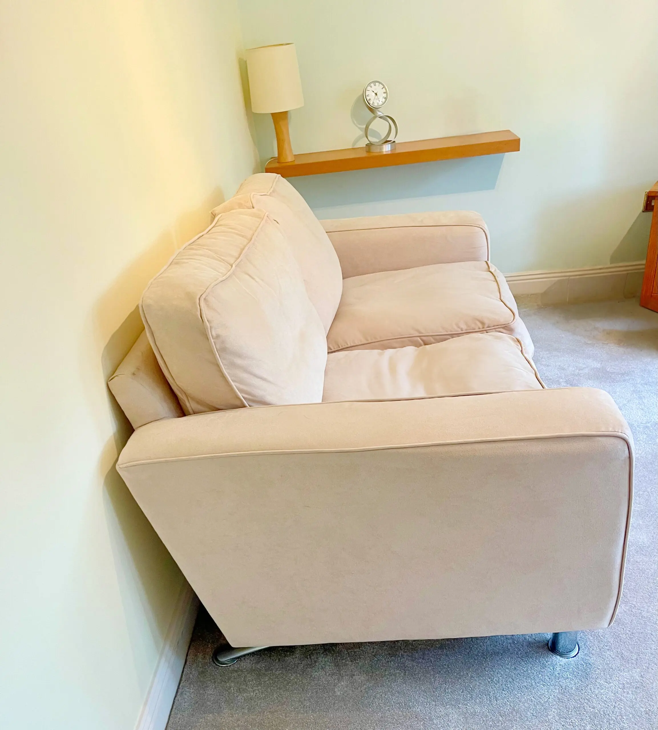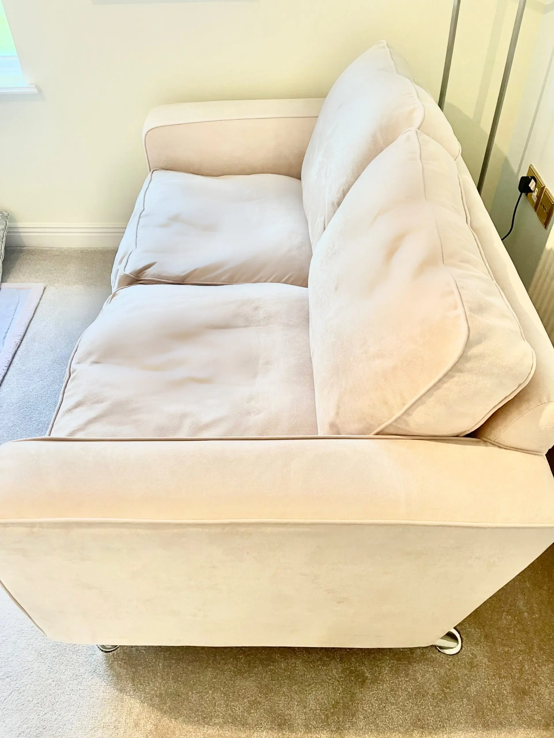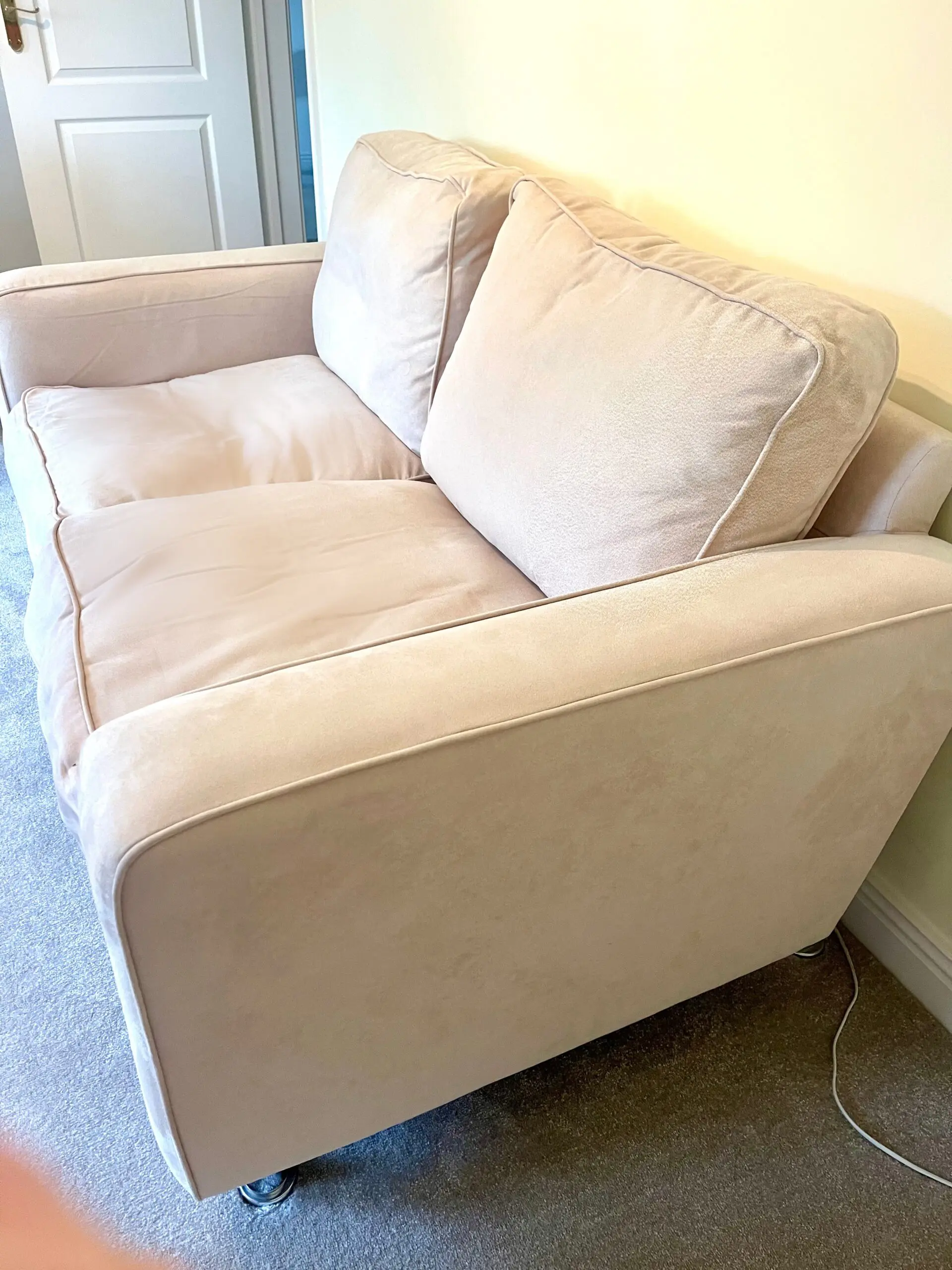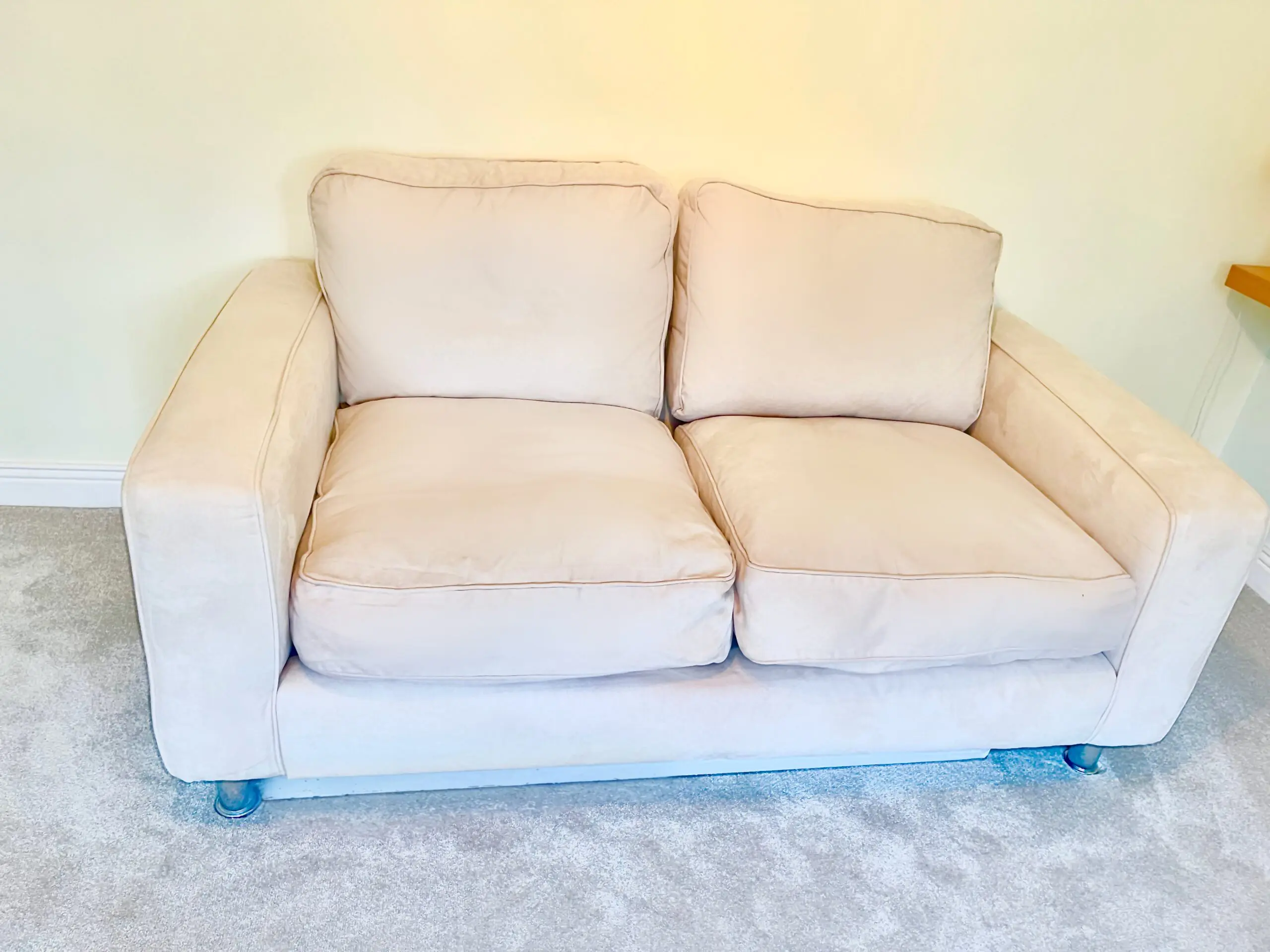 These gorgeous cream mock suede 2 seater sofas come with chrome legs. They were treated with scotsguard stain prevention and. as they are in a little used guest room, they have hardly been used at all.