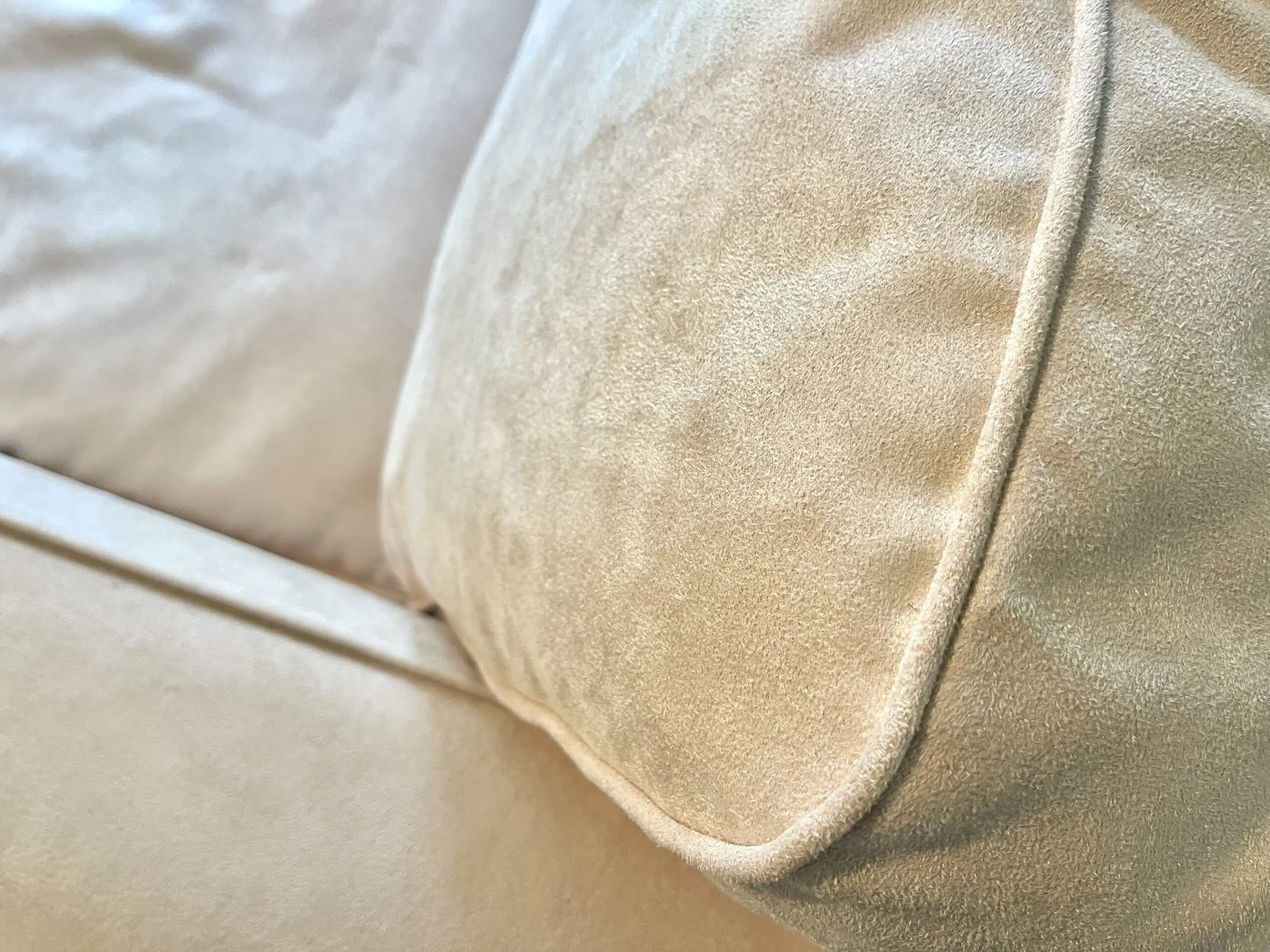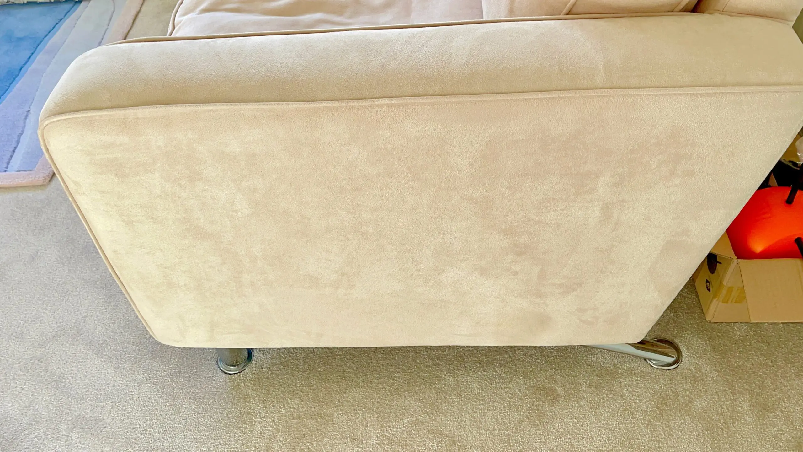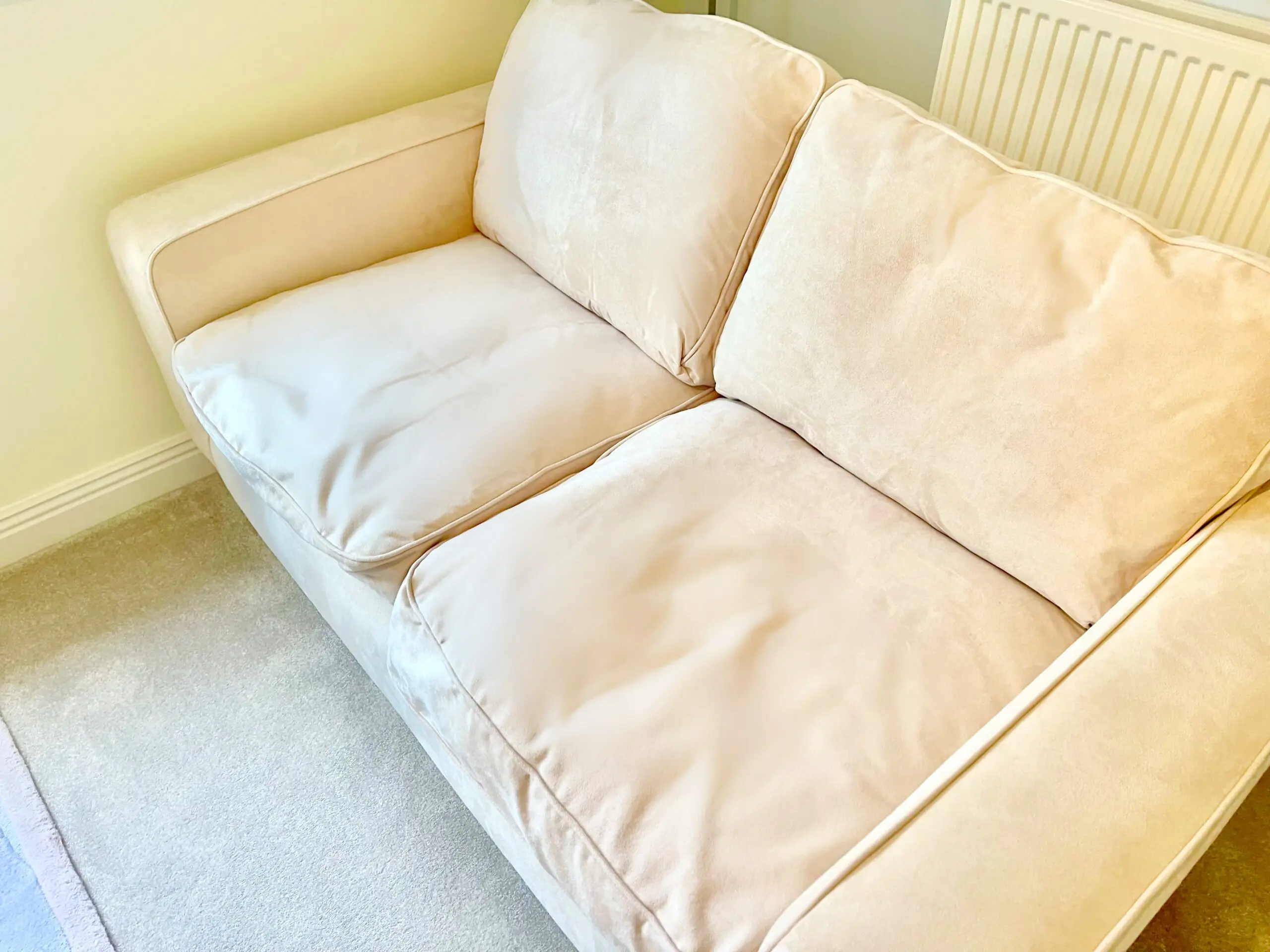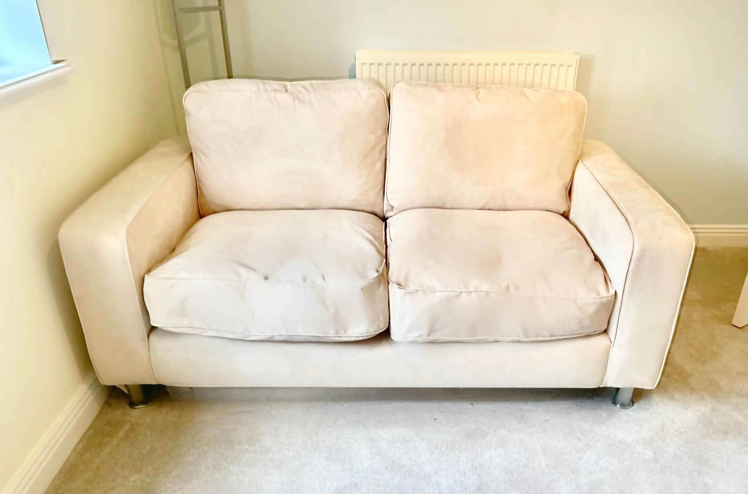 These gorgeous cream mock suede 2 seater sofas come with chrome legs. They were treated with scotsguard stain prevention and. as they are in a little used guest room, they have hardly been used at all.
