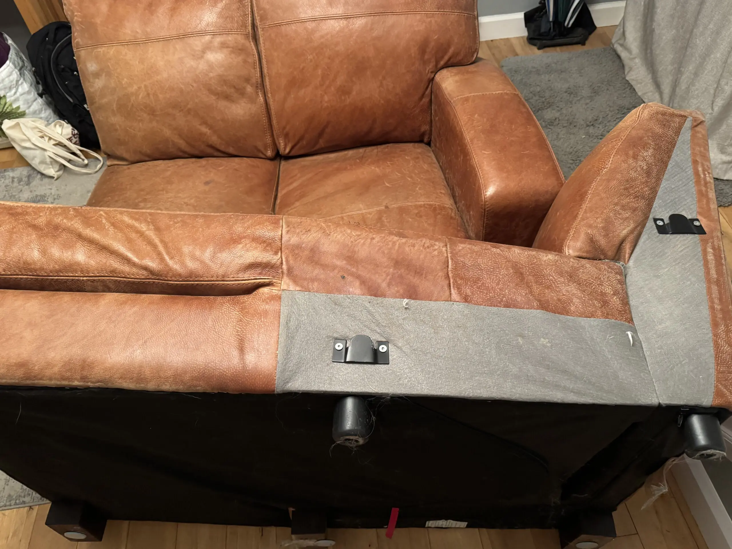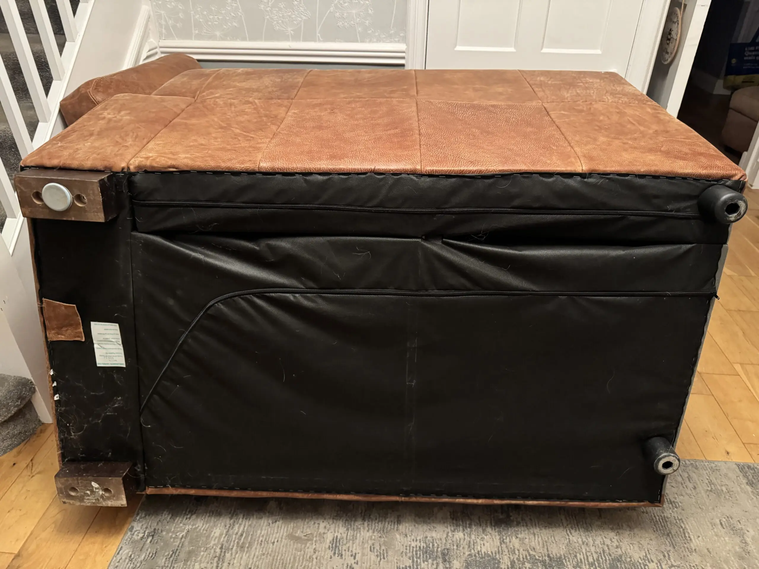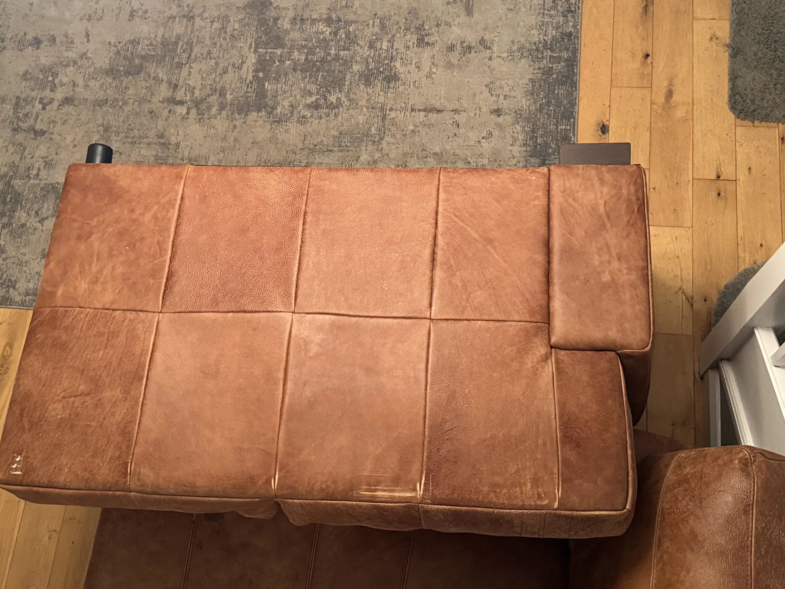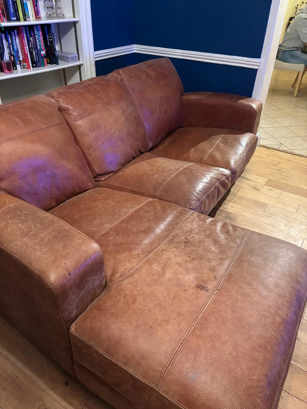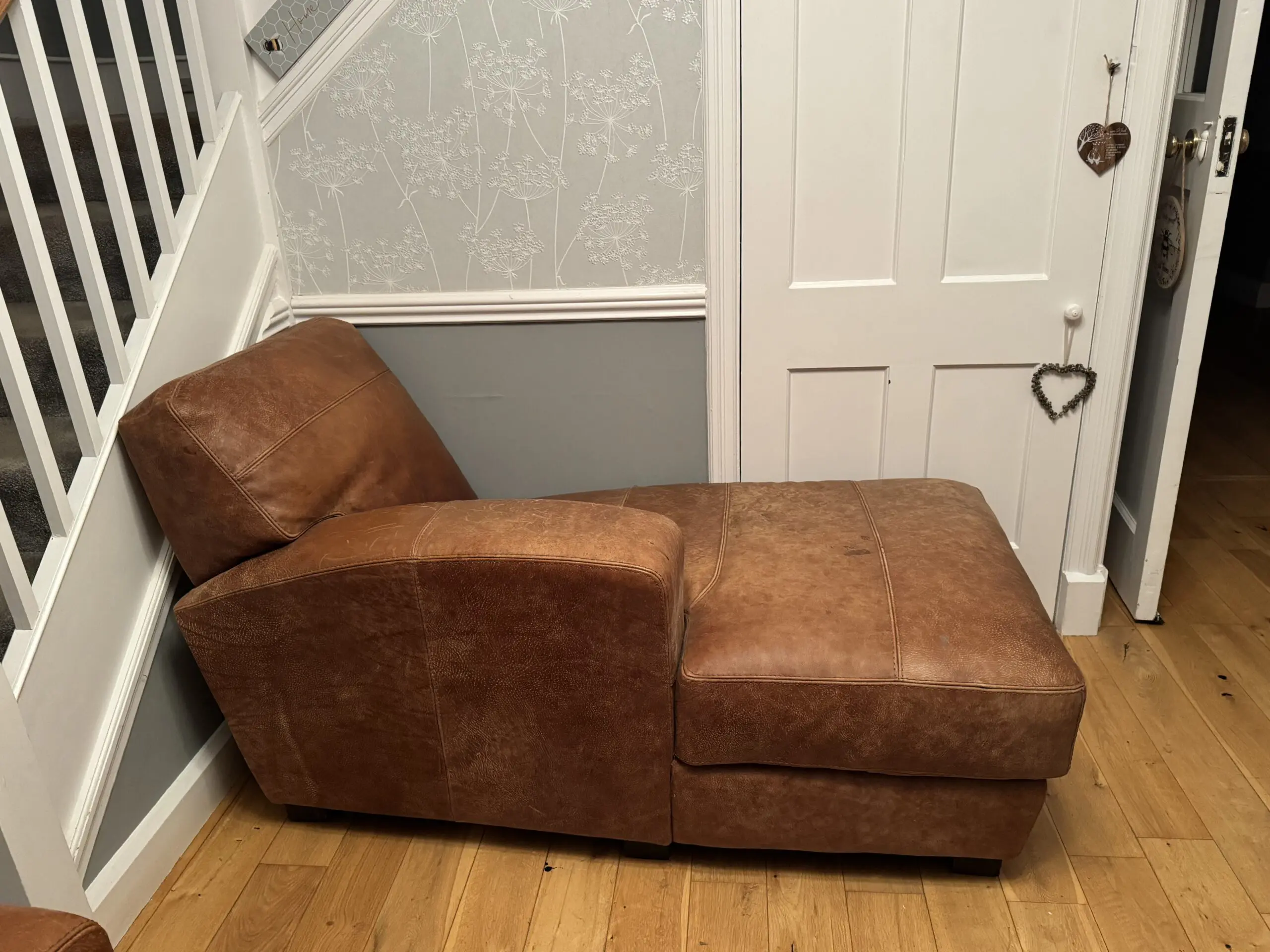 DFS leather sofa and chaise longue – latter is in good condition. One side of the sofa seat could do with some additional padding (accessible from zip to rear and bottom of sofa) but perfectly acceptable 2 seater sofa as is.