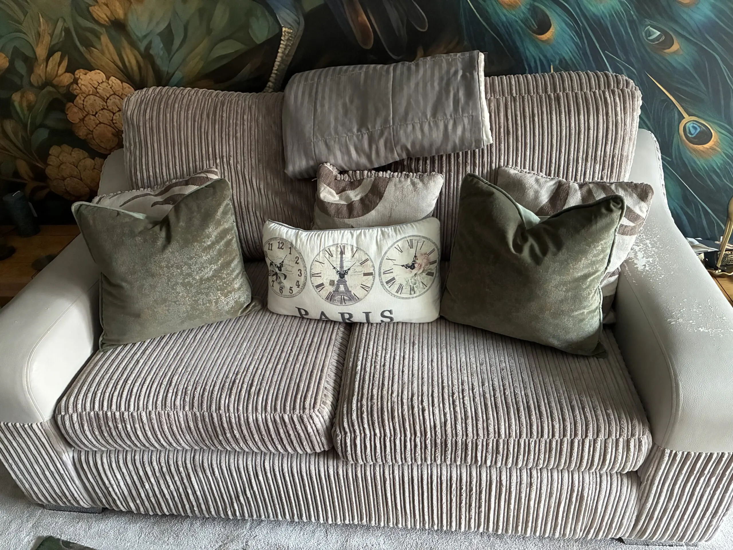 Comfortable sofa set, upholstered in soft ribbed fabric. Cosy, practical and a family friendly choice. In very good condition with minor defects on the faux leather arms. Comes with foam filled seat cushions and back cushions. Feet are in silver making this a modern addition to your home. The colour is natural and goes with any room colour scheme you have.