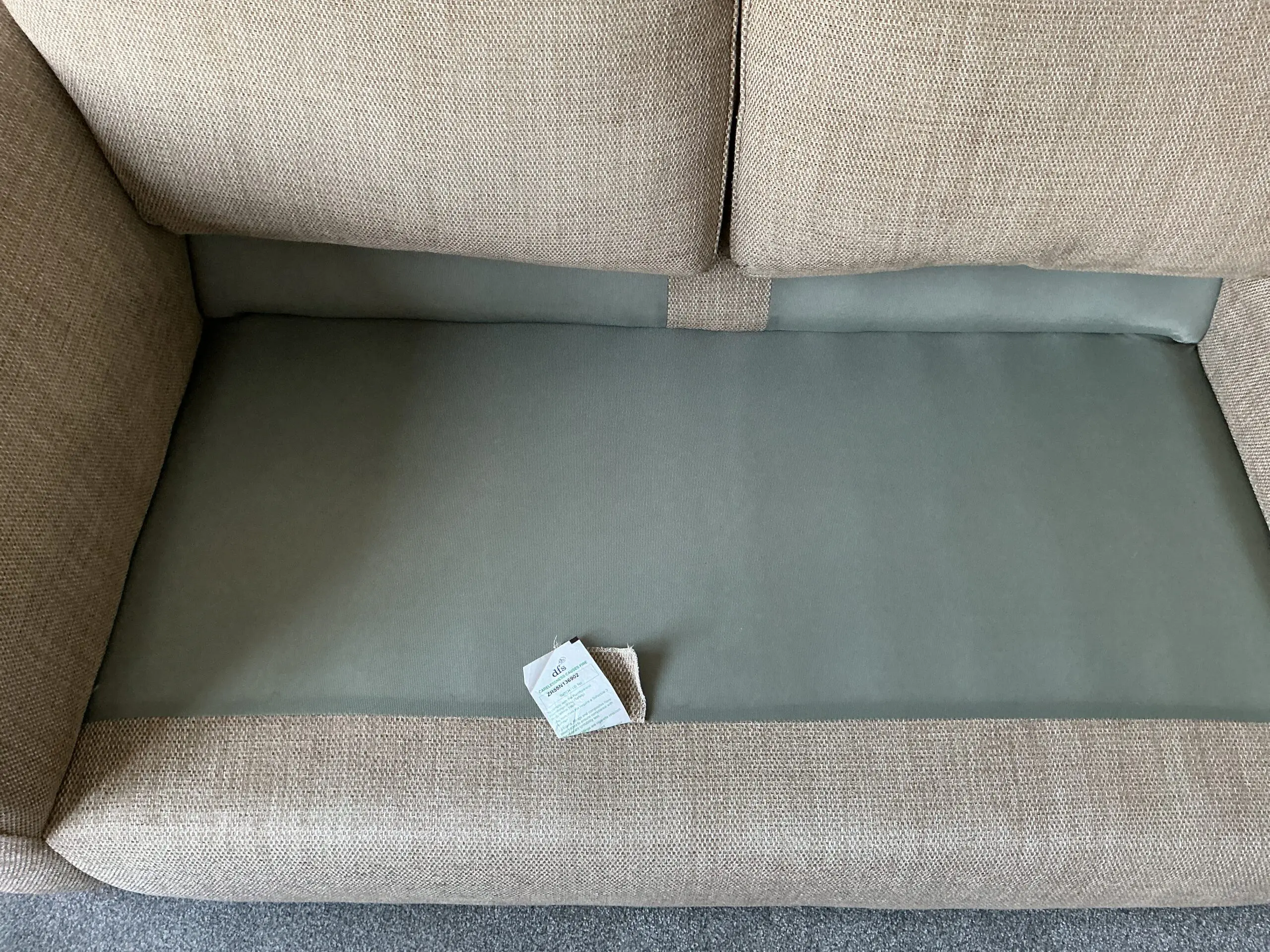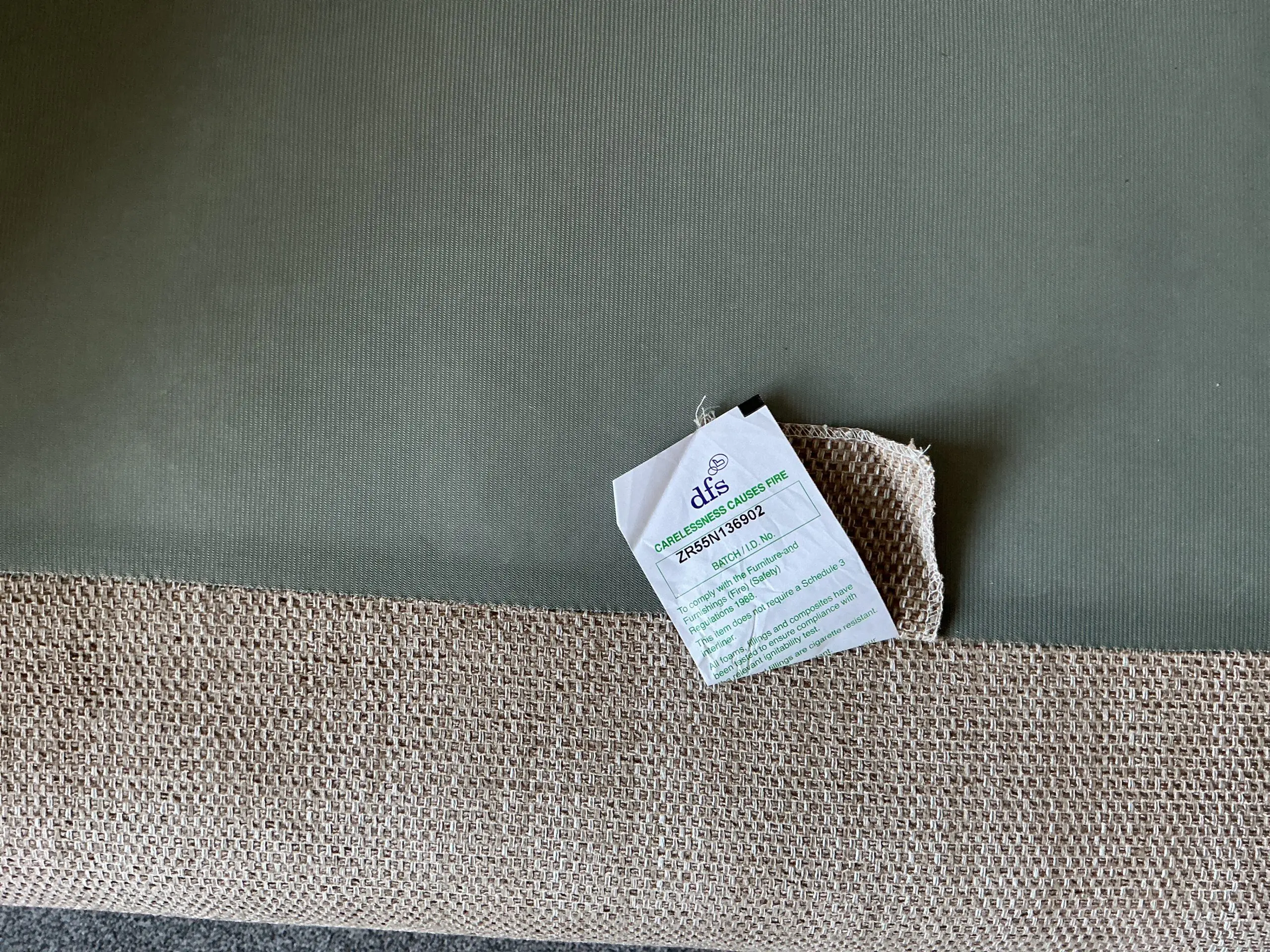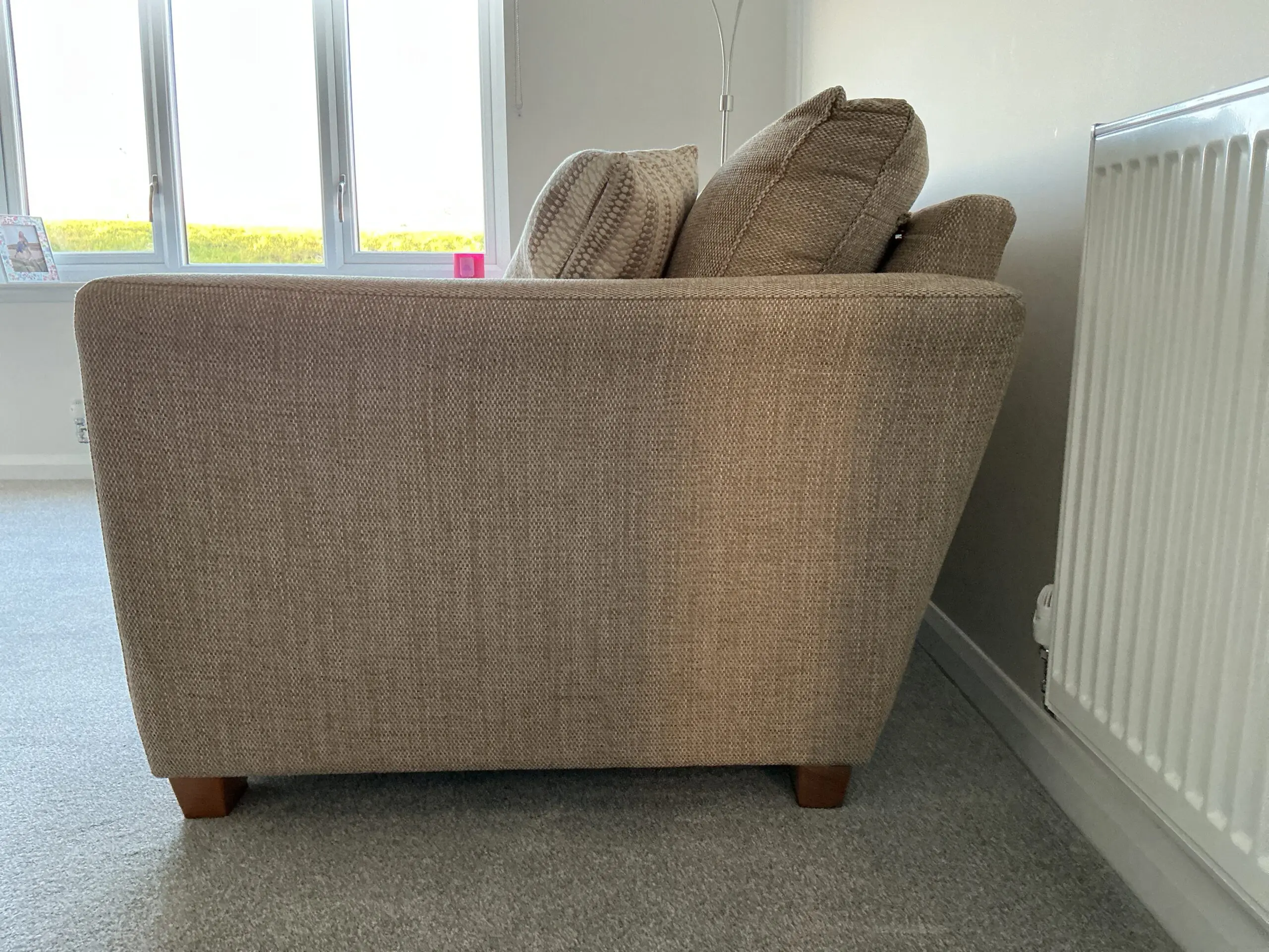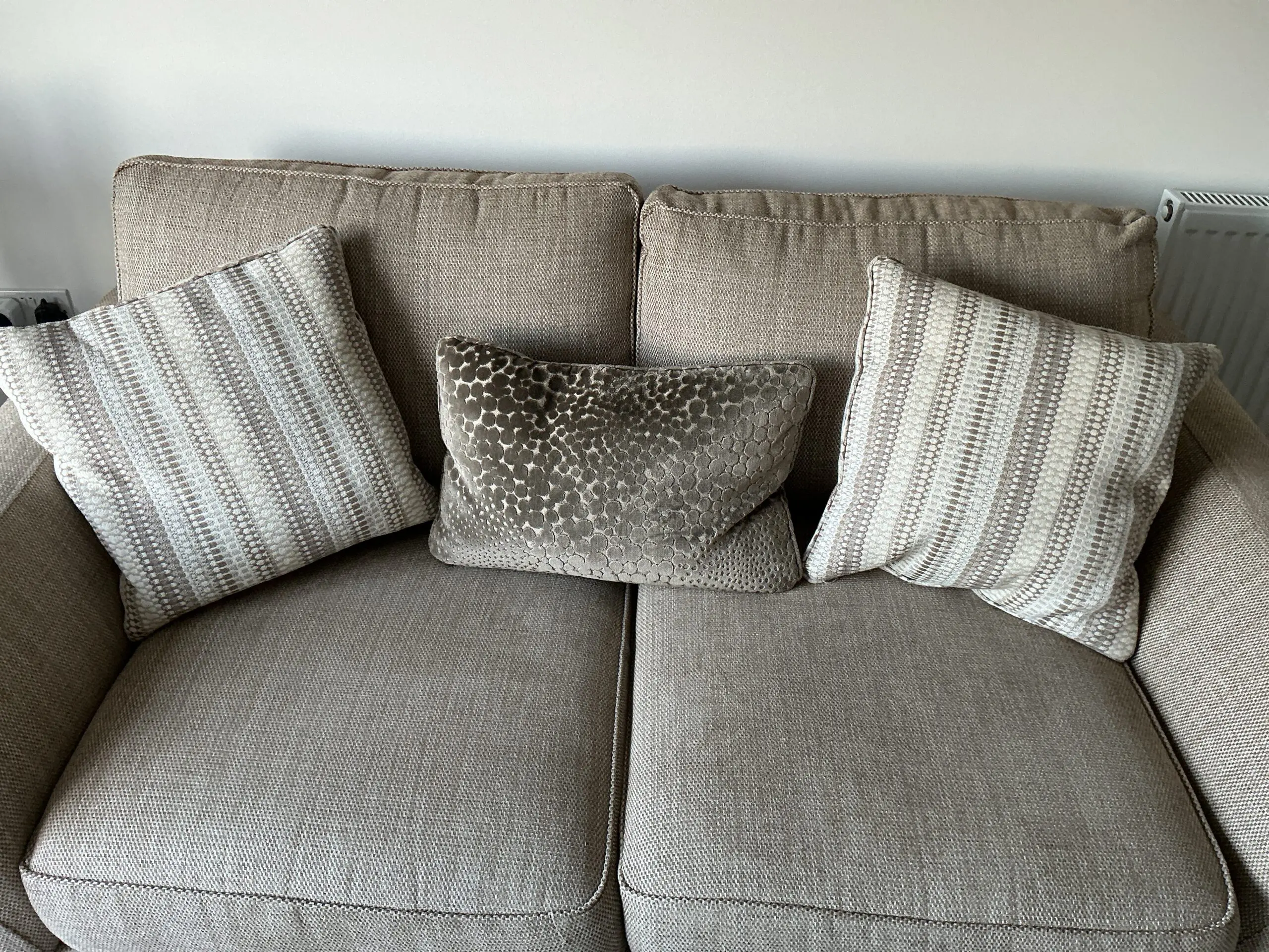 Two 2 seater sofas bought from DFS. Beige/oatmeal with matching cushions (3 cushions per sofa). Oak wooden feet.