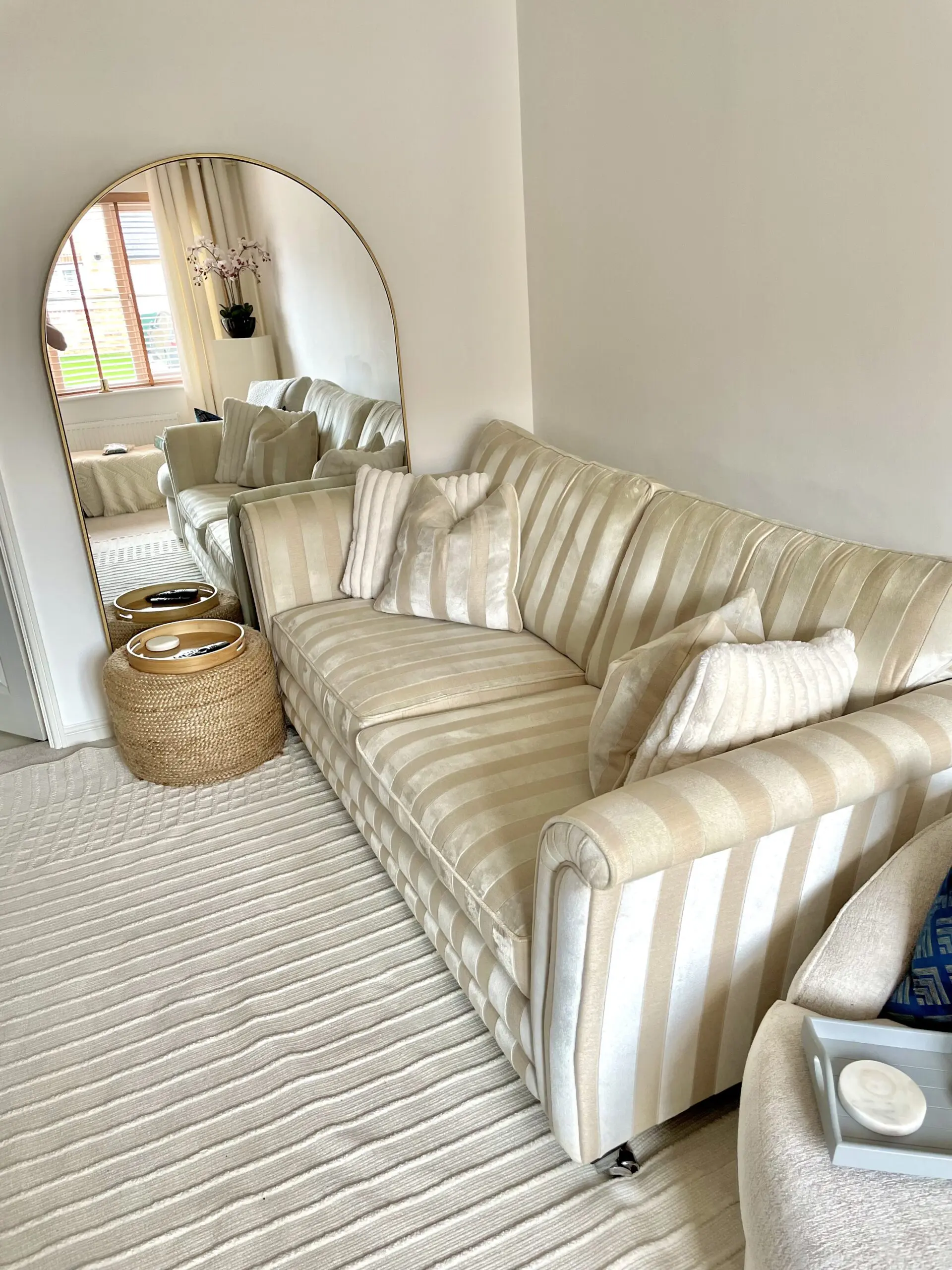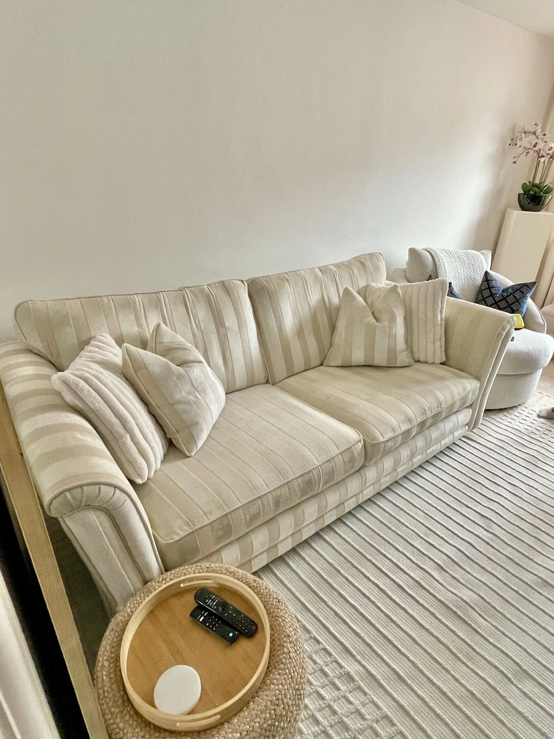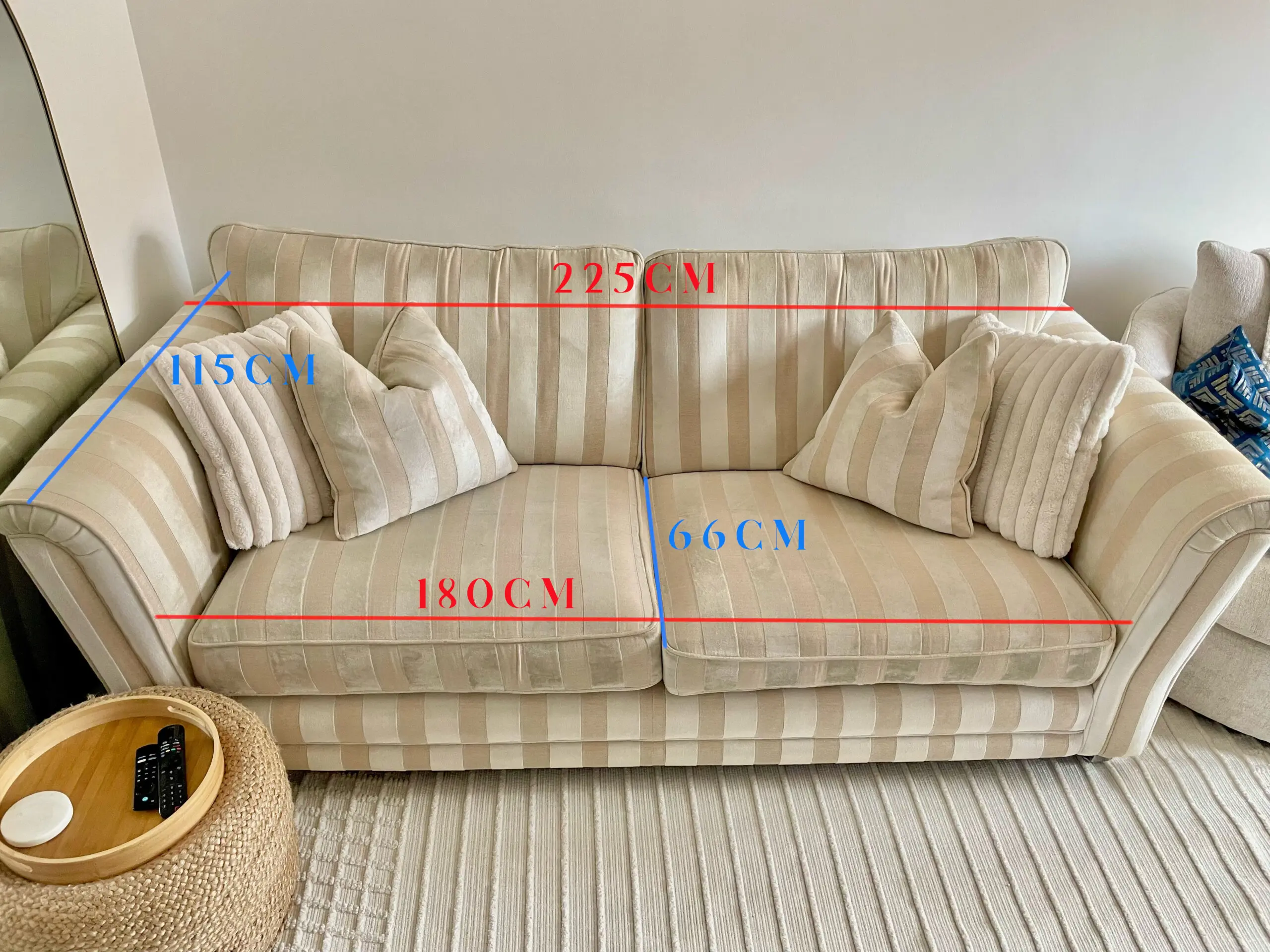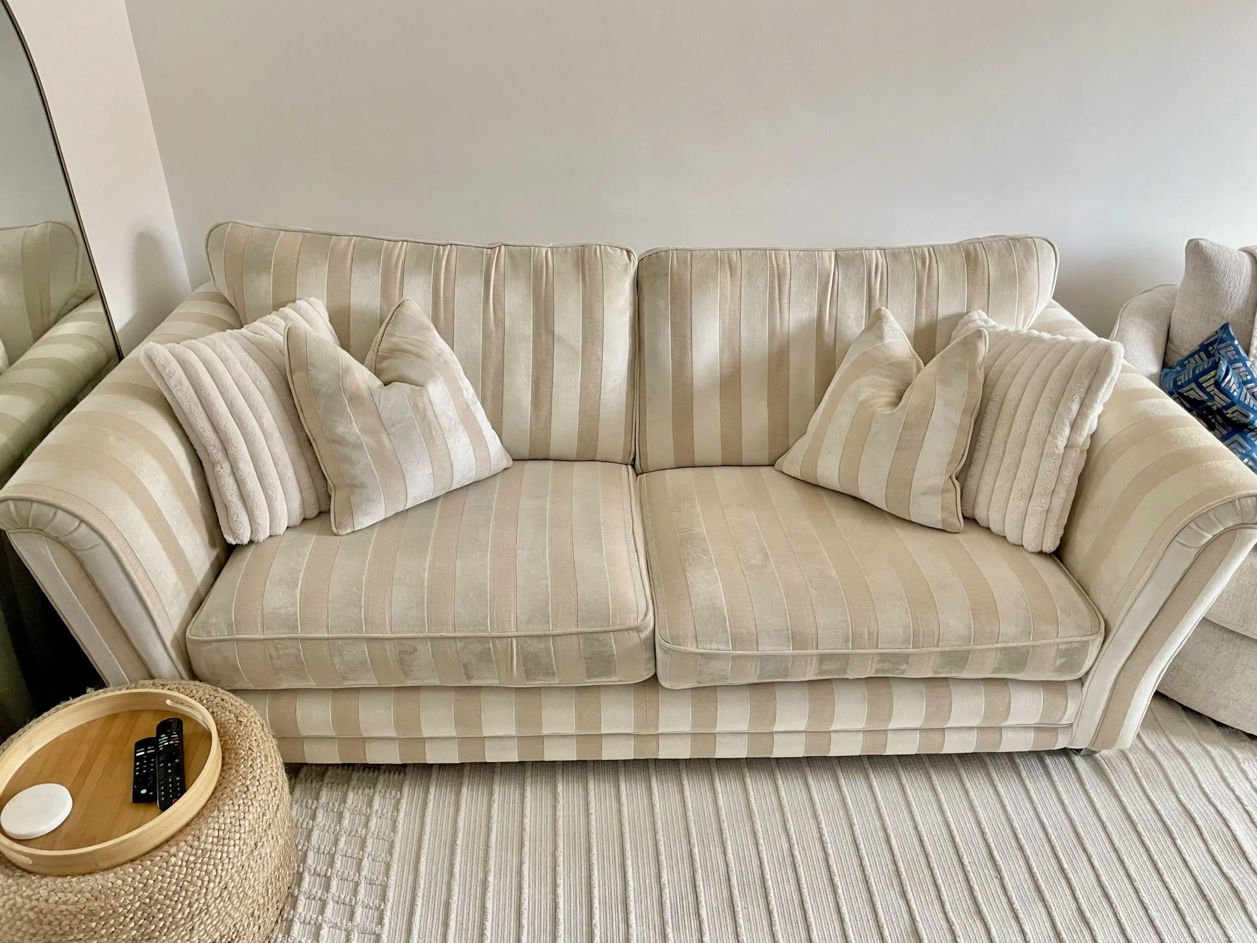 Original price was £1,000. Good condition. The fabric has no flaws / tears etc. Cushions are not giving way. Very comfortable. Won’t come across on the photo fully, but it’s got a lovely sheen to it due to the fabric. Comes with the two matching feather cushions.