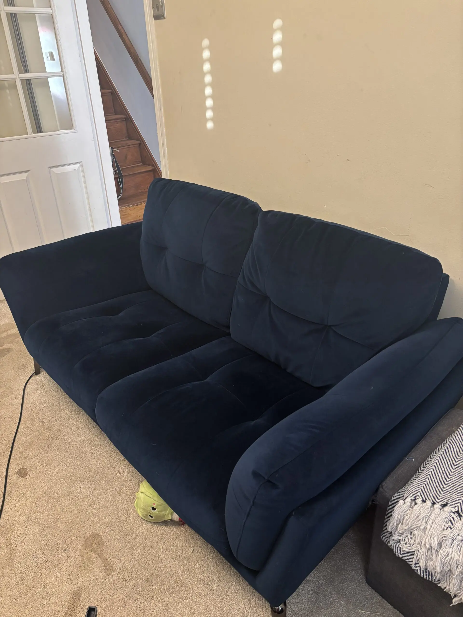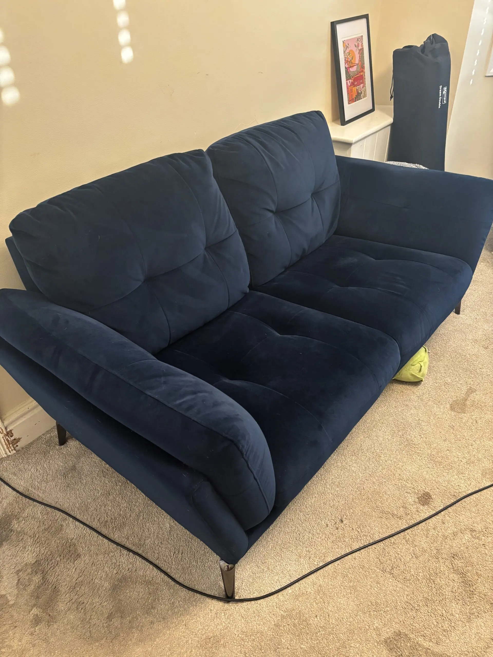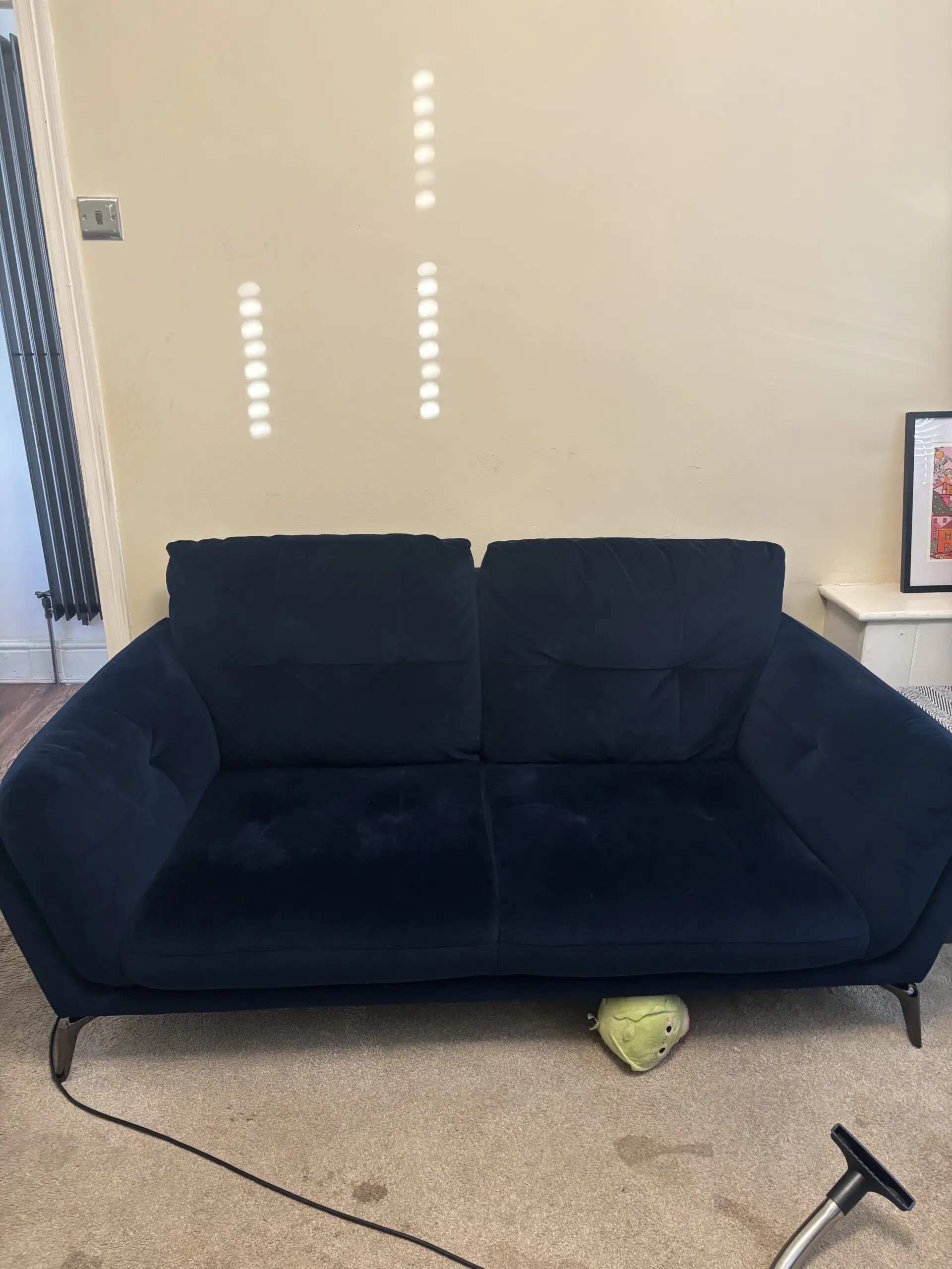 DFS Blue Harlan Velvet 2 Seater Sofa. 2 Years old but barely used. Does come from a house with pets. Will be cleaned using Shark sofa cleaner.