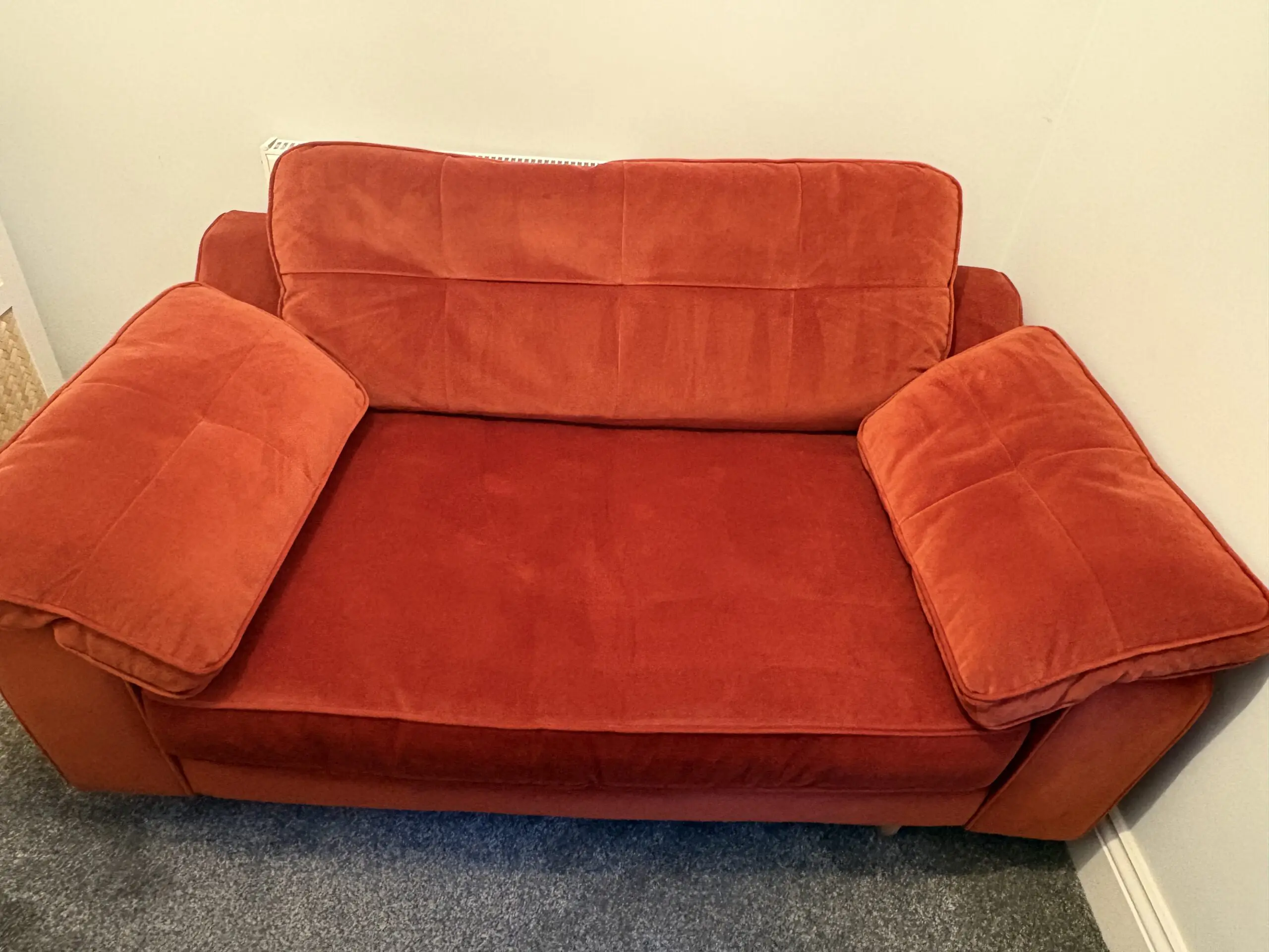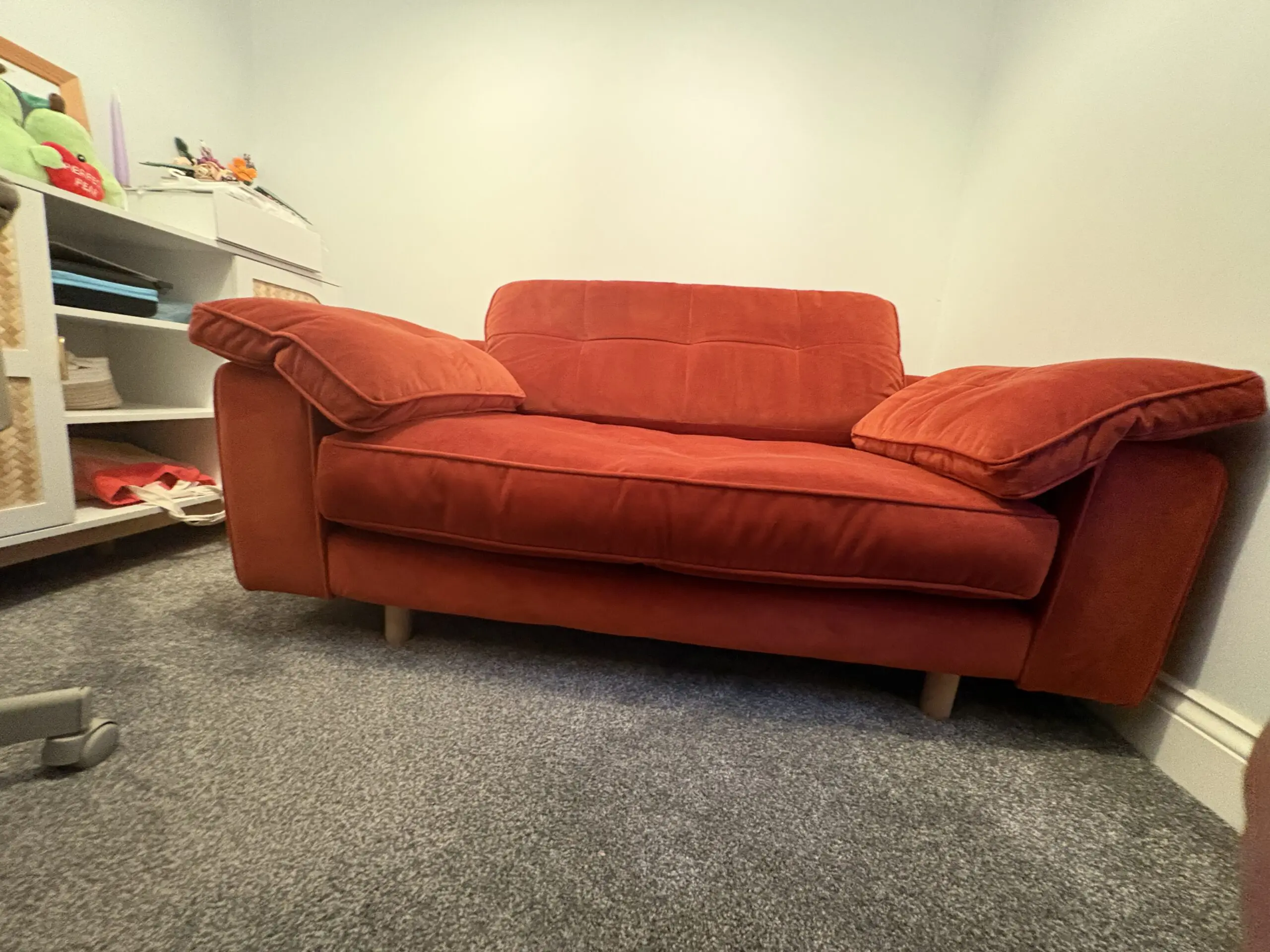 Great condition, burnt orange velvet cuddler sofa with 15 months remaining on DFS Sofa Care warrantee. Part of the DFS Grand Designs range, with tufted removable back, seat and side cushions. Removable feet (raw). Arms can be removed for delivery if needed or for small spaces. A great addition to an office, small living room or student accommodation. Fairly light and easy to move.