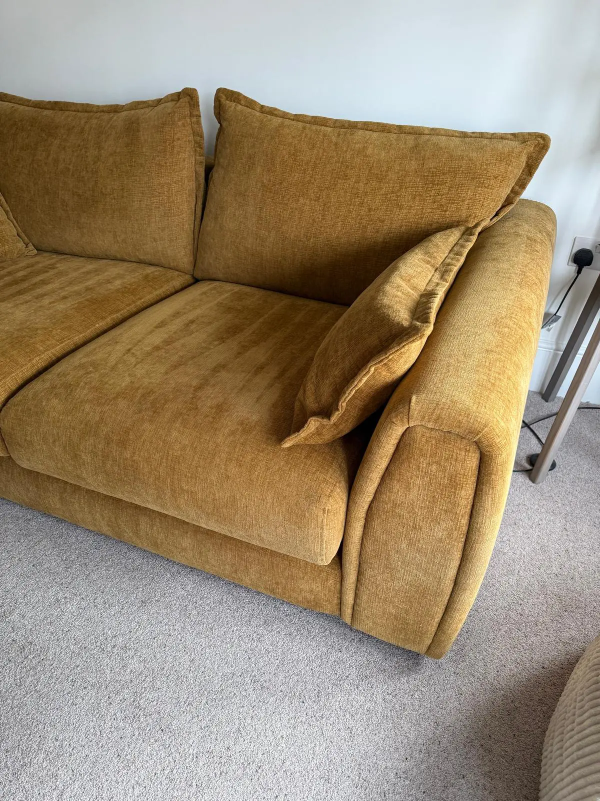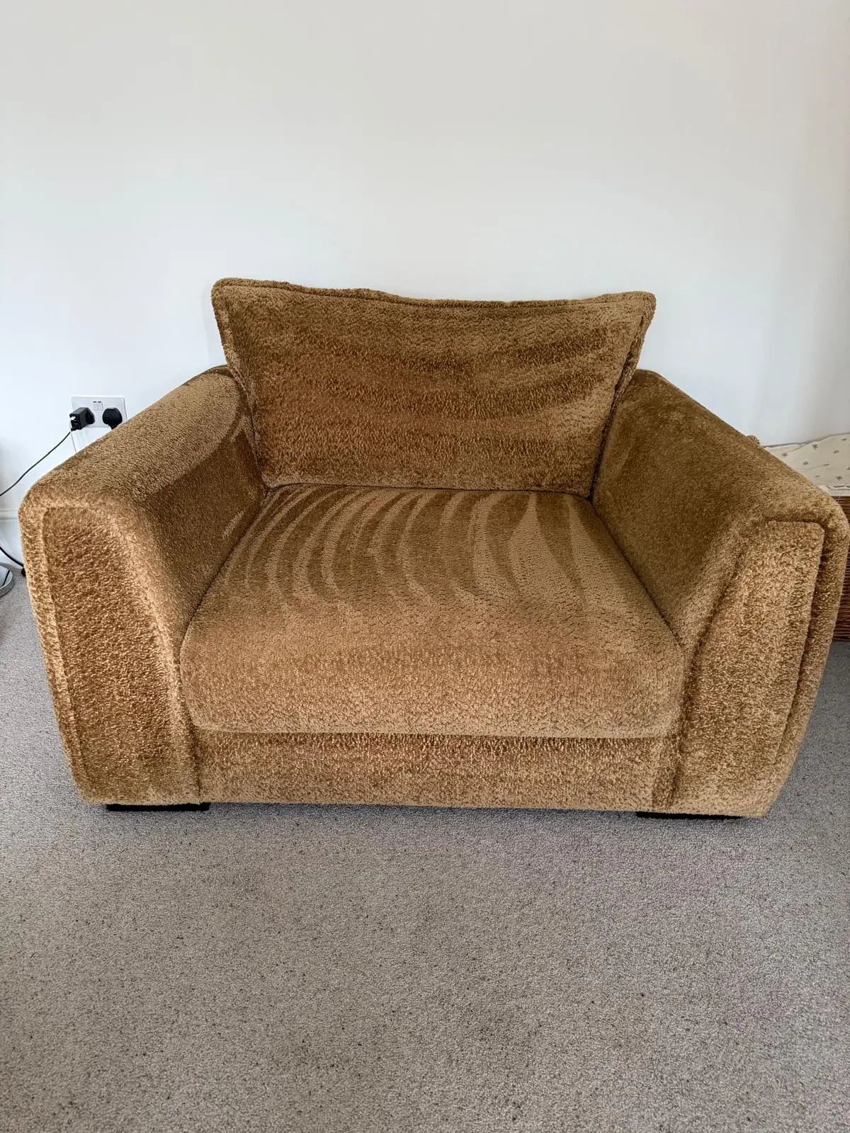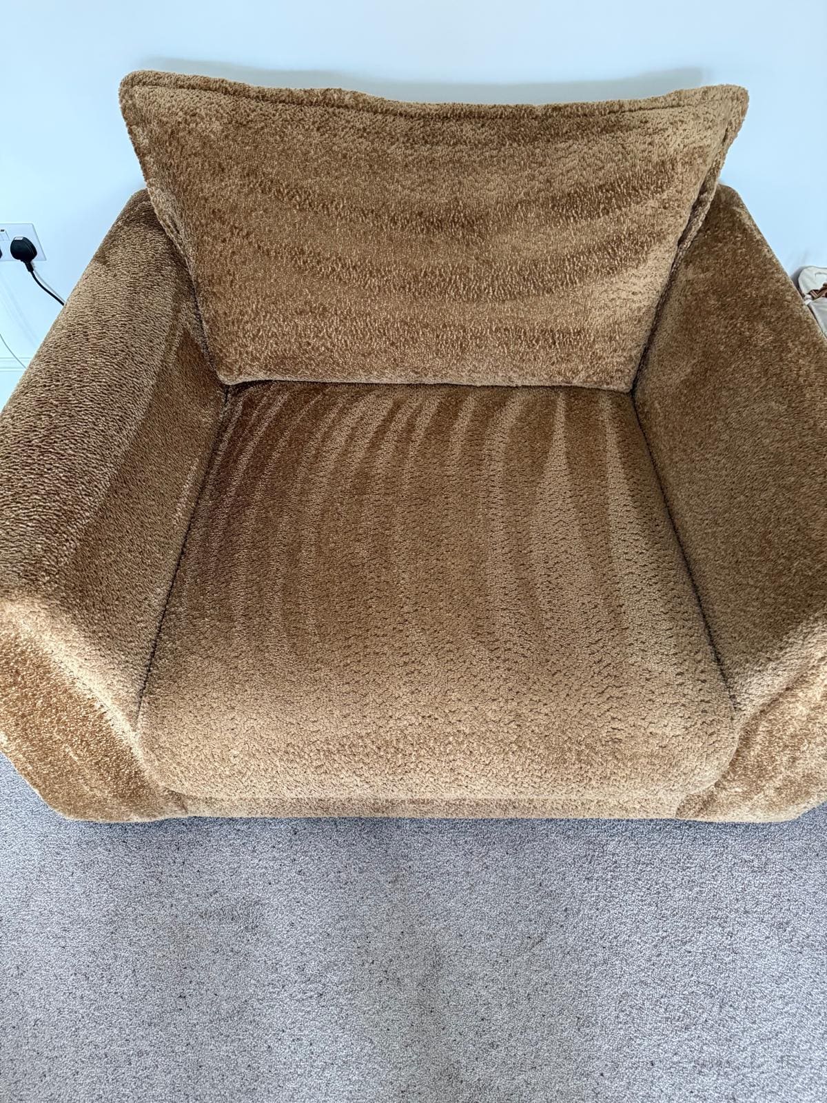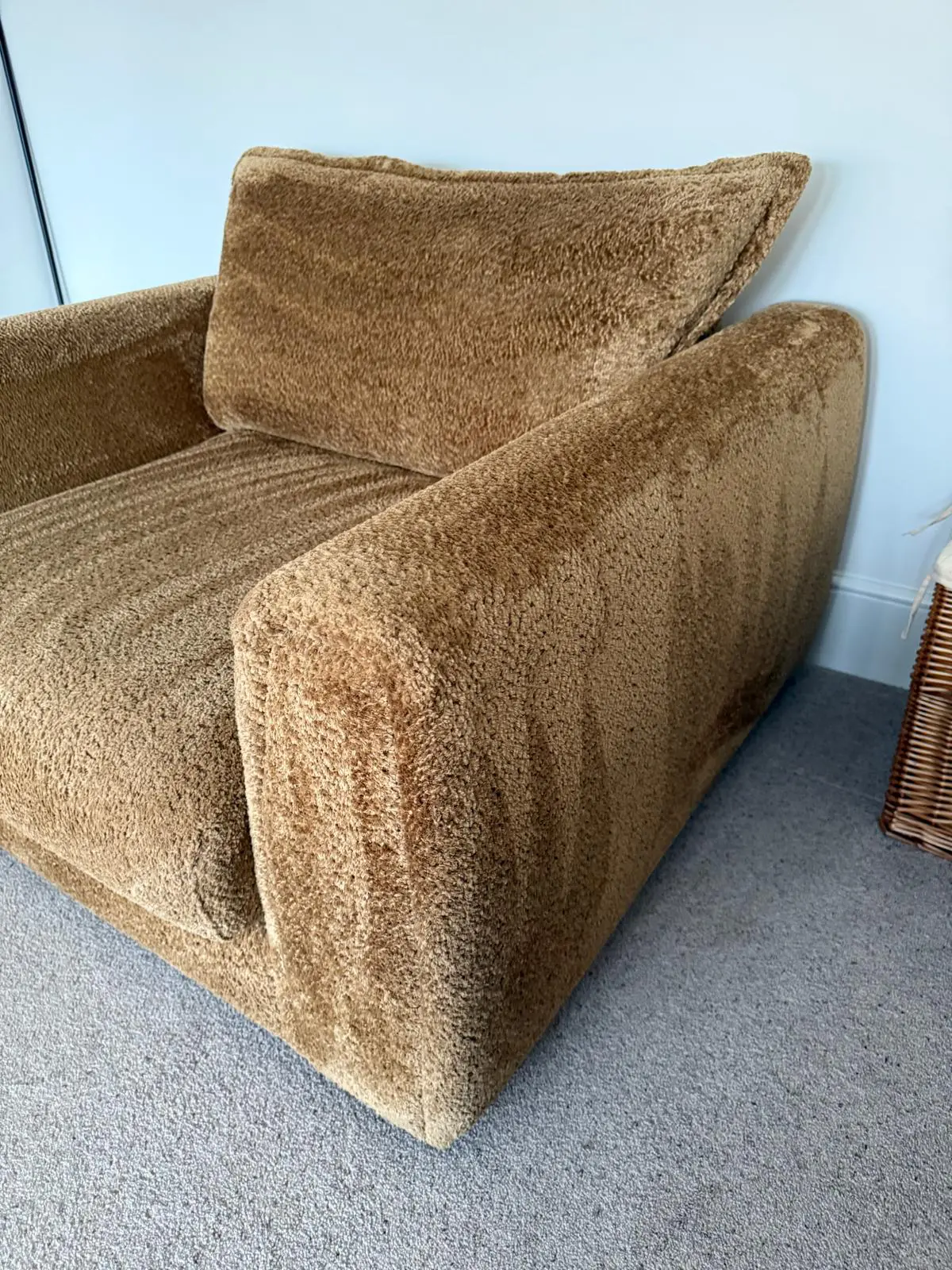 2 Seater Setee in cinnamon is upholstered in a thick, luxurious chenille – a short pile fabric with smart woven texture, the large armchair in bronze is a soft and fluffy teddy fabric woven from chunkier yarn. The cushions are foam for a more supportive feel and the feet are dark wood.